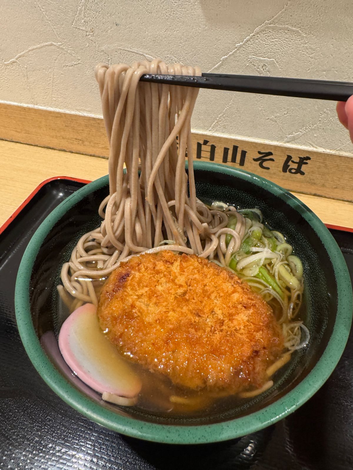 立ち食いそば屋のなかでも、特に定番のメニュー、それがコロッケそば。ということで「加賀白山そば」でもコロッケそばをオーダーしたのですが、これ、ただのコロッケそばではありません。能登牛コロッケそばです! なんかリッチな響き!!