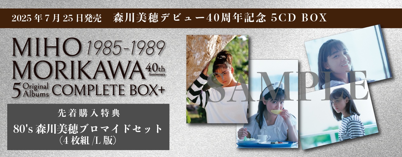 2025年7月21日にデビュー40周年を迎える森川美穂が、7月25日にヤマハSheet Music StoreからCD5枚組のCOMPLETE BOX『森川美穂 1985-1989 5 Original Albums COMPLETE BOX+』をリリースする。彼女の80年代の貴重な未公開カットをジャケットにしたパッケージで、ヤマハSheet Music Storeでは本日から予約が開始となっている。