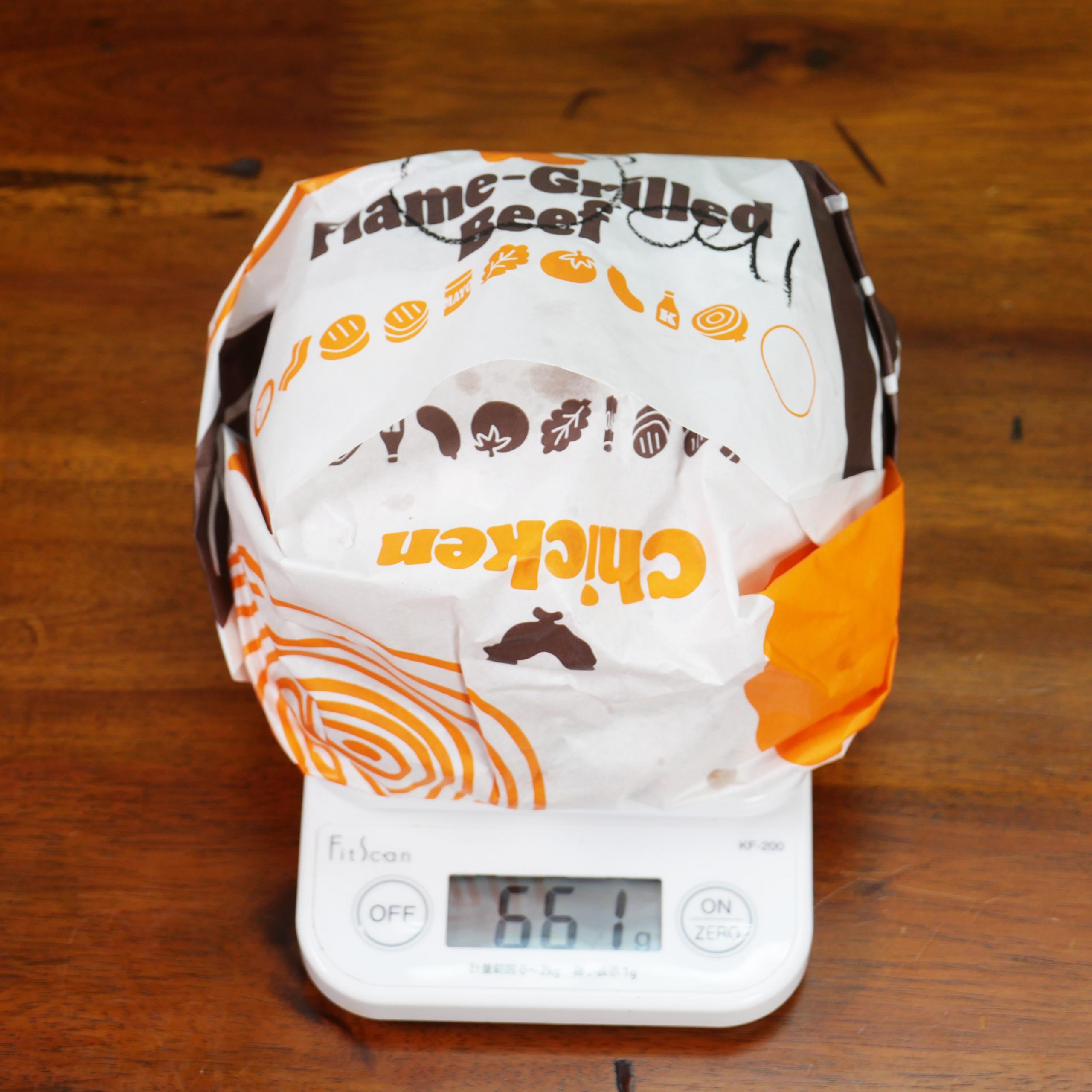 試しに重量を調べてみると、ななななななんと、661グラム! バーガーラップの重さが10グラムほどあるとしても、600グラム以上の大容量は間違いない!