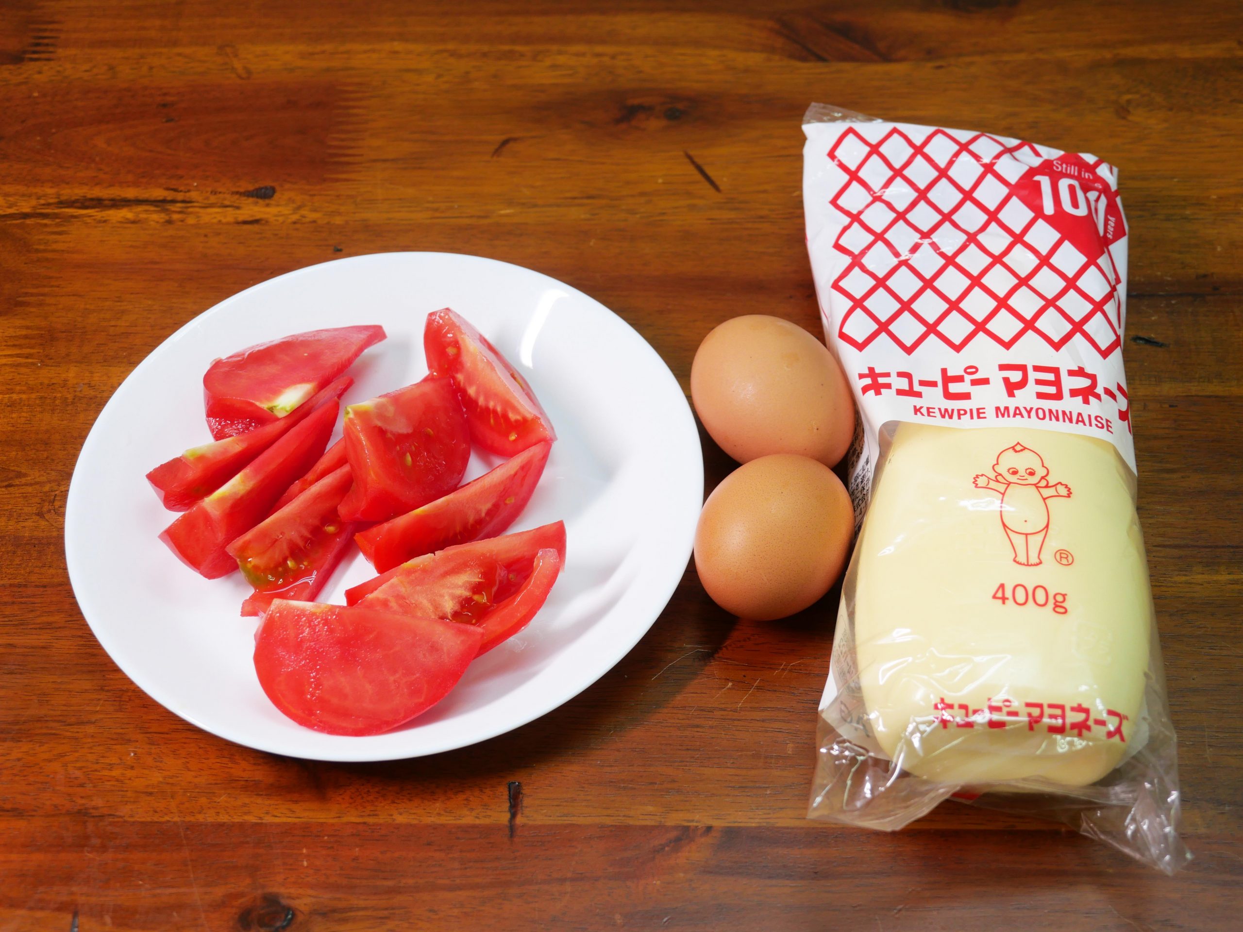 マヨネーズ(大さじ1)をフライパンで火にかけ、マヨネーズ(大さじ1)を混ぜ合わせた卵を半熟状まで加熱したらトマトを加える。さっと炒めて塩で味を調えたら完成。