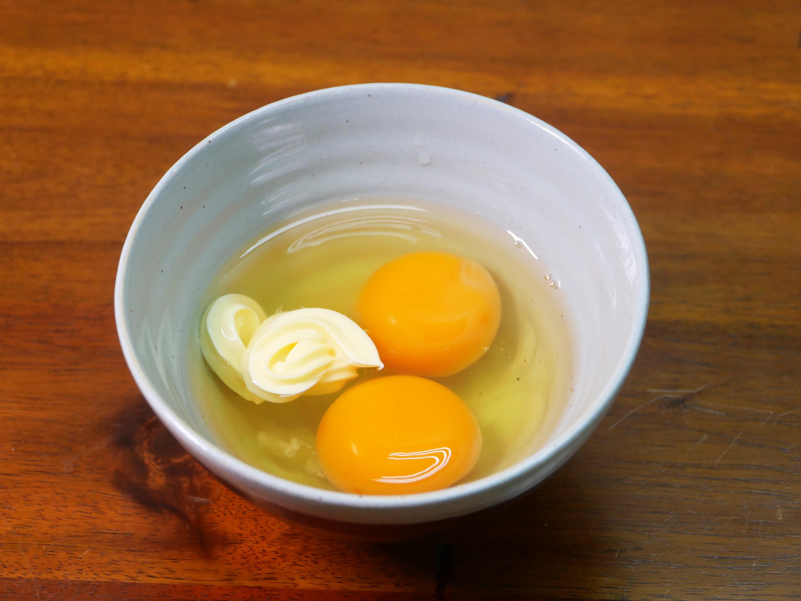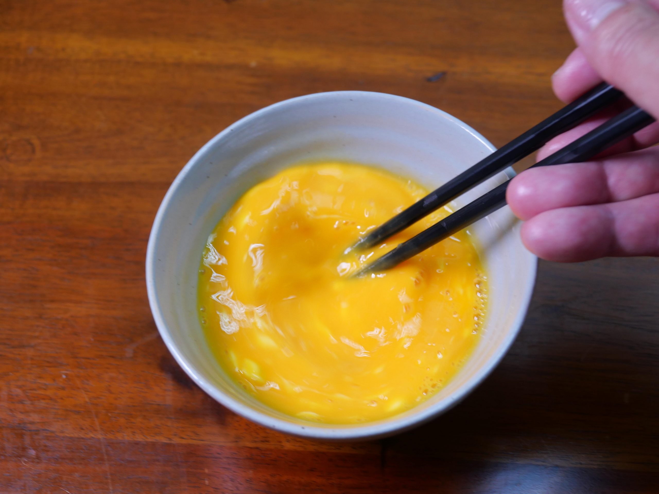 マヨネーズが御酢のかわりにもなっているのか、生卵のクセがきえていて、あっさり爽やかな仕上がりに。さらにマヨネーズは塩味としても活躍してくれるから、仕上げに入れる塩が少量で済みました。