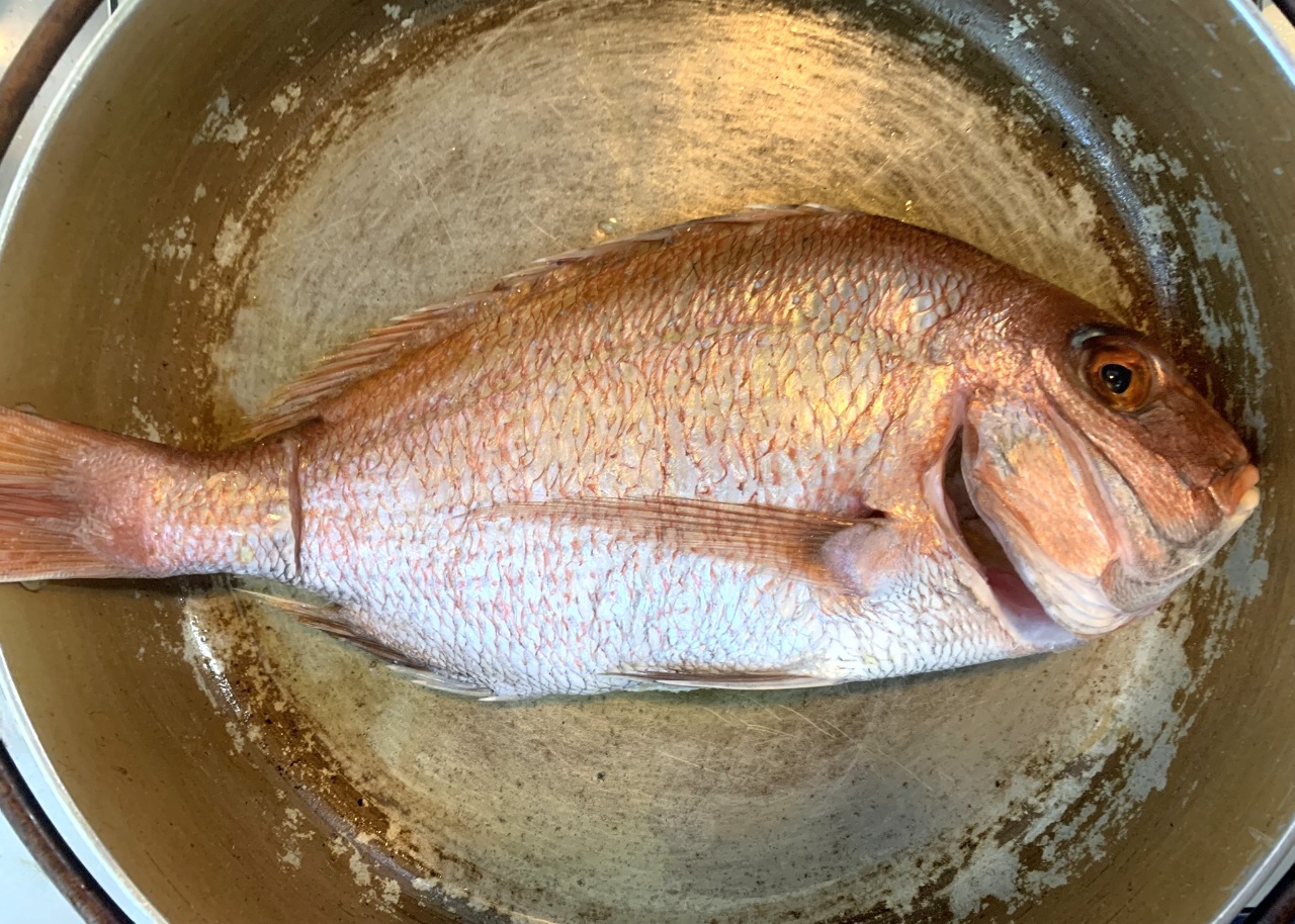 ▲鯛が大きくフライパンに収まらなかったので鍋に変えました。