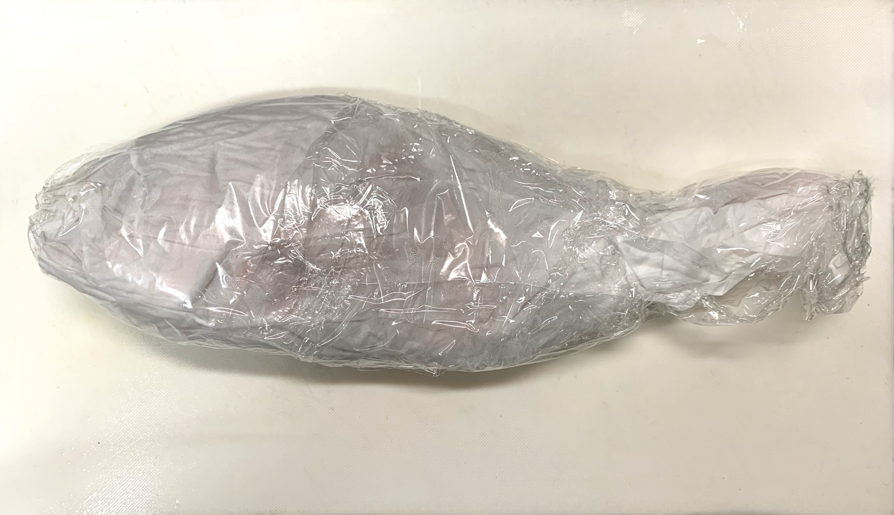 エラと内臓をとり、水気を切ってからお腹にキッチンペーパーを詰め、体全体をキッチンペーパーでぐるぐる巻きにした後、ラップで包みます。