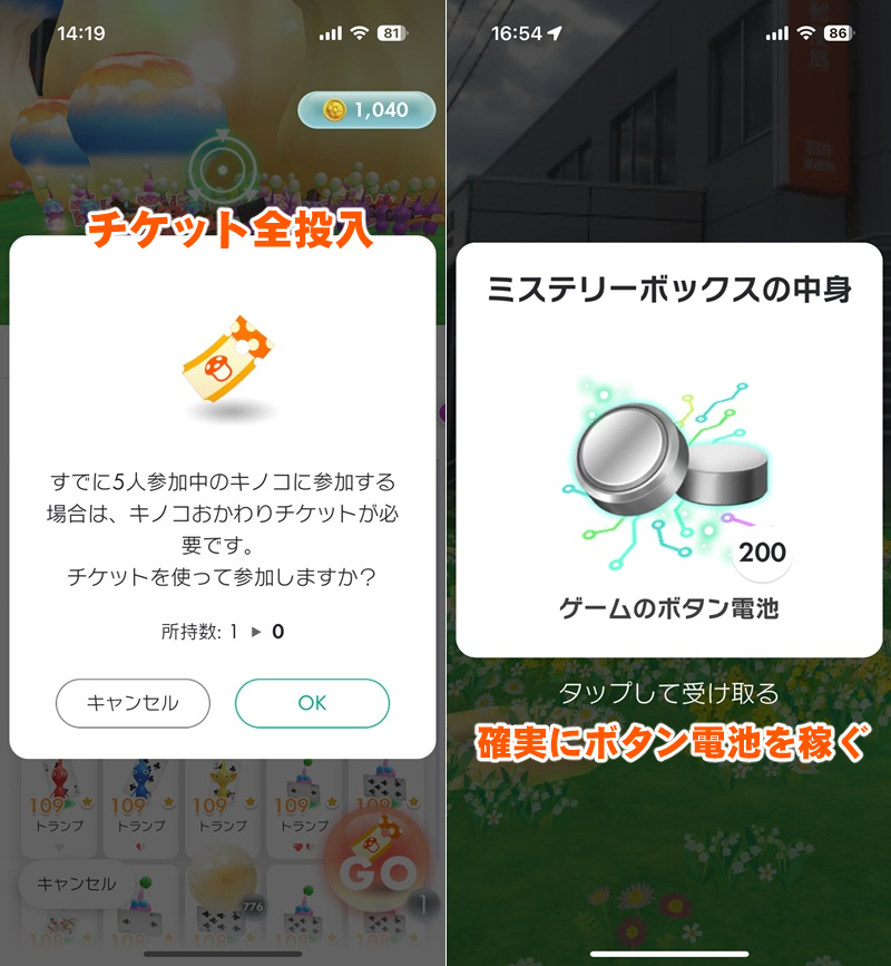 “ふつうの色鮮やかなキノコ”のほうがトランプの苗を狙いやすいが、それだと“ゲームのボタン電池”が稼ぎにくい。