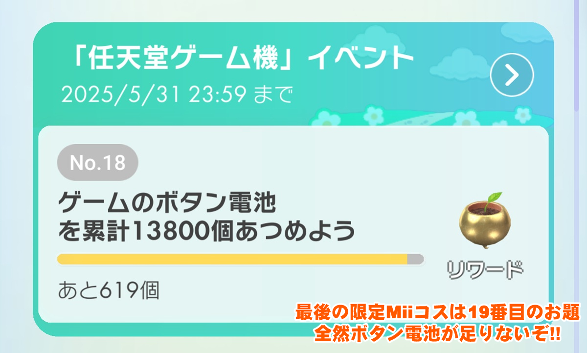 しかし、運よく手元に“キノコおかわりチケット”が3枚あり、1日3回の無料分を含めてすべてを“巨大な色鮮やかなキノコ”に投資すれば、ギリギリ最後の限定Miiコスチュームに届きそう。