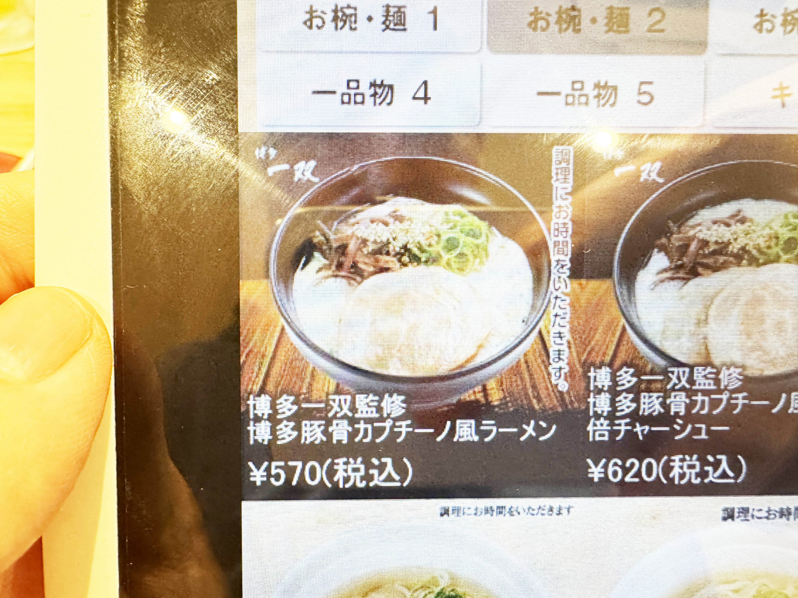 いくつか監修ラーメンには種類がありましたが、いちばんオーソドックスな感じの「博多一双監修 博多豚骨カプチーノ風ラーメン」(税込570円)をオーダー。そんなに待つことなく監修ラーメンが流れてきました。早い!
