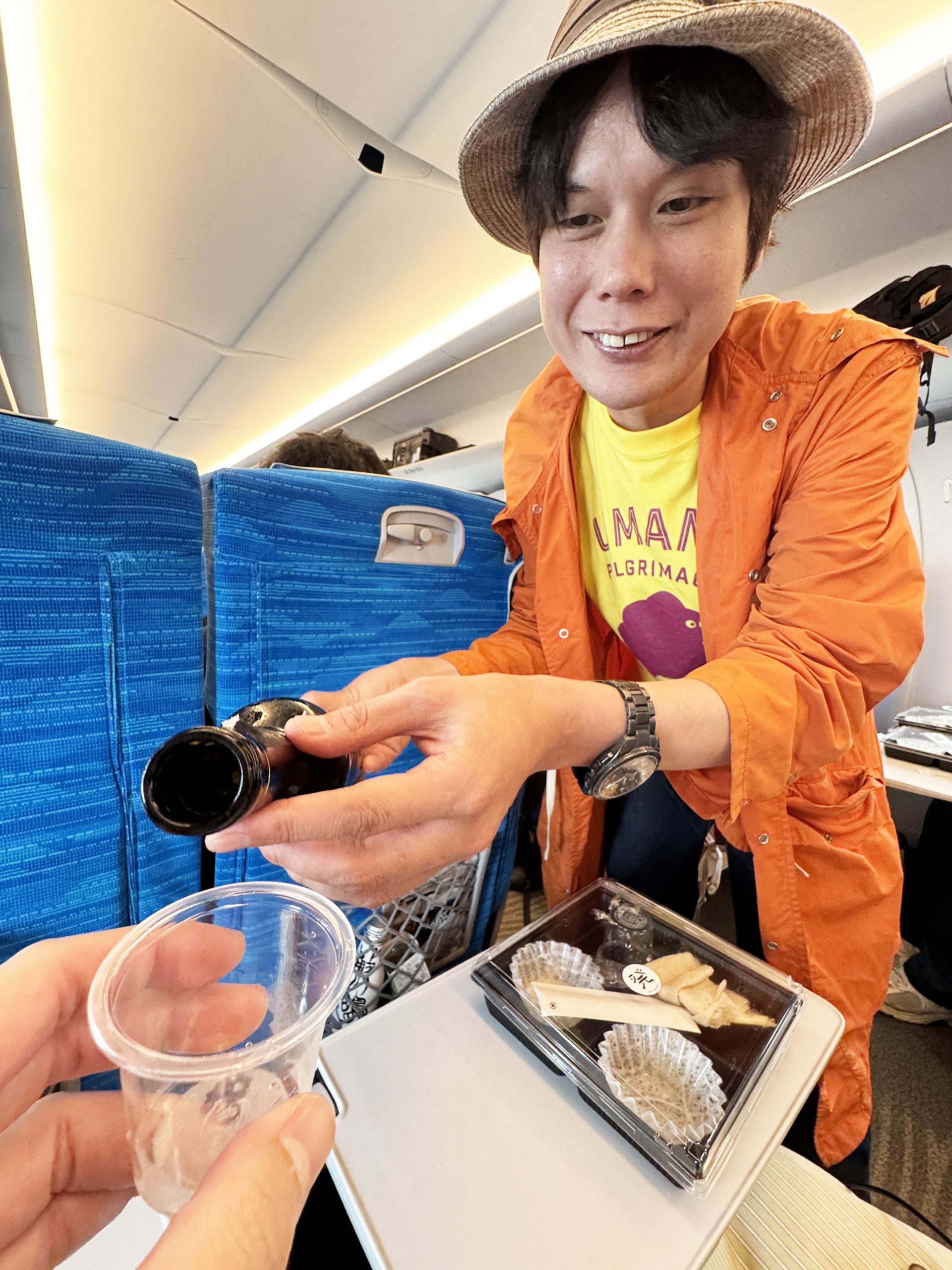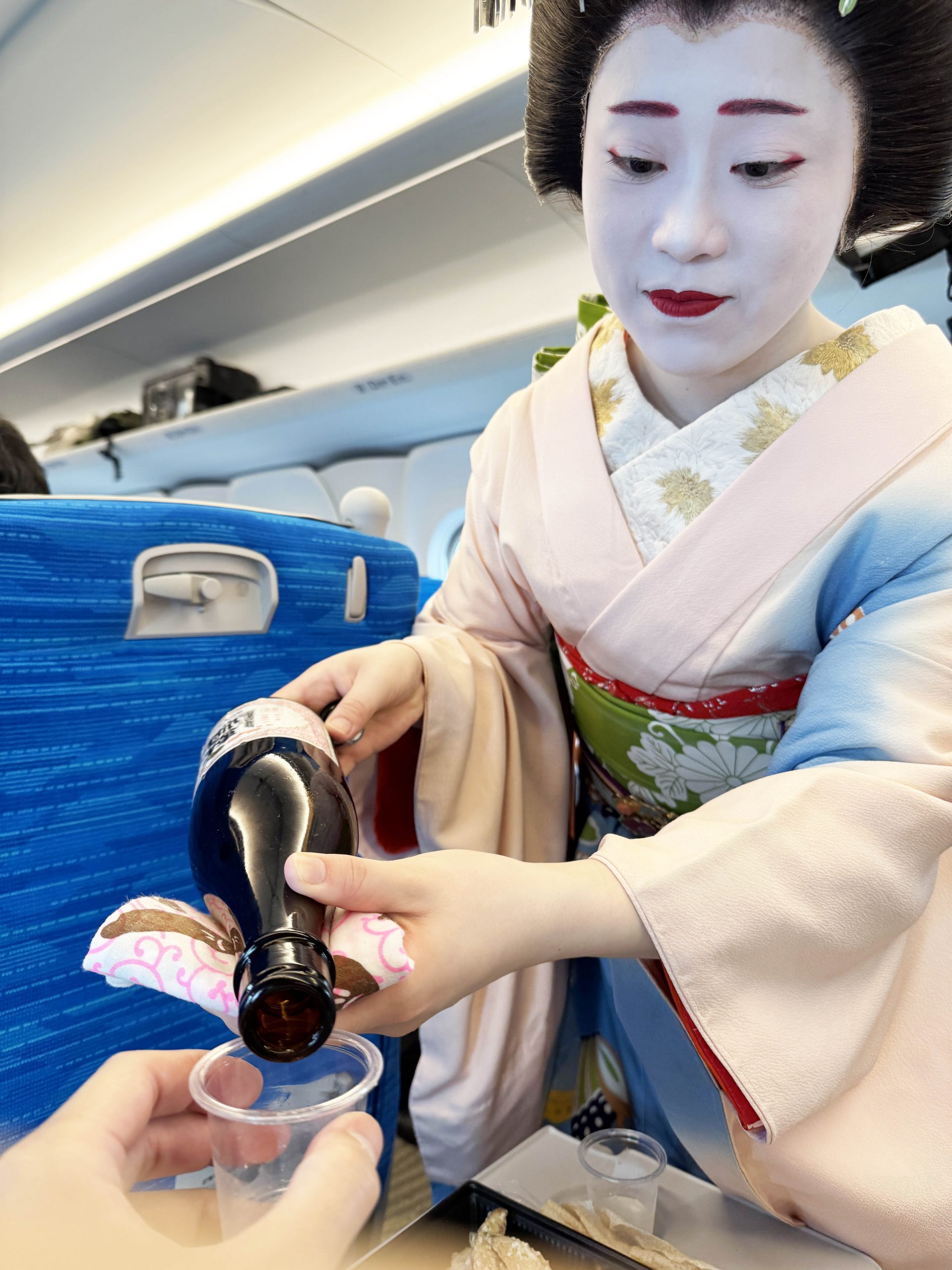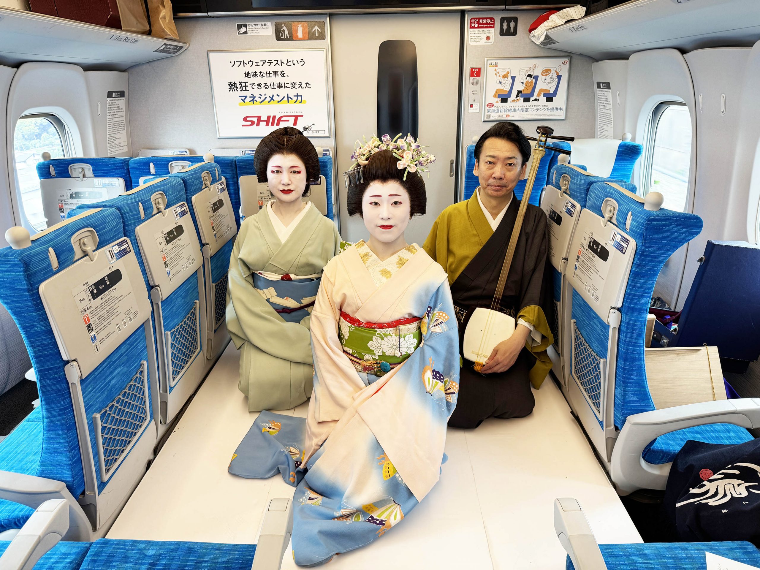 新幹線に乗ったら、芸者さんたちがどんどん日本酒を注ぎに来てくれたんですよ。車内販売じゃあなくて、芸者さんです。そんなことある? 初めての経験。
