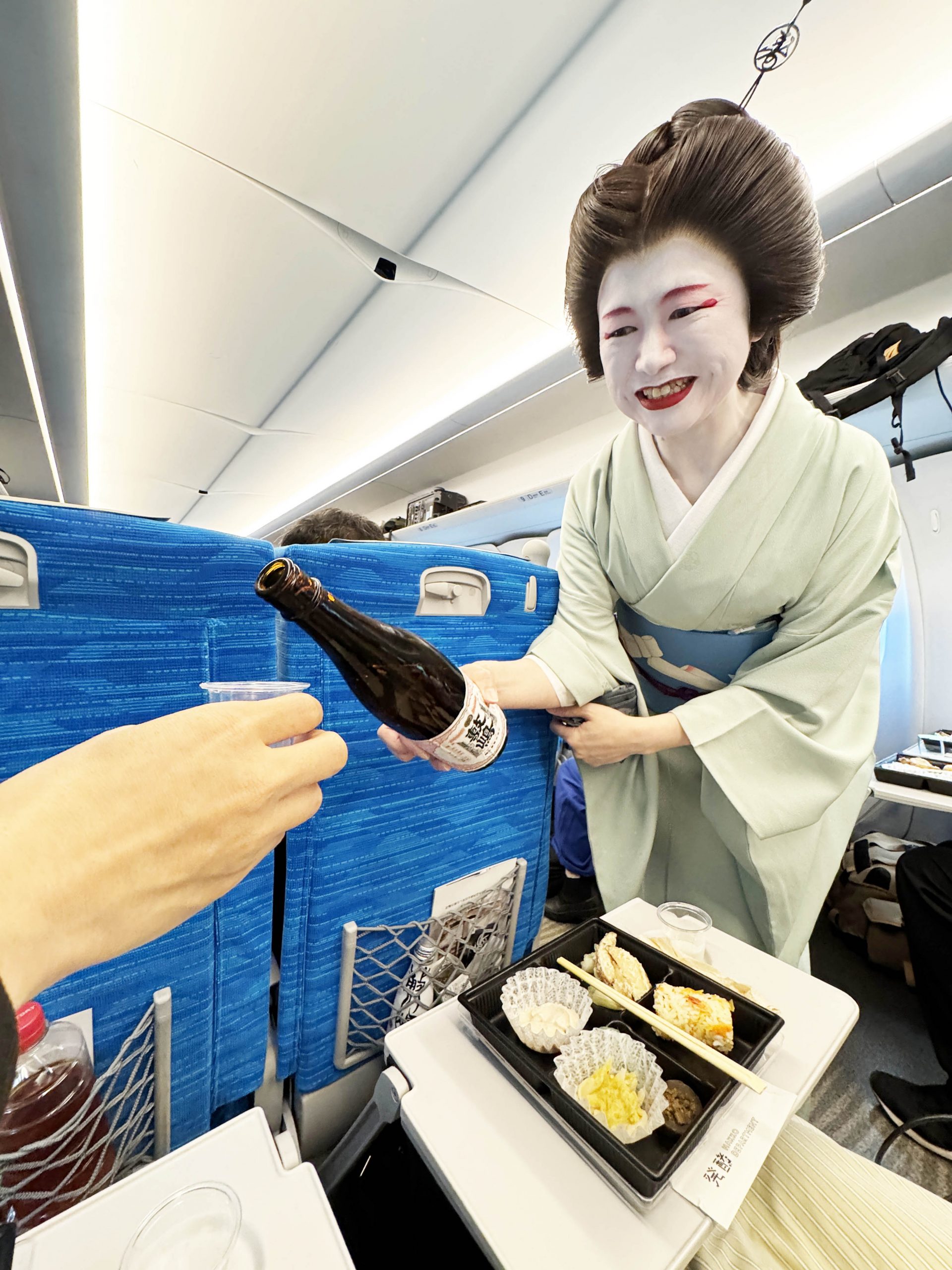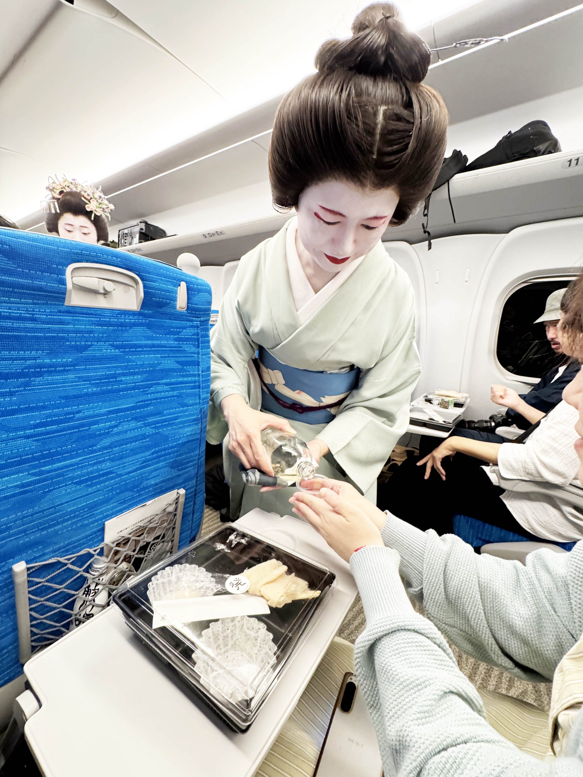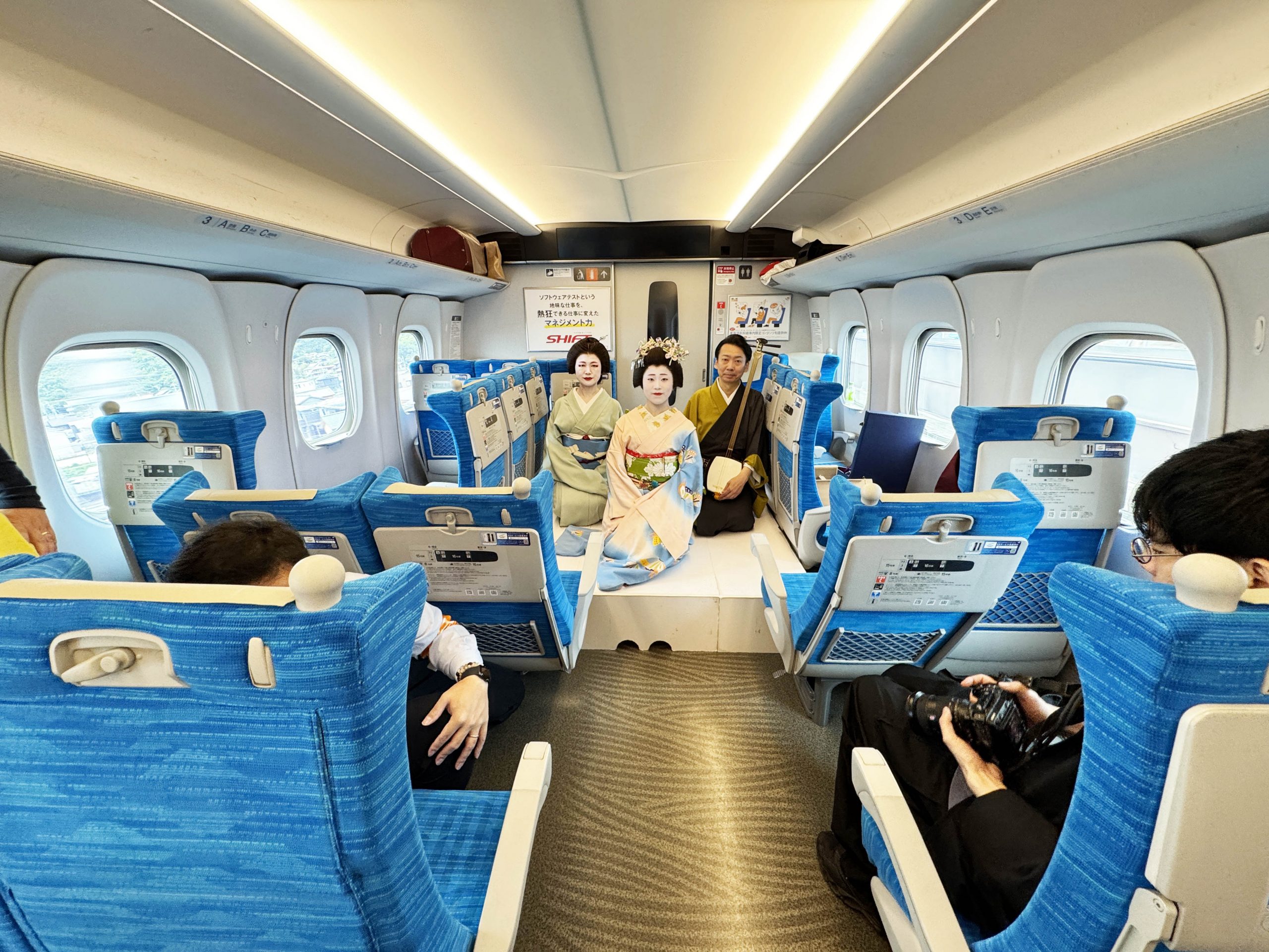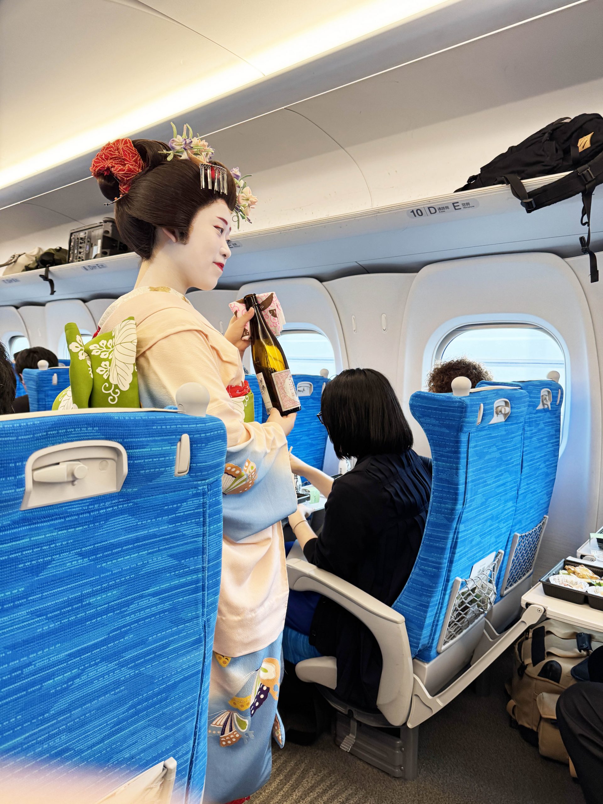 新幹線に乗ったら、芸者さんたちがどんどん日本酒を注ぎに来てくれたんですよ。車内販売じゃあなくて、芸者さんです。そんなことある? 初めての経験。