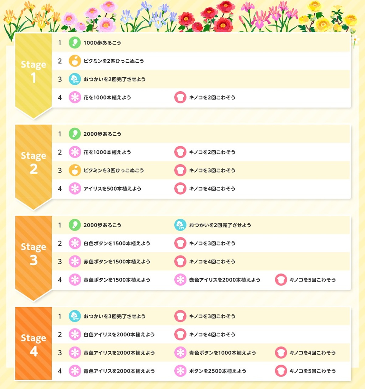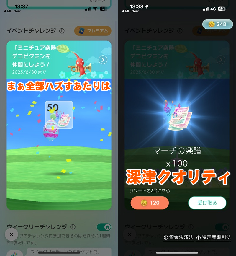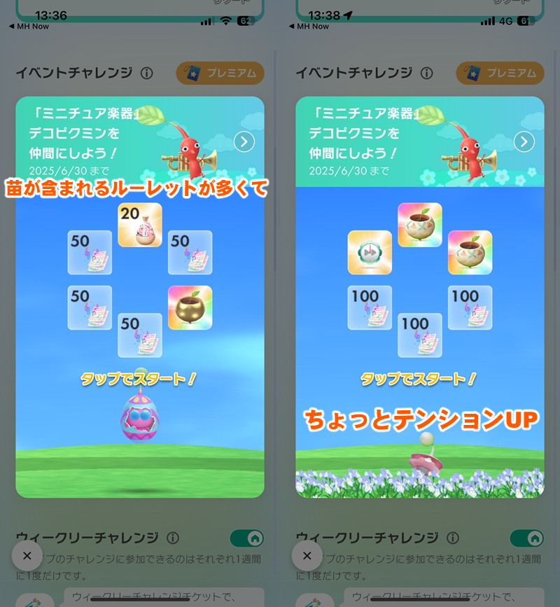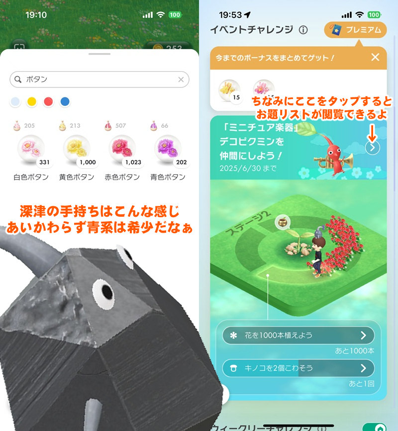 そんなわけでここからは音楽祭イベントの要であり、ミニュチュア楽器を身に着けたデコピクミンを集めるための本ルート“イベントチャレンジ”の全お題を紹介。
