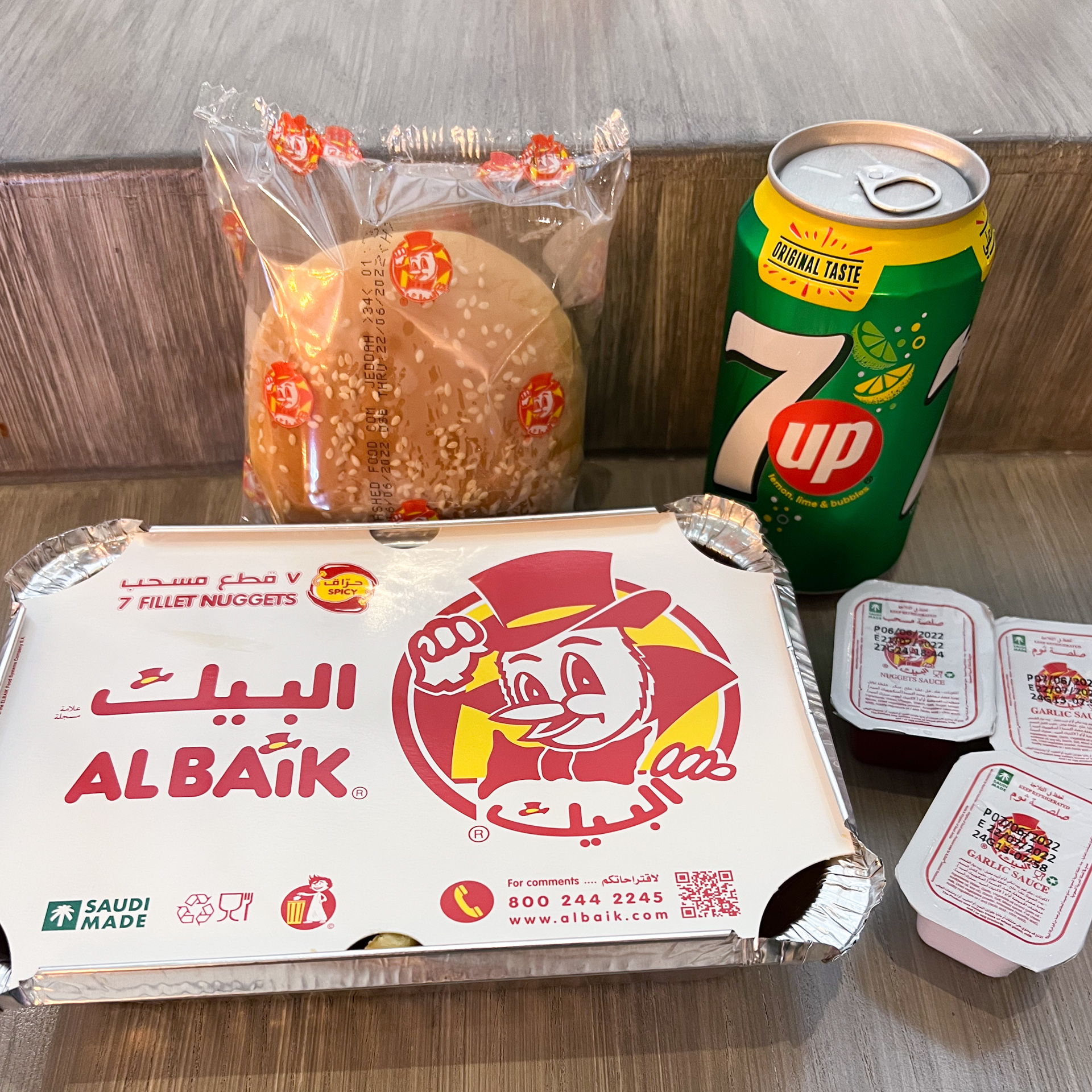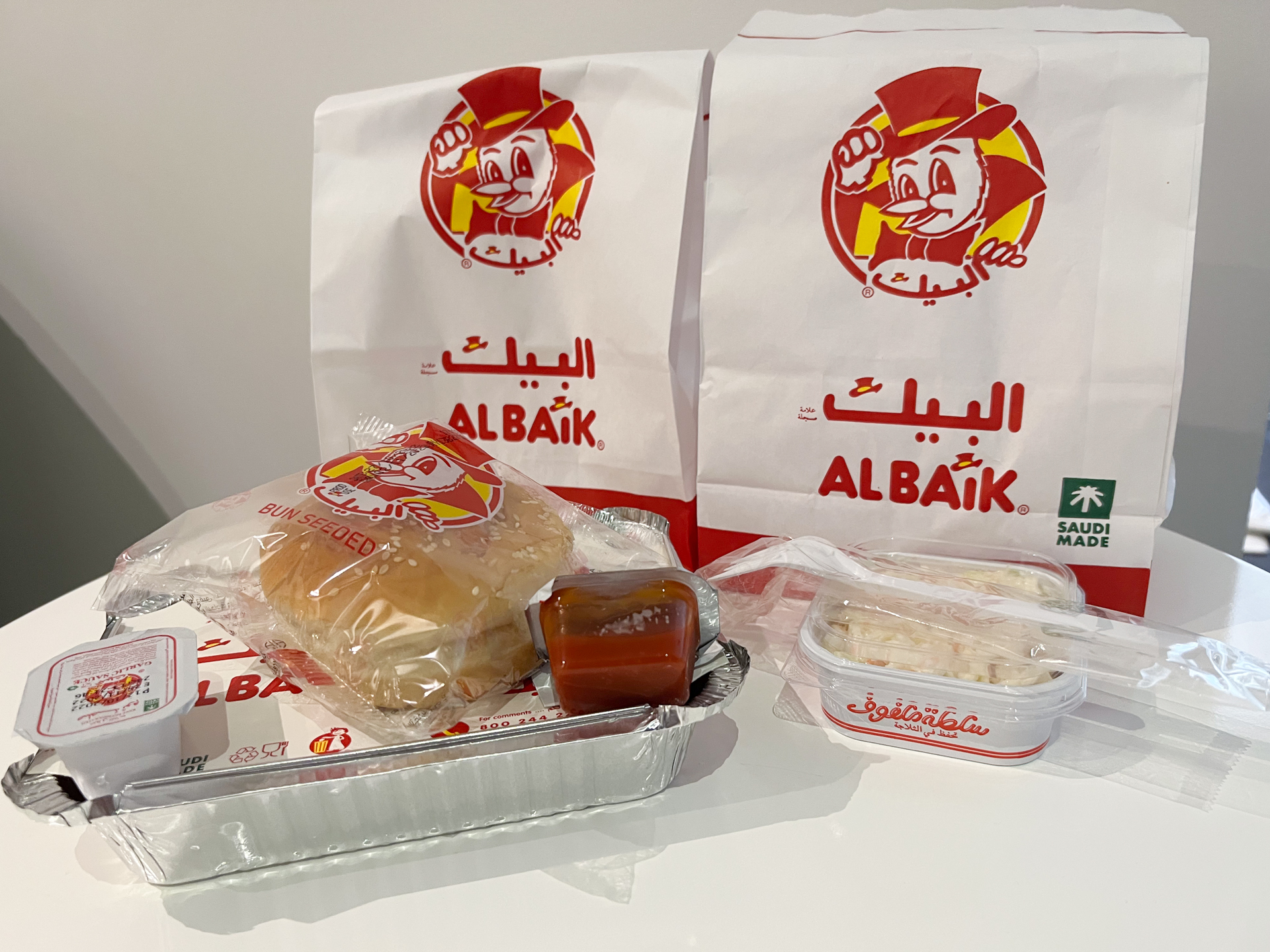もちろん、普通のフライドチキンもしっかり美味しい。骨付きフライドチキン(4ピース)+ポテト+パン+ガーリックソース+ピクルスがセットも捨てがたい。店に肉の産地、もちろんサウジアラビア国内は「サウジ産の鶏肉」と原産地が書かれており、さらに西海岸のジェッダ(本店側)と首都のリヤドでは鶏肉の味が若干異なる?、という話が上がるのはサウジっ子やサウジ駐在の長い人たちの間ではよく交わされる話だ。