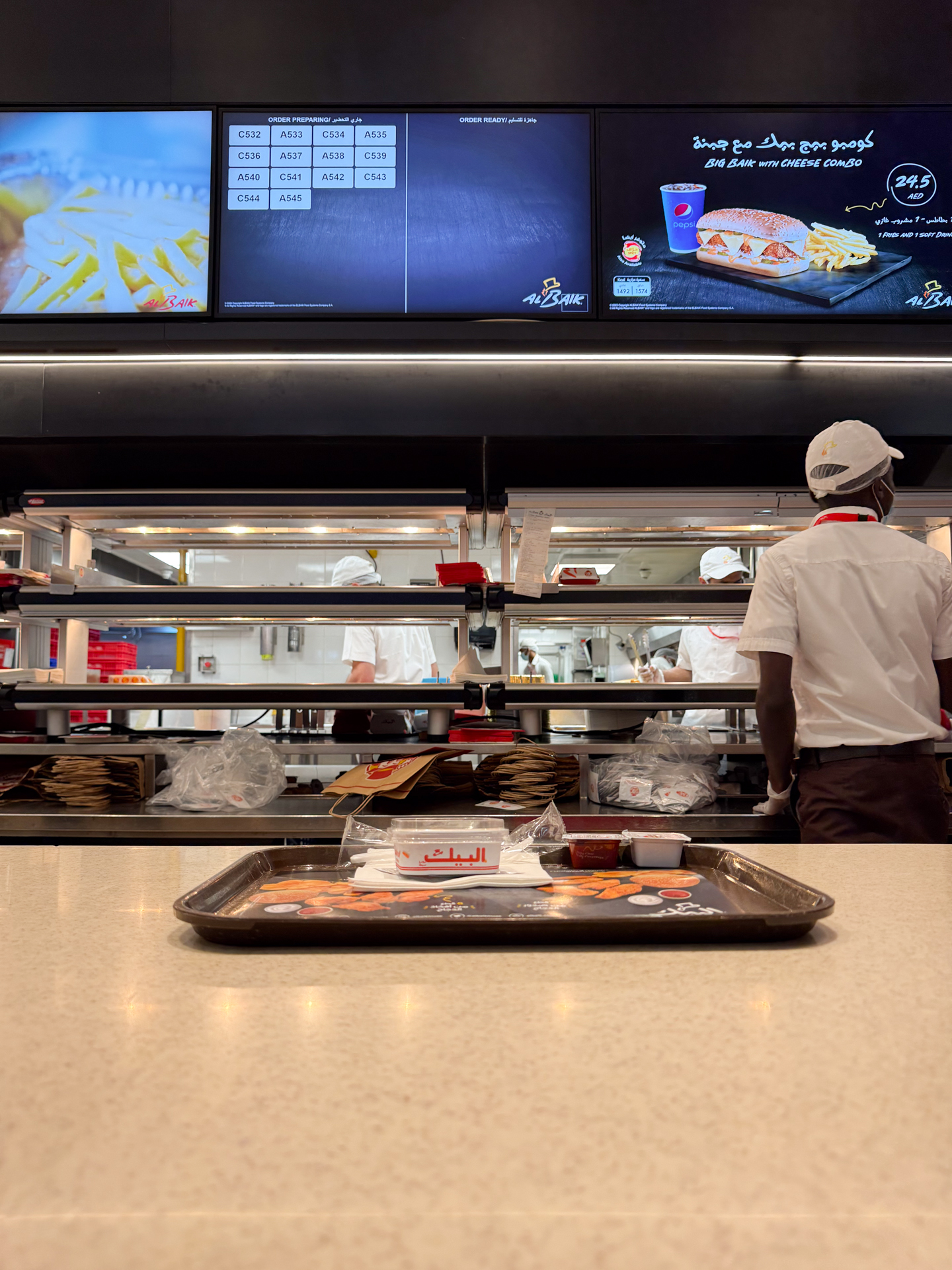 レジ前には家族連れ、忙(せわ)しないアラブ人の若いお兄さん、アルバイクを各家庭へ届けるべく待機するたくさんの配達員、観光客の欧米人と、実に多様かつ多国籍な顔ぶれ。誰もが等しくチキンにかぶりつくか、ナゲットでガーリックソースをすくっては次々と平らげます。
