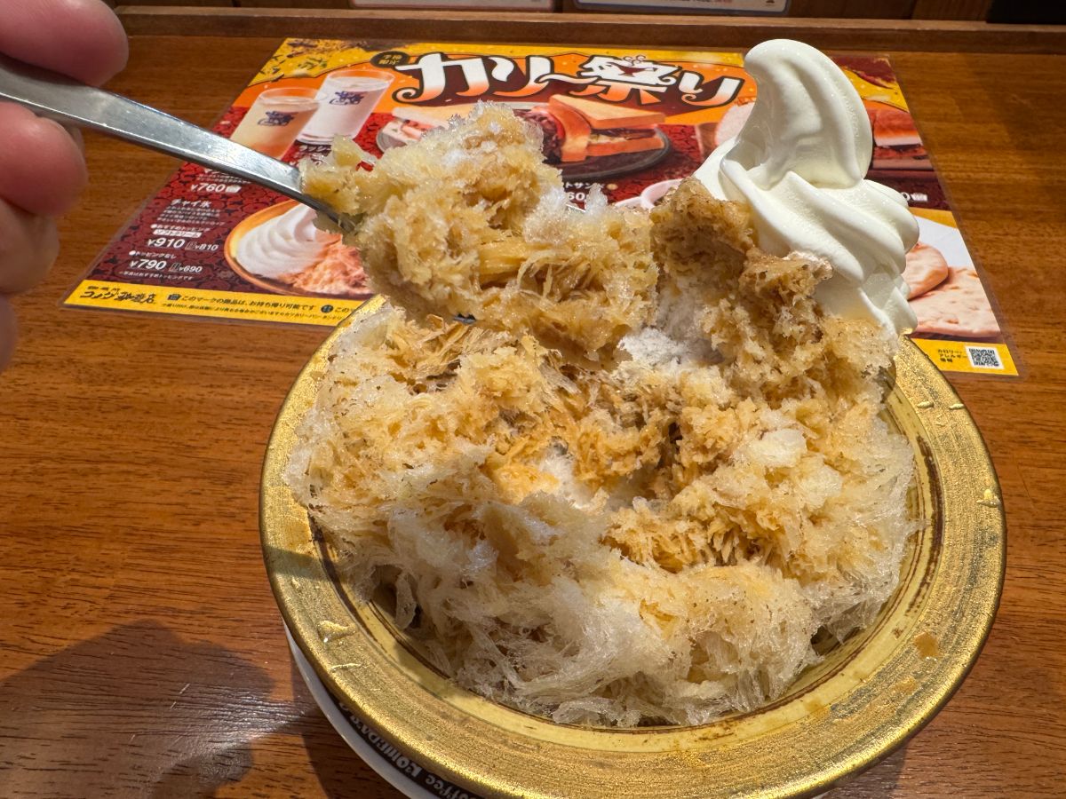 嬉しかったのは、カキ氷の内部まで、しっかりとチャイシロップが含まれていたこと。カキ氷を削り出しつつチャイシロップをかけ、食べ進めてもチャイを楽しめるようにしているのだろう。ありがたい構成だ。とことんインド感ある。ガチでインドすぎる。
