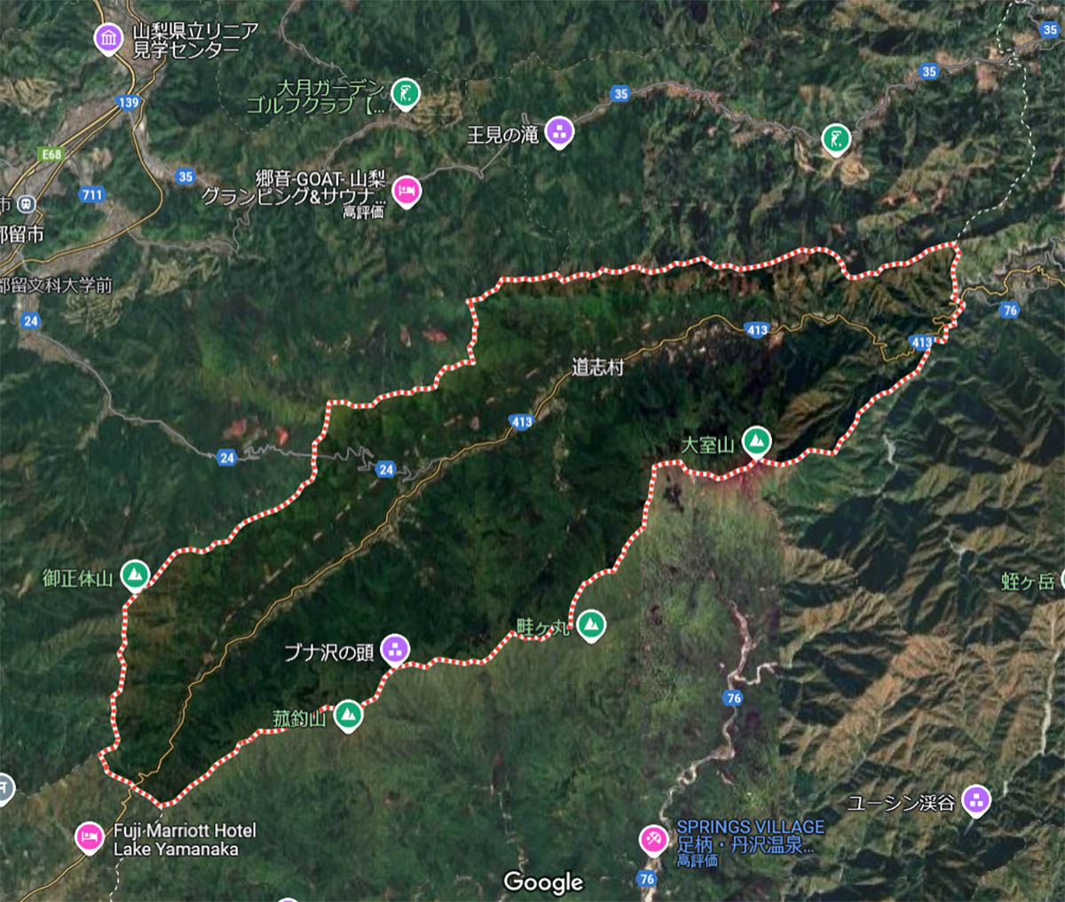「観光する皆様もぜひご利用ください」ともコメントしている道志村役場。GoogleMapsで見てみると、長い地形をしていて、国道413号沿いに自由たくや店舗があるようです。そして、広大で壮大な山々に囲まれた村でもあるようです。これは癒やしの村なのでは!?