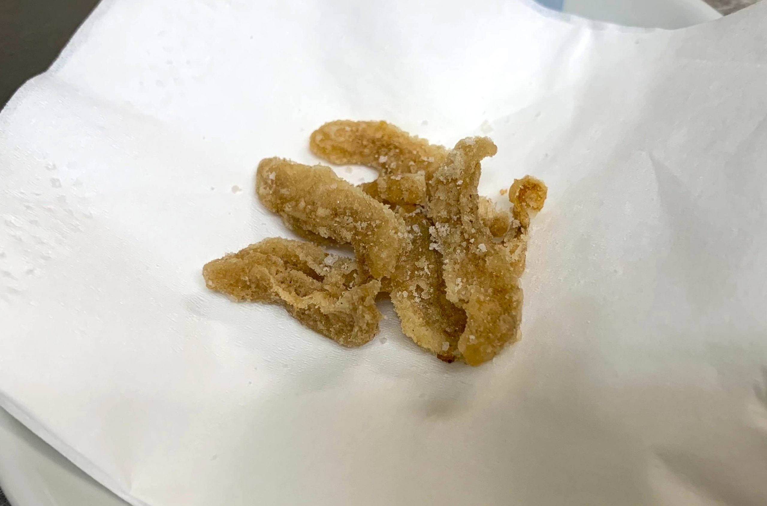 エラのまつげ部分に片栗粉をまぶして揚げ、塩をふってみました。