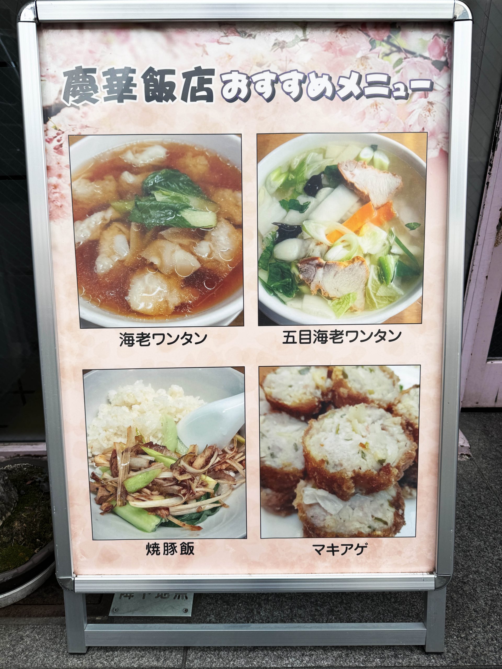 店内に入りメニューを見てみると、ありました! 慶華飯店の海老ワンタン! 看板メニューのひとつのようで、メニューのトップに載っていました。これは期待しかありません。すでに見本の写真からしておいしそうです。