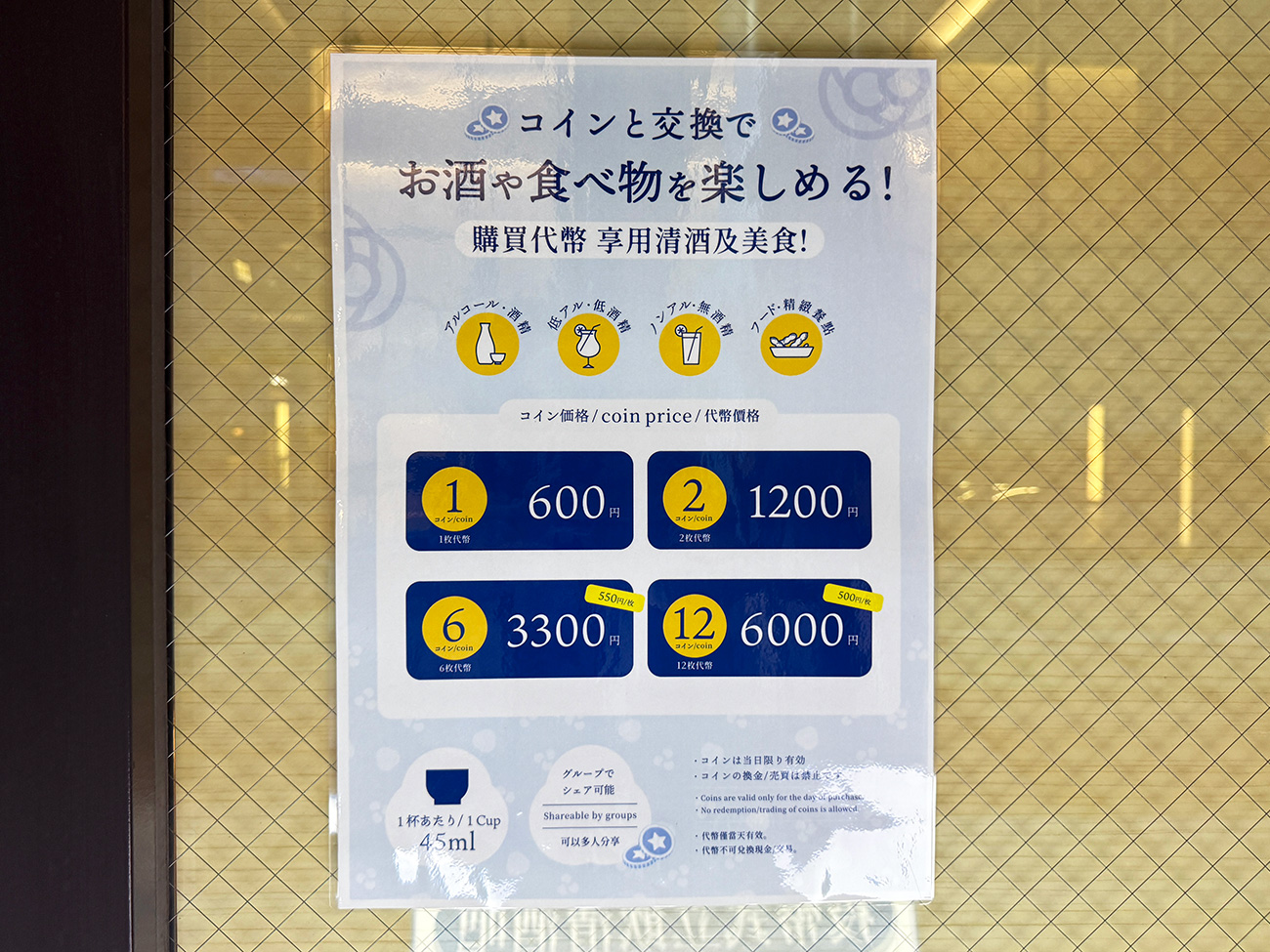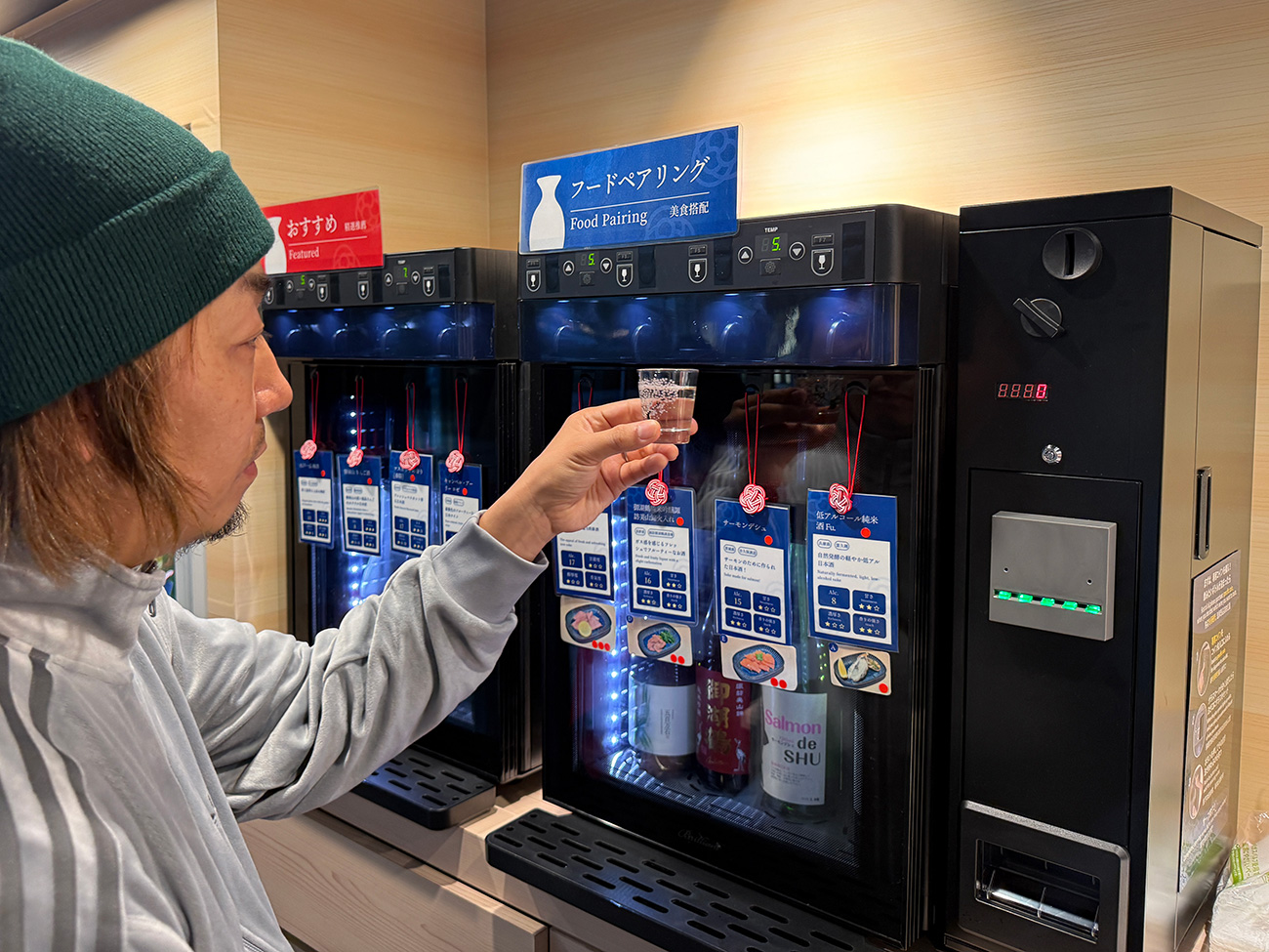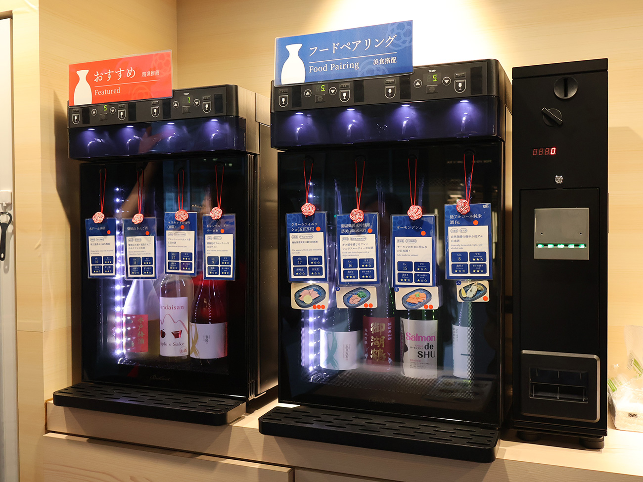 「SAKEICE BAR!」では気軽に日本酒を楽しむことができるようにコイン制を採用。セルフ式の販売機を使って自ら日本酒を注ぐスタイルとなっています。