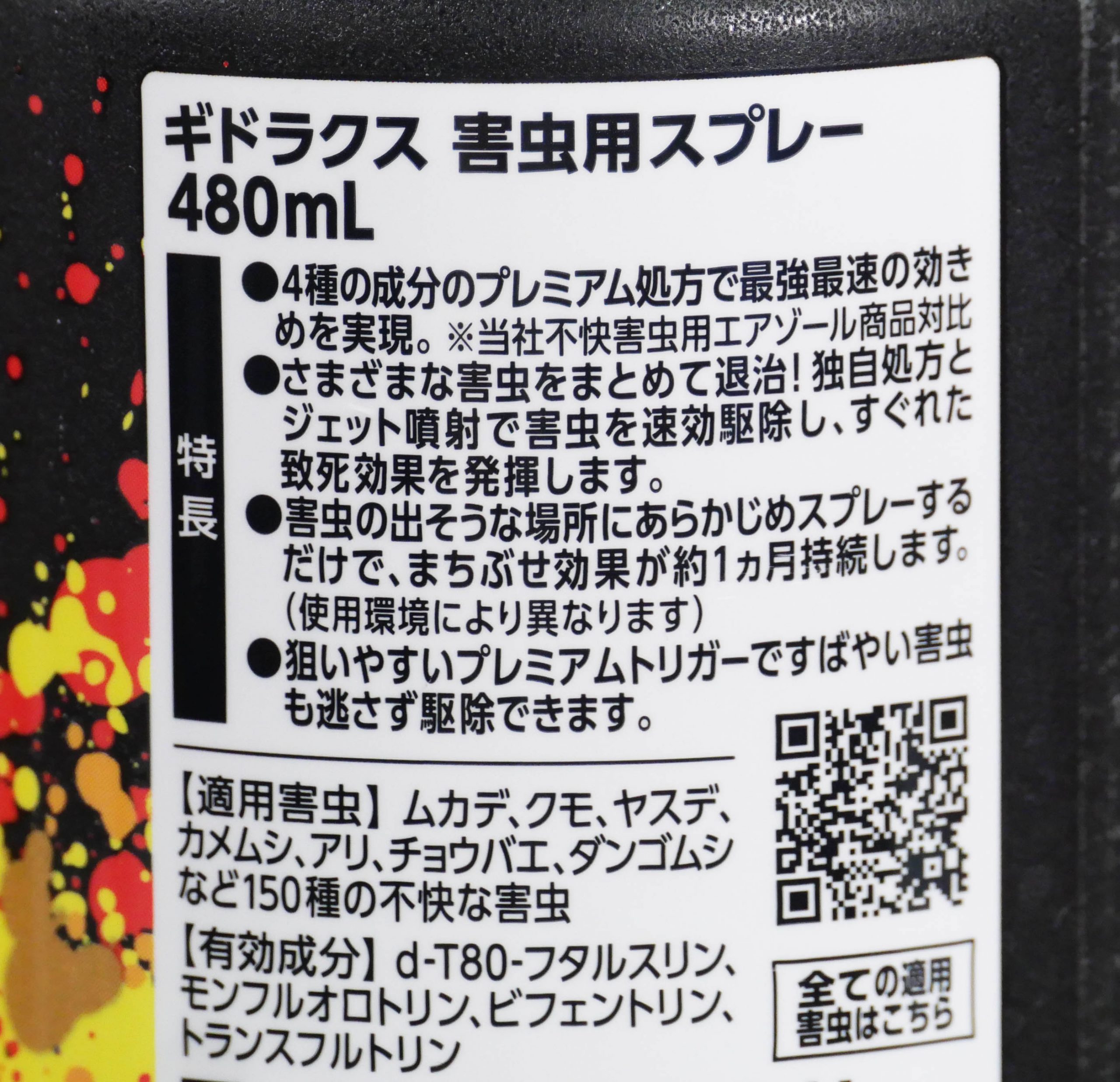 あくまで筆者の感想でしかないが、個人的に最強だと思っている害虫向けスプレーはアース製薬の「ギドラクス」シリーズだ。ハエ・蚊用、不快害虫用、ゴキブリ用など複数の種類があり、筆者はハエ・蚊用と不快害虫用を購入し、使っている。