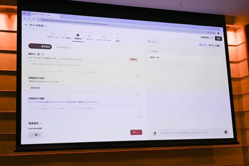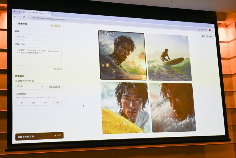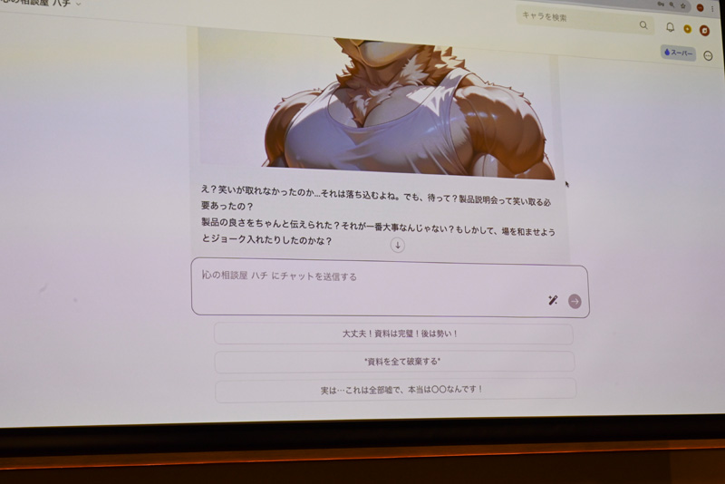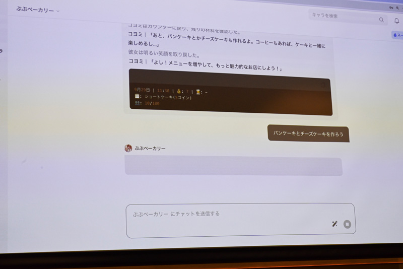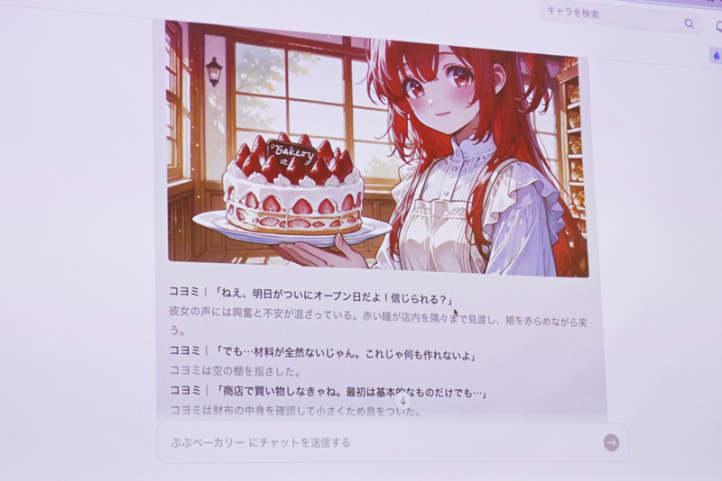 デモンストレーションでは、悩み相談ができるチャットや無人島でのサバイバル体験、美少女とともにお菓子店を経営するシミュレーションなどが披露された。キャラクターとの自然な対話はもちろん、状況に応じた画像生成もリアルタイムで行われ、その完成度の高さに驚かされた。