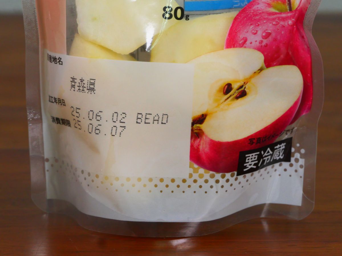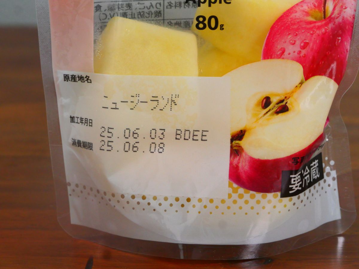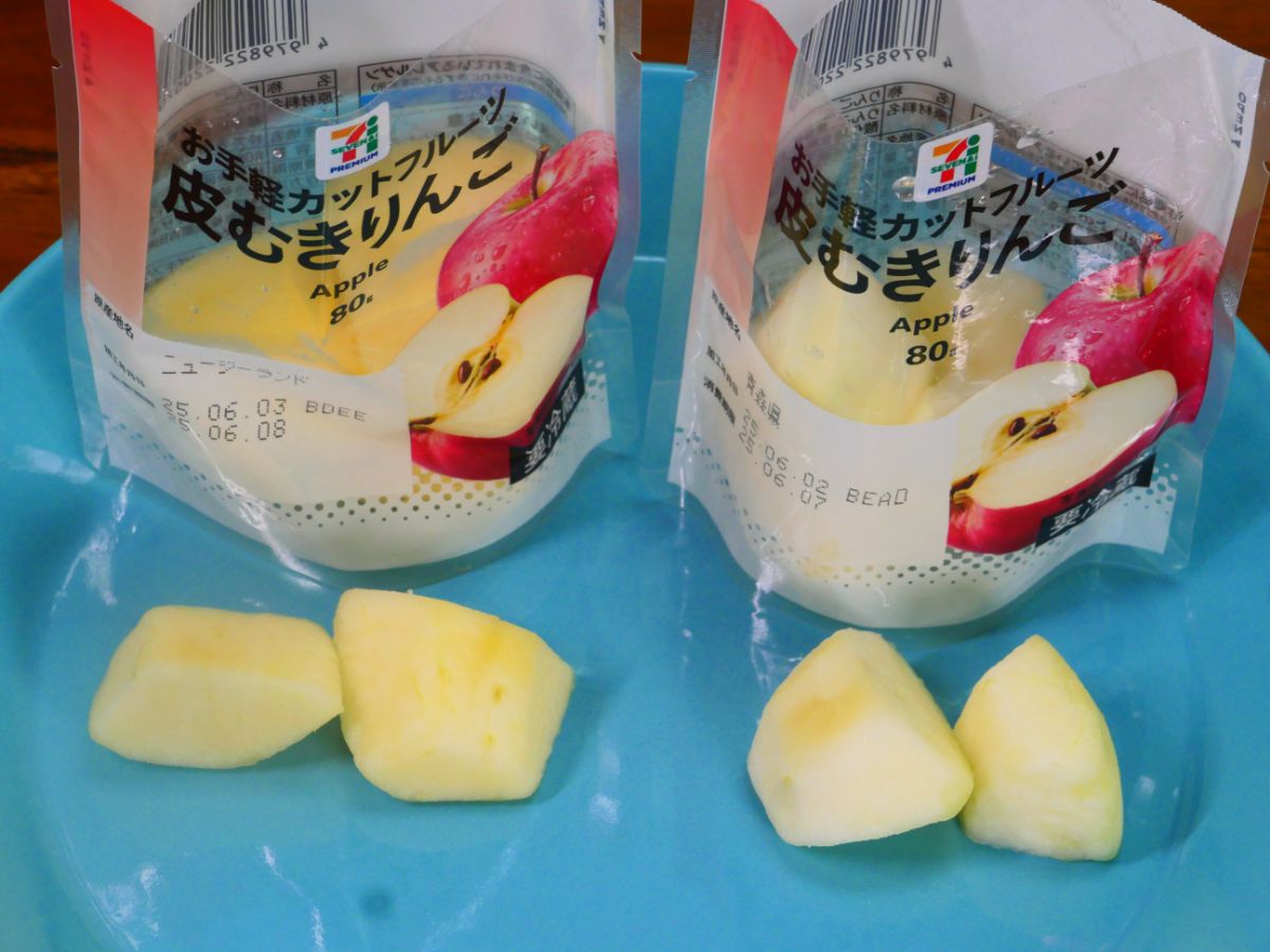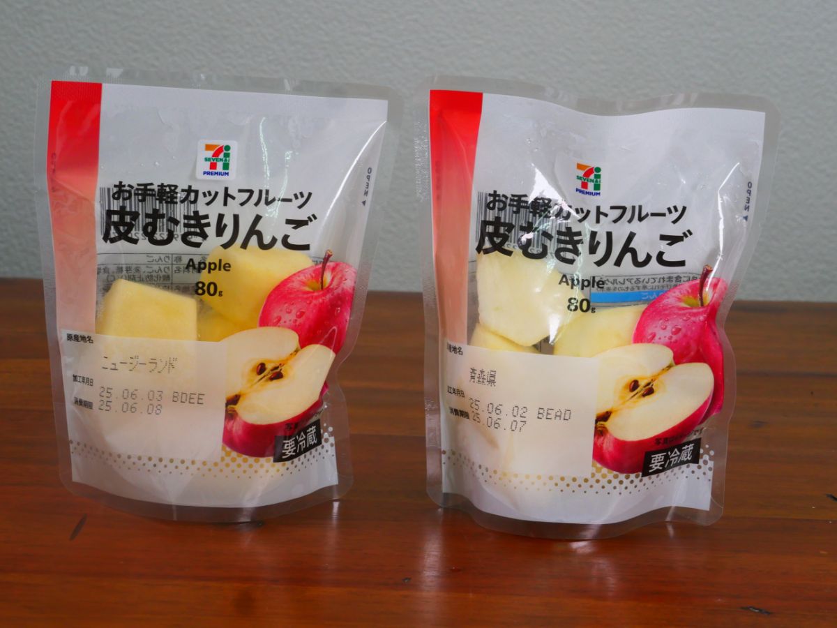 この「皮むきりんご」ですが、産地が違うことがあるようです。セブンイレブンに行ったところ、青森産とニュージーランド産が同時に売られていたので、食べ比べしてみました。