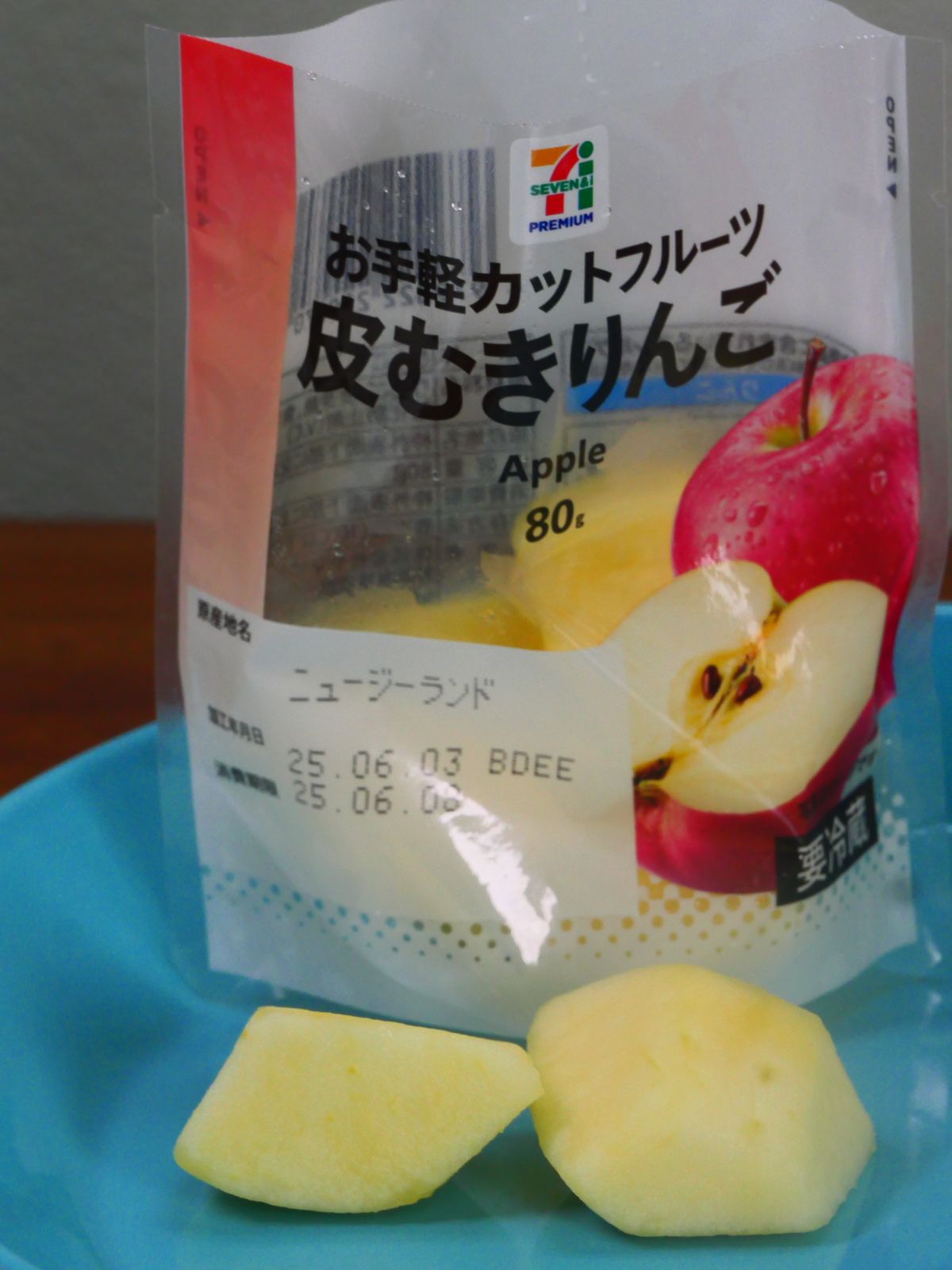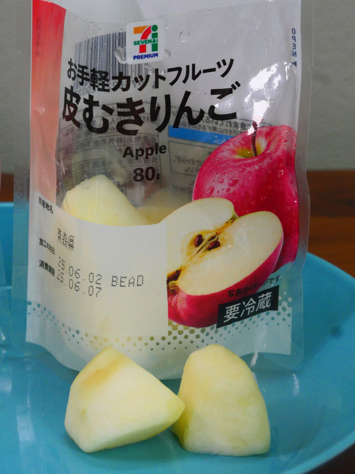 セブンイレブンはお弁当やおにぎり、ホットスナックもおいしいのですが、フレッシュなフルーツもおいしかったりします。特にオススメしたいのが「皮むきりんご」で、包装を開封すれば、スグにつまんでりんごが食べられるというスグレモノ。
