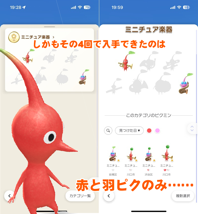 狙うは全7種類の“ミニチュア楽器”を身につけたデコピクミンであり、入手経路は親の顔よりよく見たイベントチャンレジのルーレット。