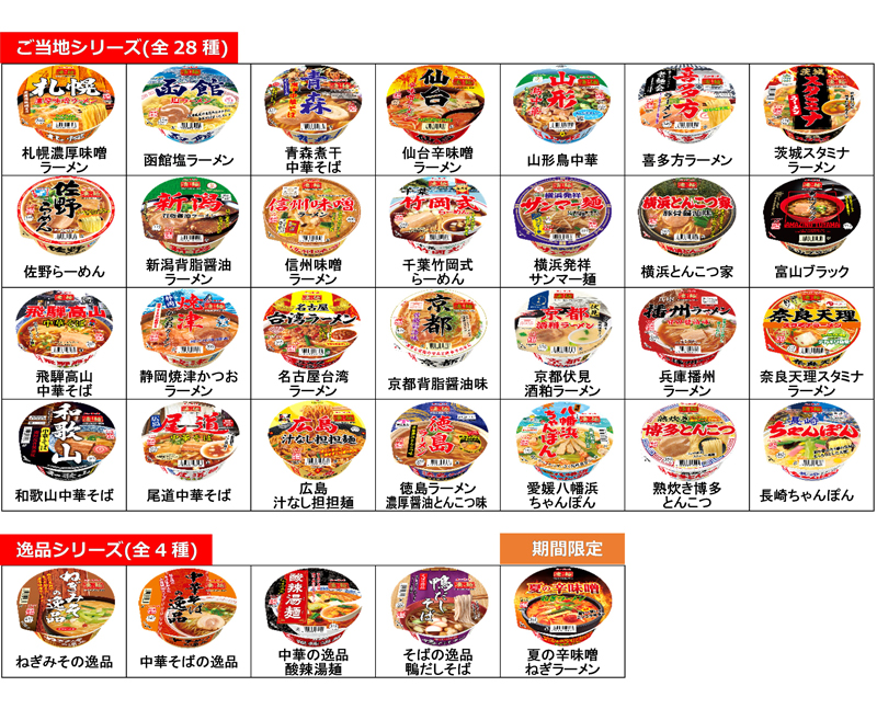 現在、全国のご当地麺を本格再現した「ご当地シリーズ」と、麺・スープ・具材全てにこだわる「逸品シリーズ」の2シリーズと、期間限定商品を販売しております。