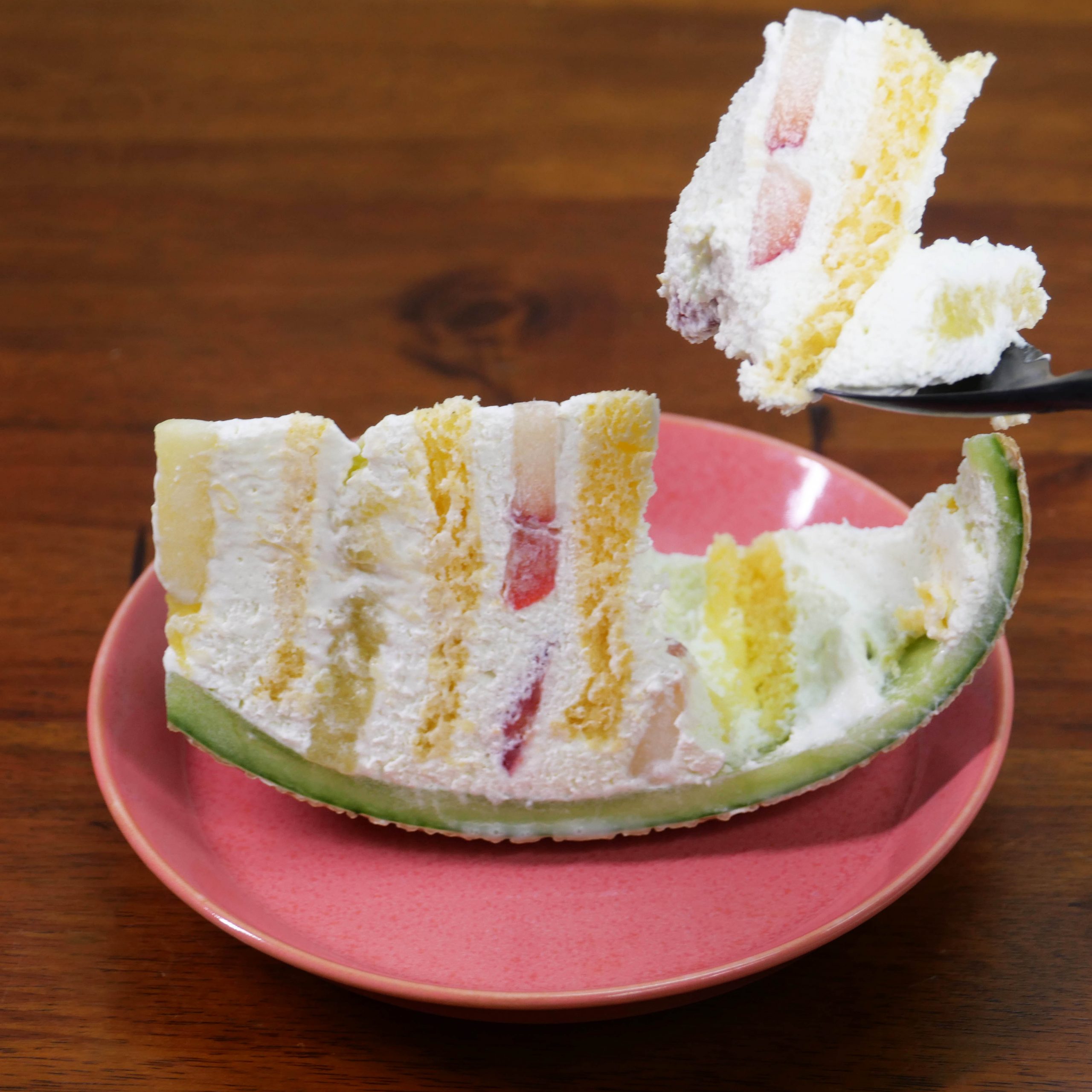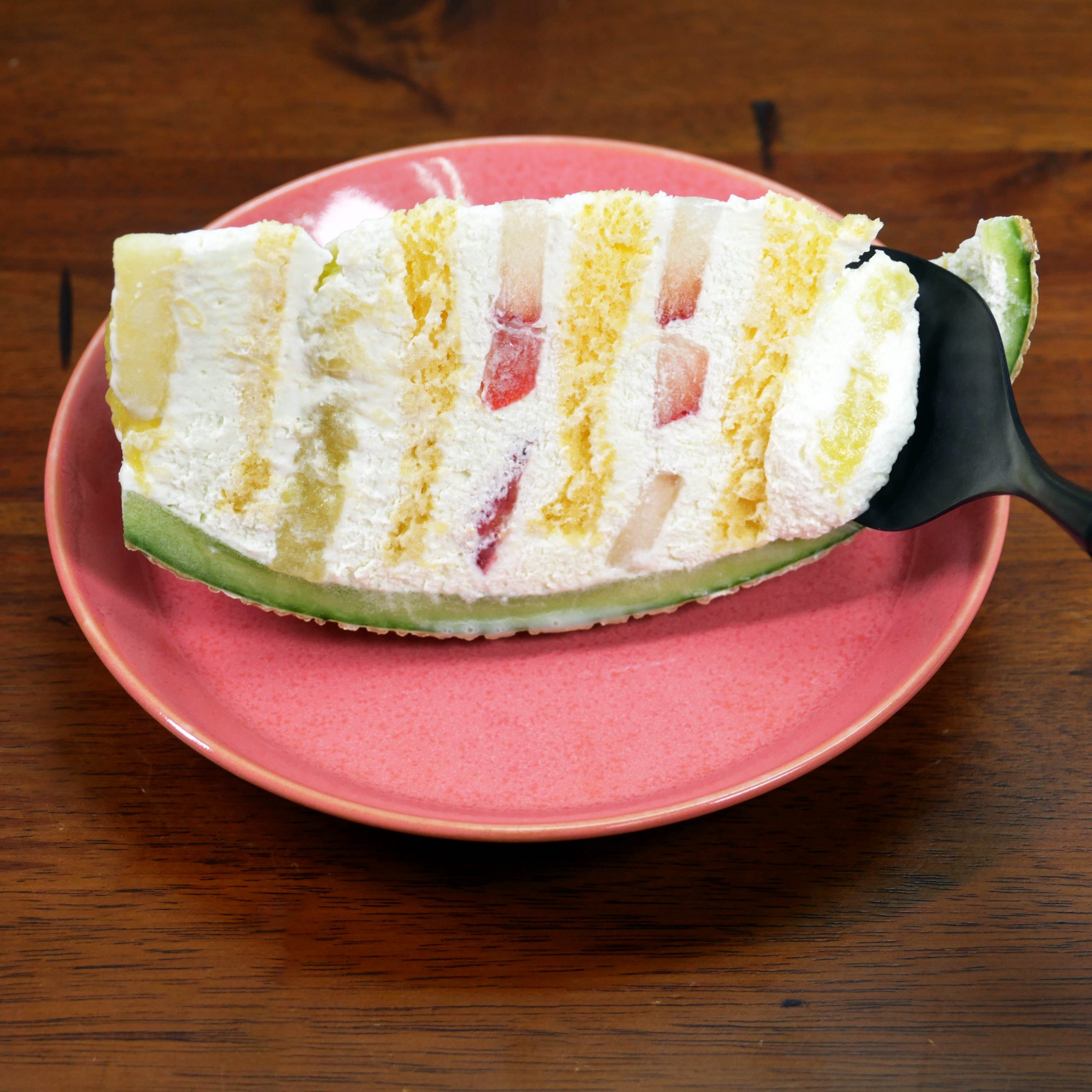まるごとメロンケーキを1玉で買うこともできる。今回購入したものはワンカット。ケーキにスプーンを落とすと、限りなく柔らかいスポンジとクリームがお出迎え。抵抗感なくスプーンにのってくる。そのテイストは至高。