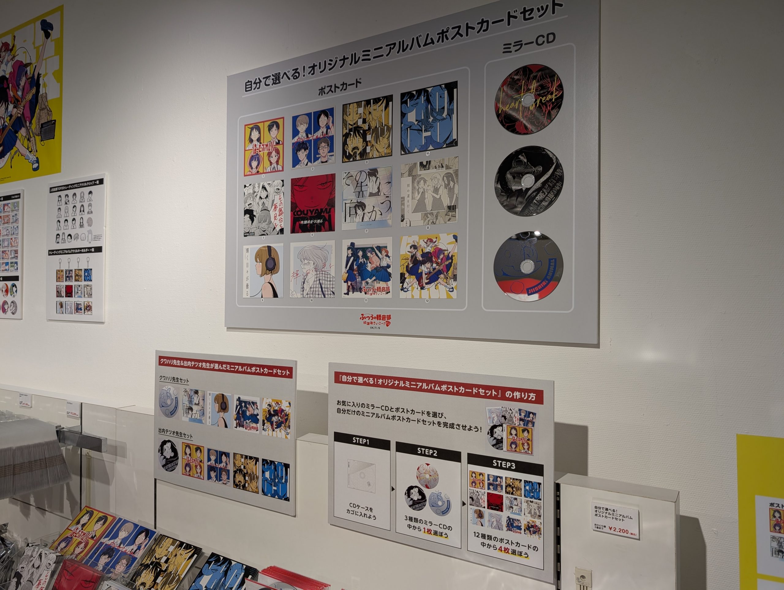 CDジャケット風にデザインされた全12種のポストカードの中から4点と、CD風にデザインされた全3種のCD型ミラーの中から1点を選び、特製CDケース(全1種)に入れて、自分だけのミニアルバム風ポストカードセットを作ることができる商品になっています。