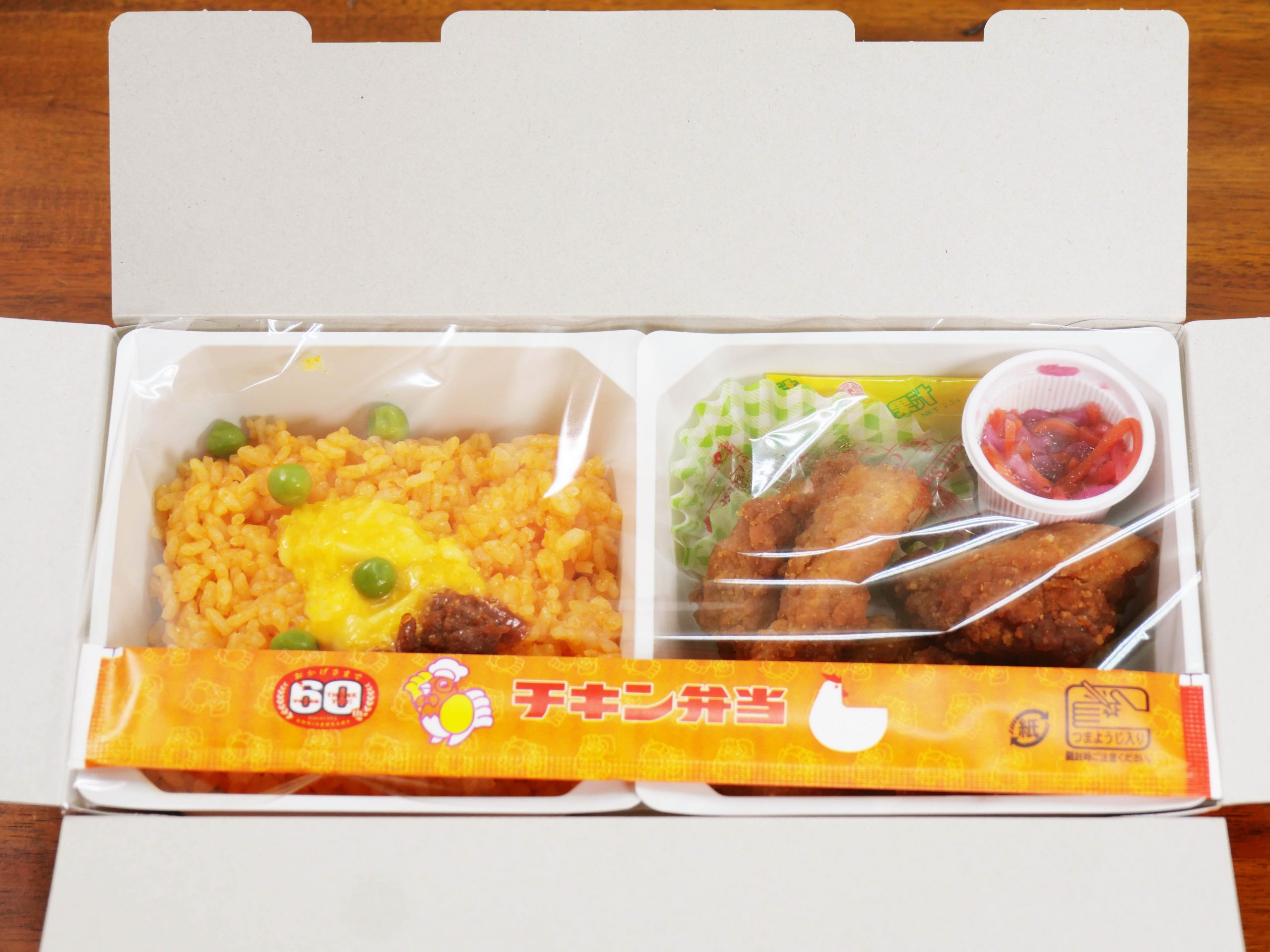 この「チキン弁当」だが、昭和39年発売のロングセラーで、なんと2025年で60周年とのこと。実は、かなり歴史ある駅弁。内容は鶏唐揚とトマト風味ライスがメインで、スモークチーズが添えられている。シンプルな具構成だがビジュアルは鮮やか。
