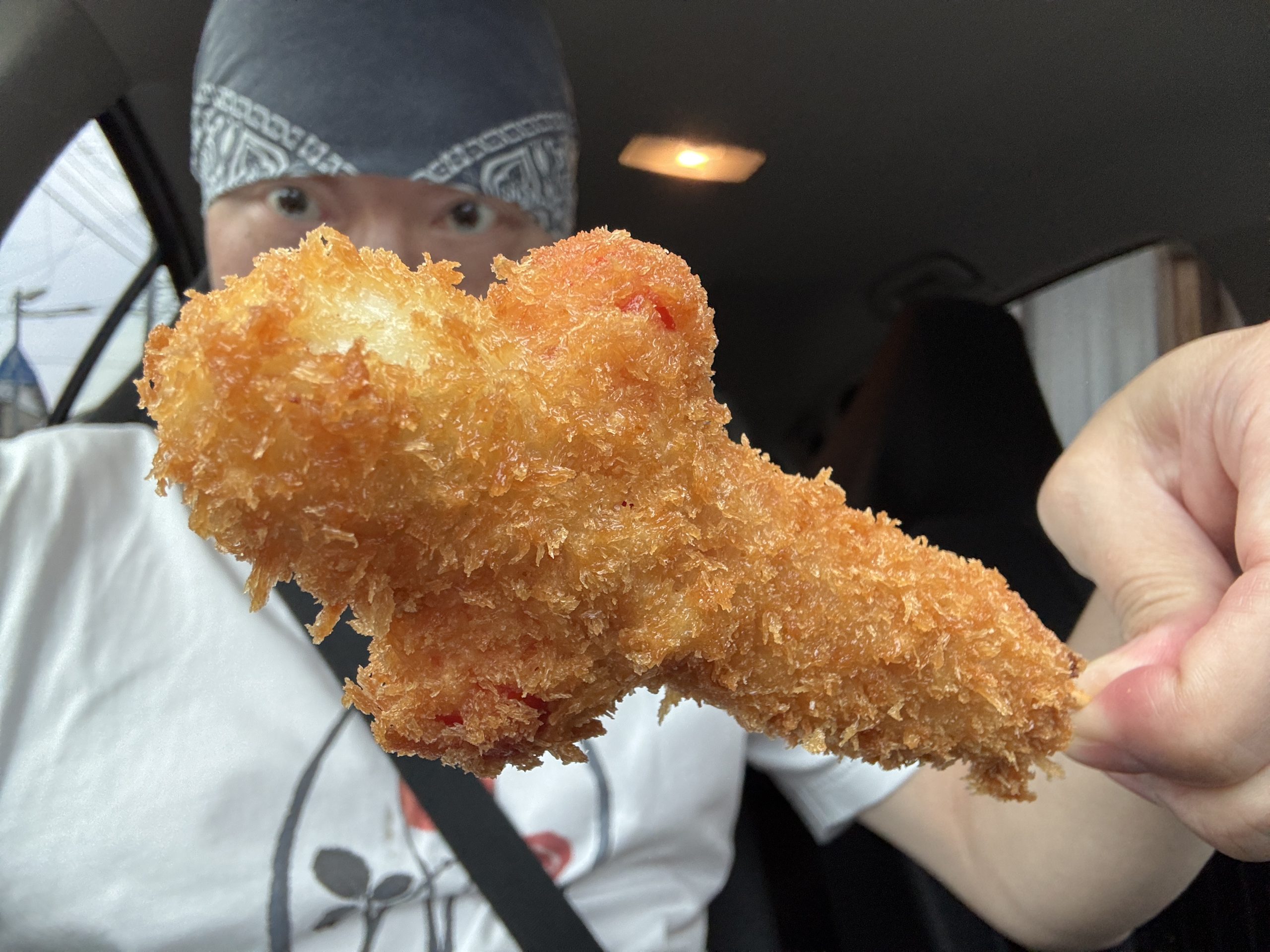 「かかし」はオーダーしてから揚げてもらえる。嬉しい。揚げたてが食べられるッ! コロッケやトンカツも揚げたてが食べられるとのことで、ガッツリと揚げ物をオーダー! さっそくクルマに戻り、ソッコーで食べる。その味は……。
