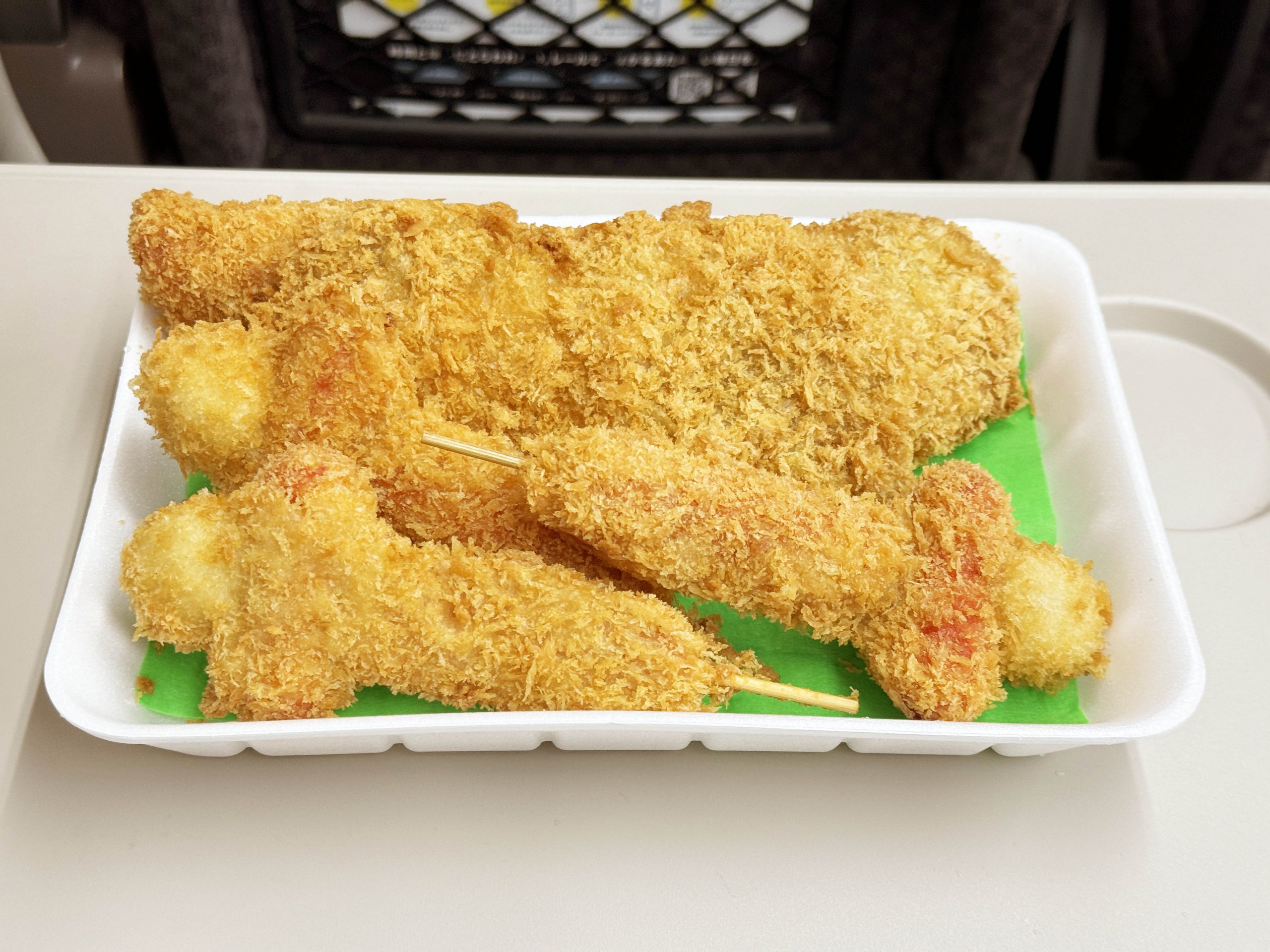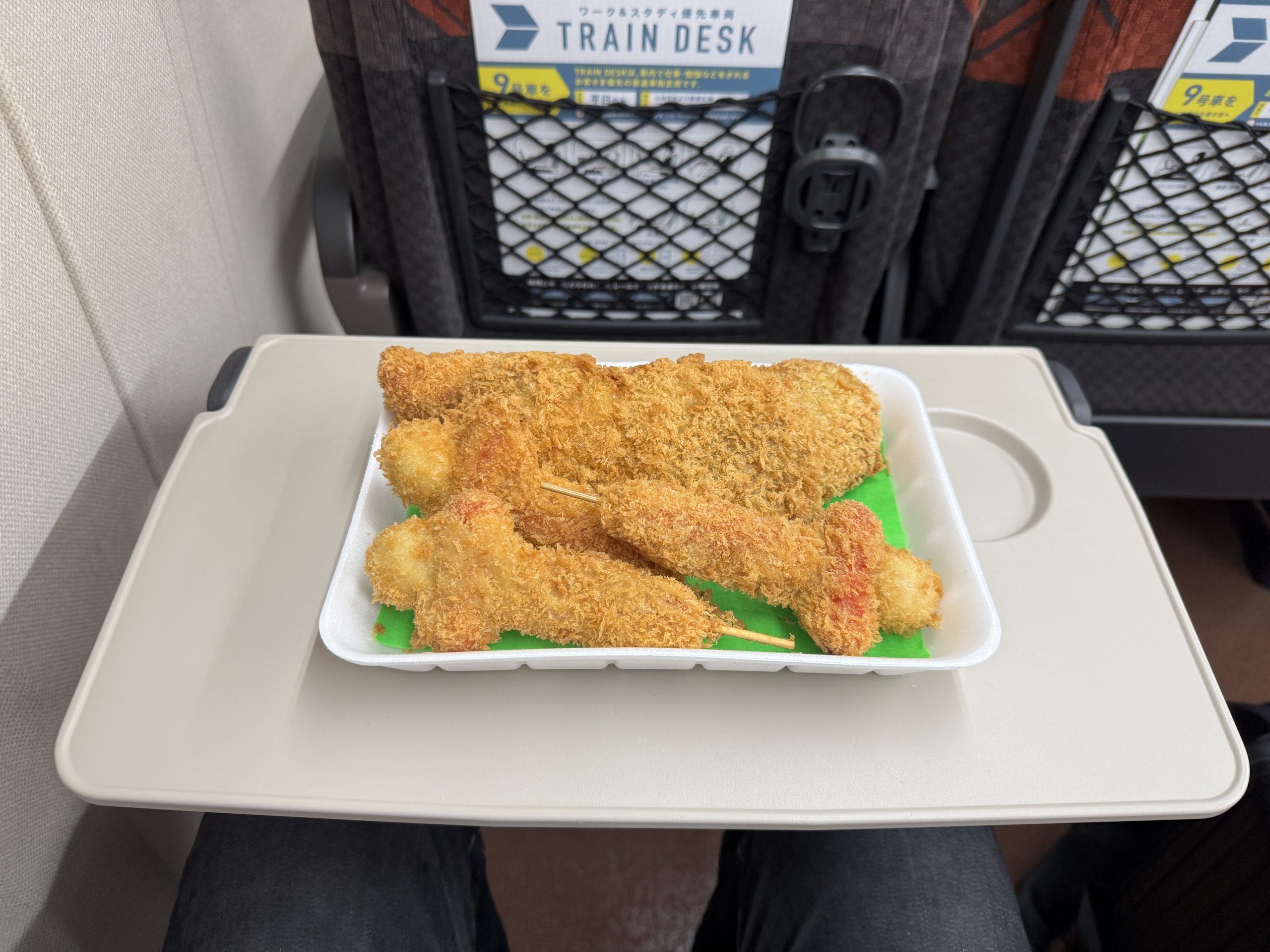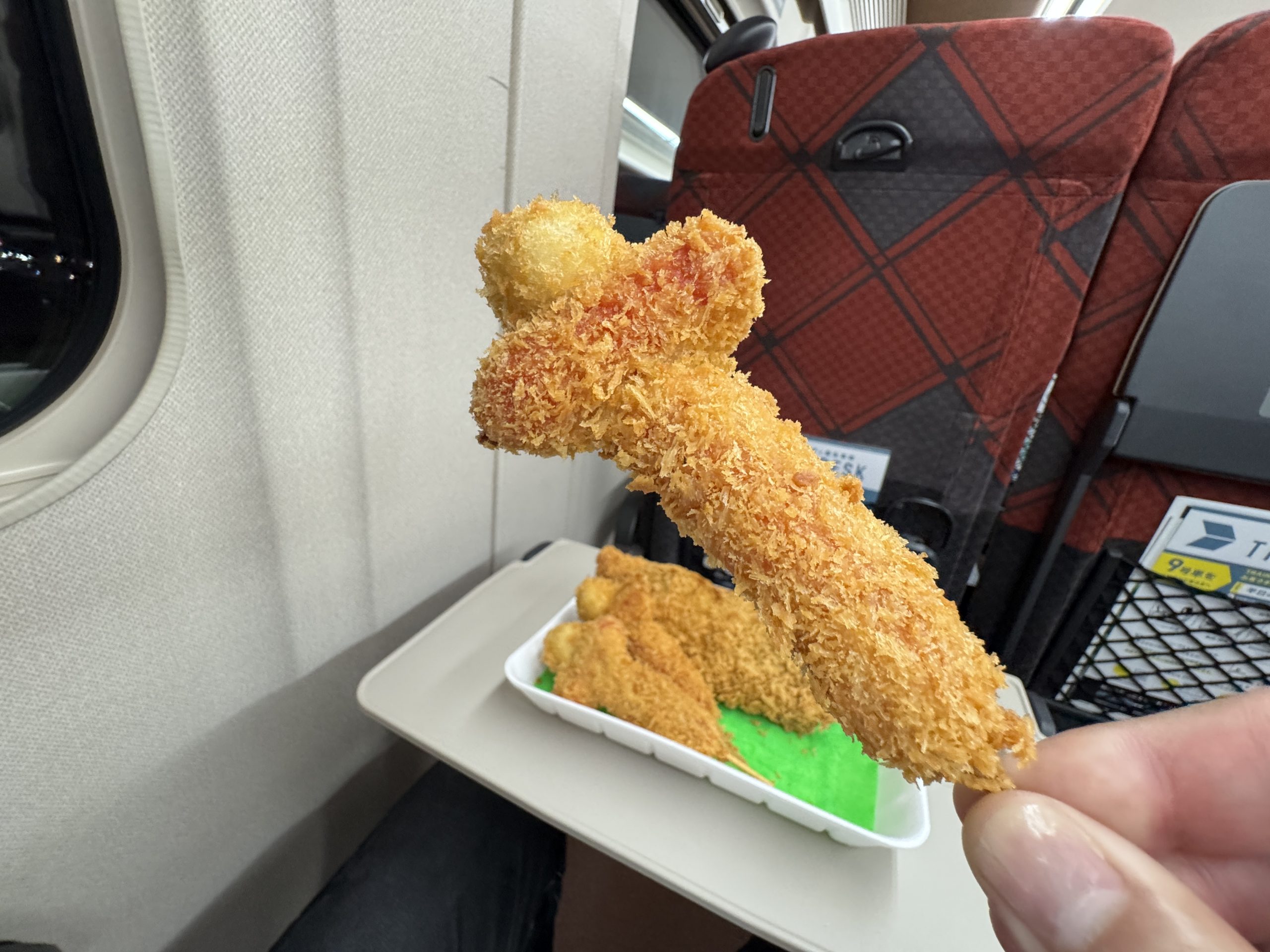 ……ということで、新幹線に乗って東京に帰るなか、「かかし」を食べることに! 飲みながら食べることに!