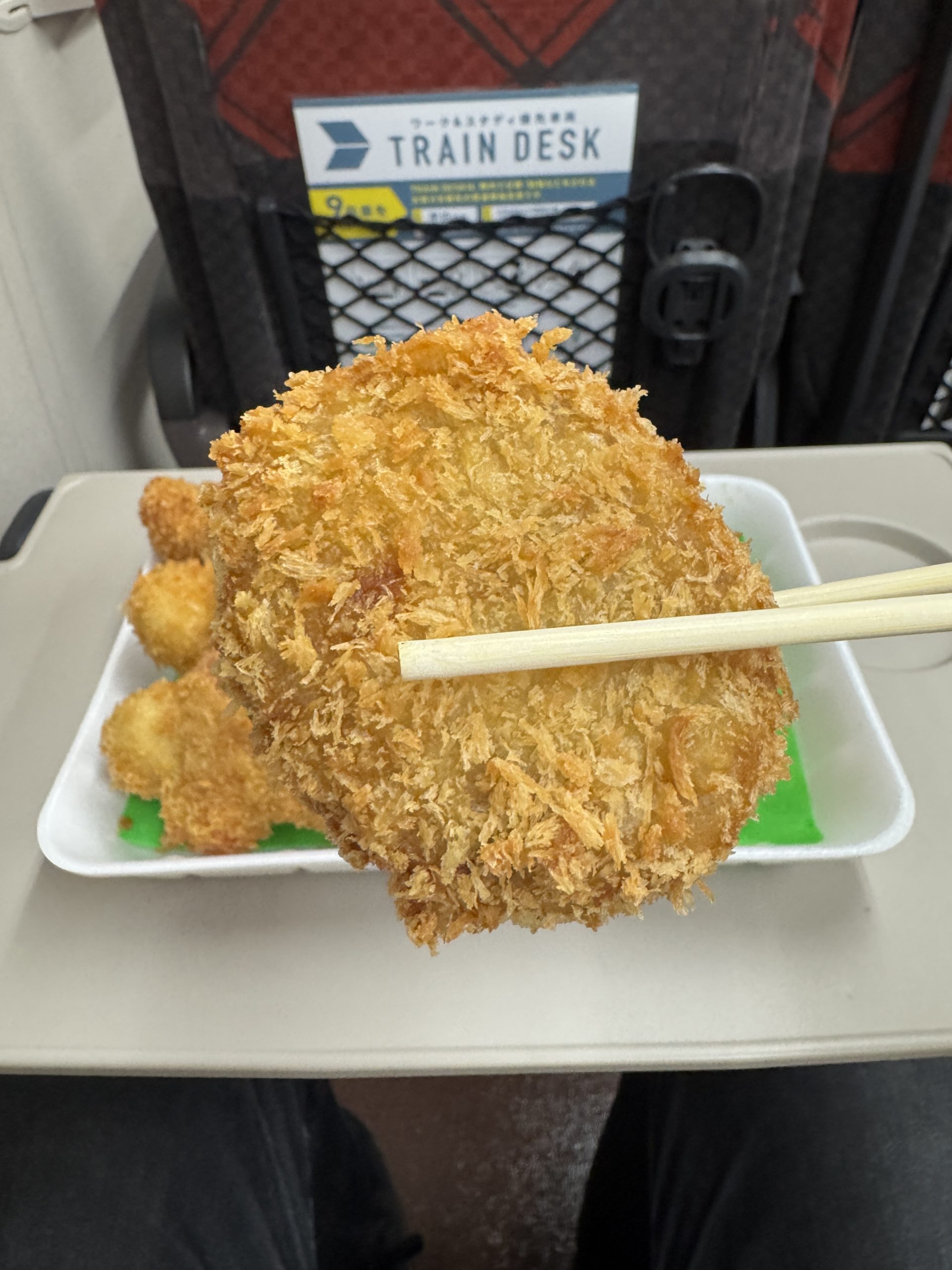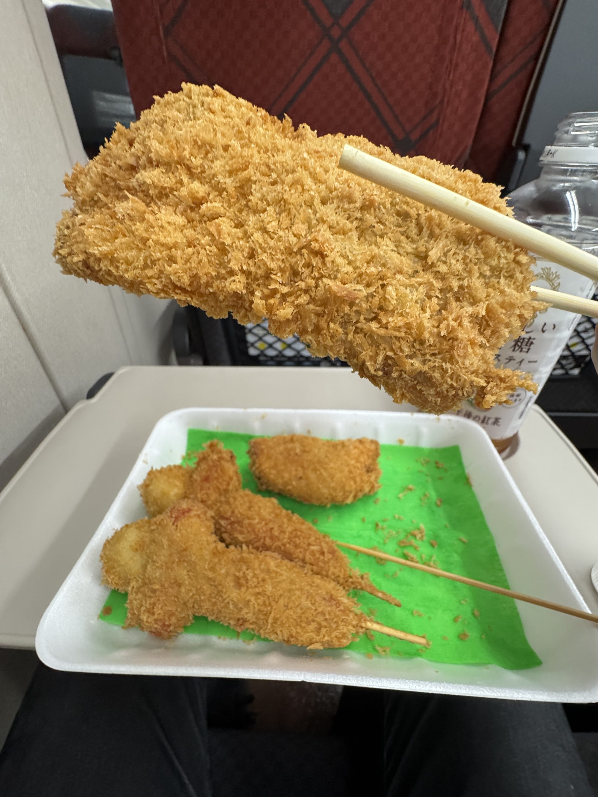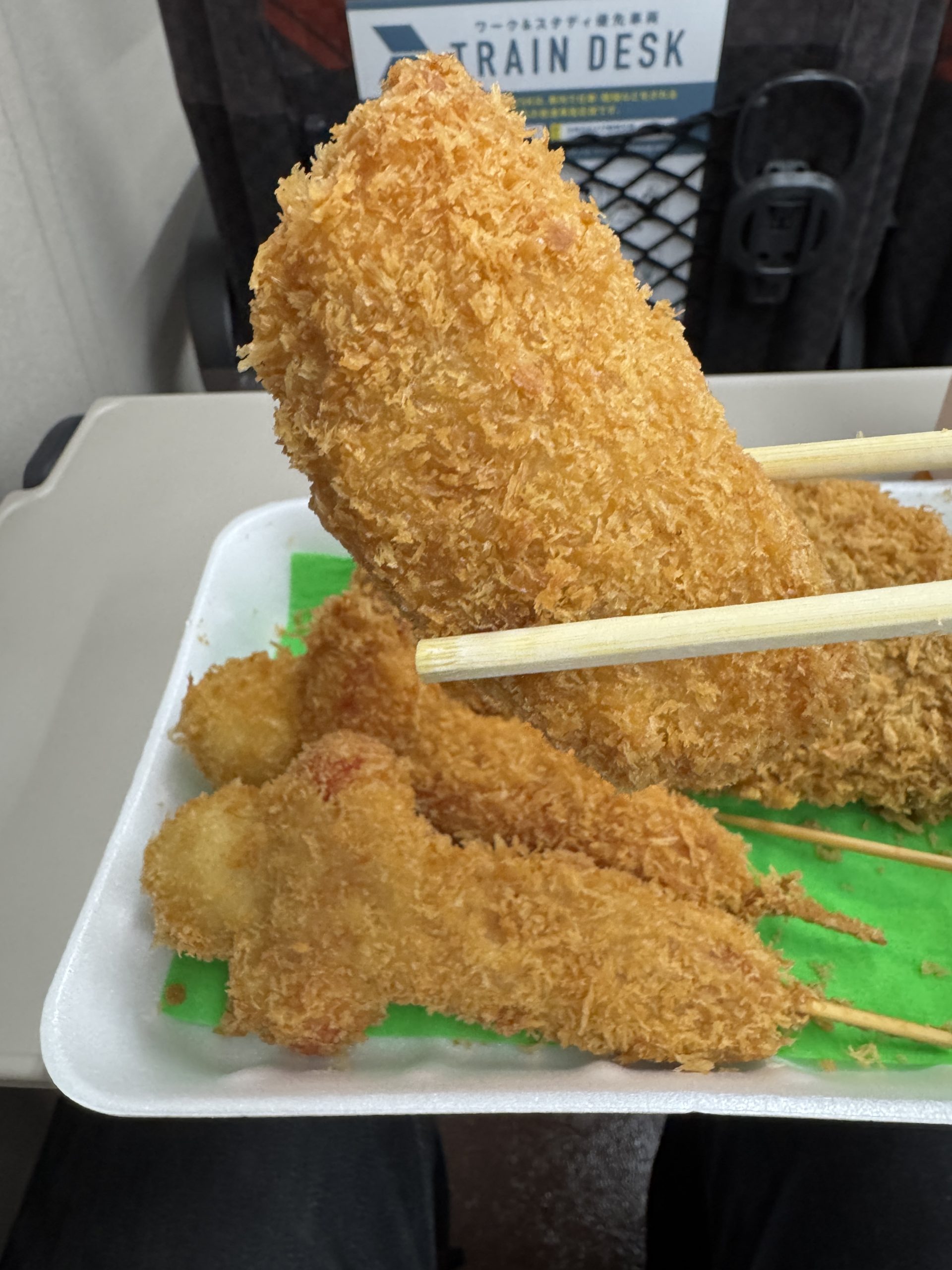 ……ということで、新幹線に乗って東京に帰るなか、「かかし」を食べることに! 飲みながら食べることに!