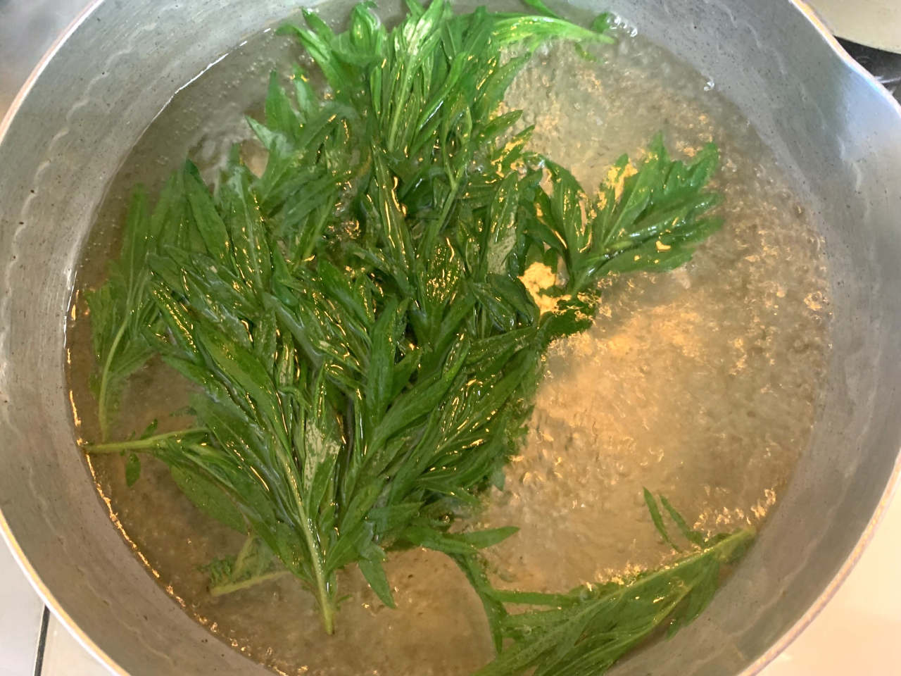 洗ったらあく抜きのため、塩少々を入れ沸騰したお湯で2分ほど茹でます。お湯に入れた瞬間、ヨモギの香りが爆発します。いい匂い。あんこ食べたい。