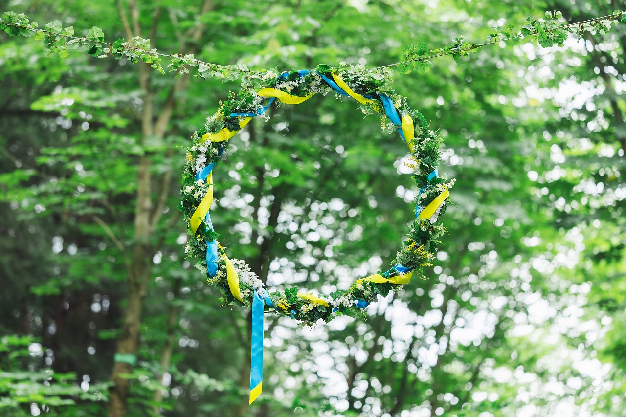 この夏至祭だけのフォトジェニックな装飾で、北欧8か国の国旗をモチーフにしたエントランスの巨大花冠ロードをまず歩くのですが、「メッツァの夏至祭2025」への気分が高まりますね!