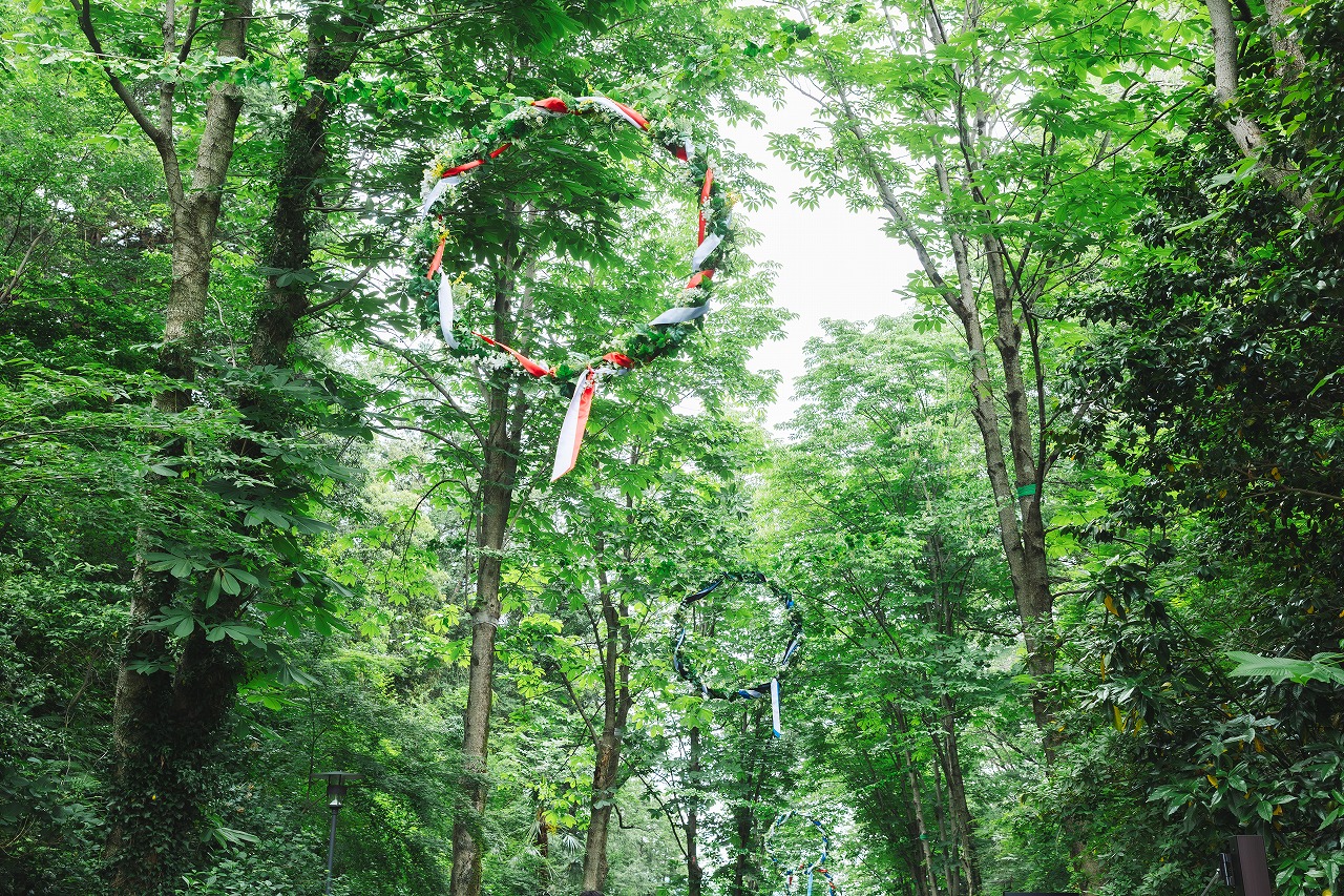 メッツァ入口のエントランスロード「メッツァティエ」には、夏至祭のマストアイテム「花冠」がモチーフで、北欧各国の国旗色のリボンをあしらった巨大花冠「北欧8か国の夏至の花冠ロード」が登場。