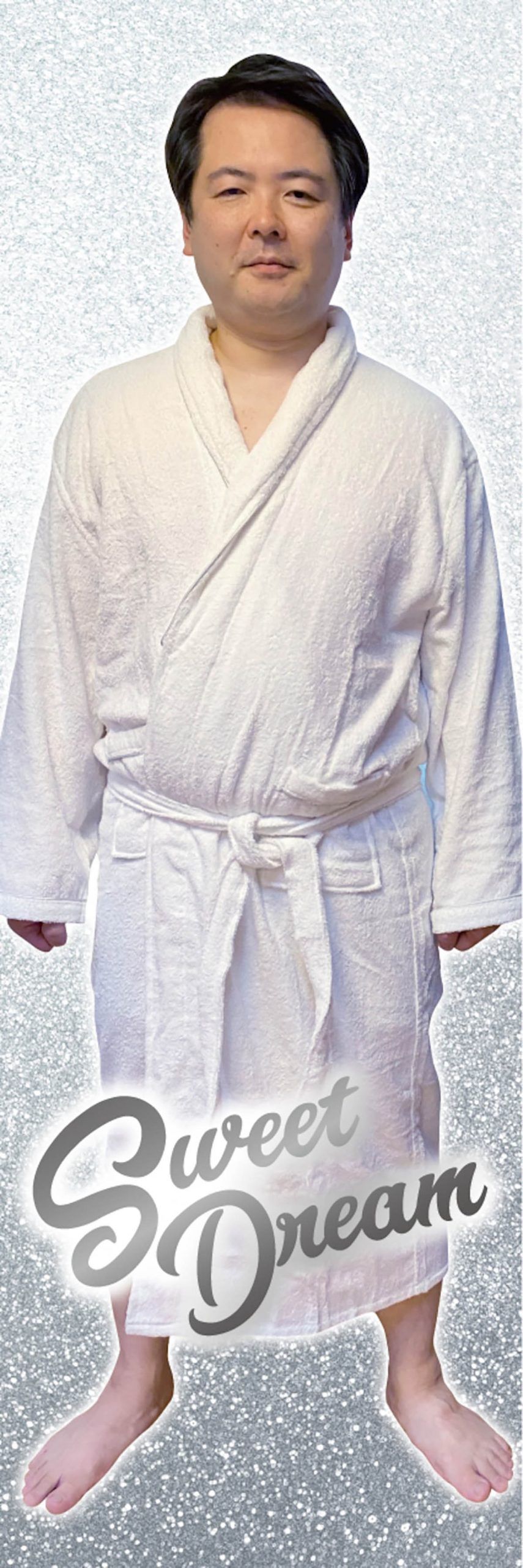 実際に実物に触れわけではないが、デザインされている大島てるさん姿は、抱き枕にマッチしたバスローブ姿であり、この抱き枕を作るためだけにバスローブを着用して撮影したものと思われる。さらに、大島てるさんの無表情さが、彼の日常生活のワンシーンをイメージさせてリアルだ。