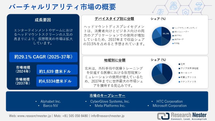 日本 – 2025年5月21日 – Research Nesterの最近の市場調査分析日本のバーチャルリアリティ市場:世界的な需要分析と機会展望2037年」では、コンポーネント、テクノロジー、デバイスタイプ、最終用途、アプリケーション、地域別の市場セグメンテーションの観点から、詳細な競合他社の分析と日本のバーチャルリアリティ市場の概要が提供されています。