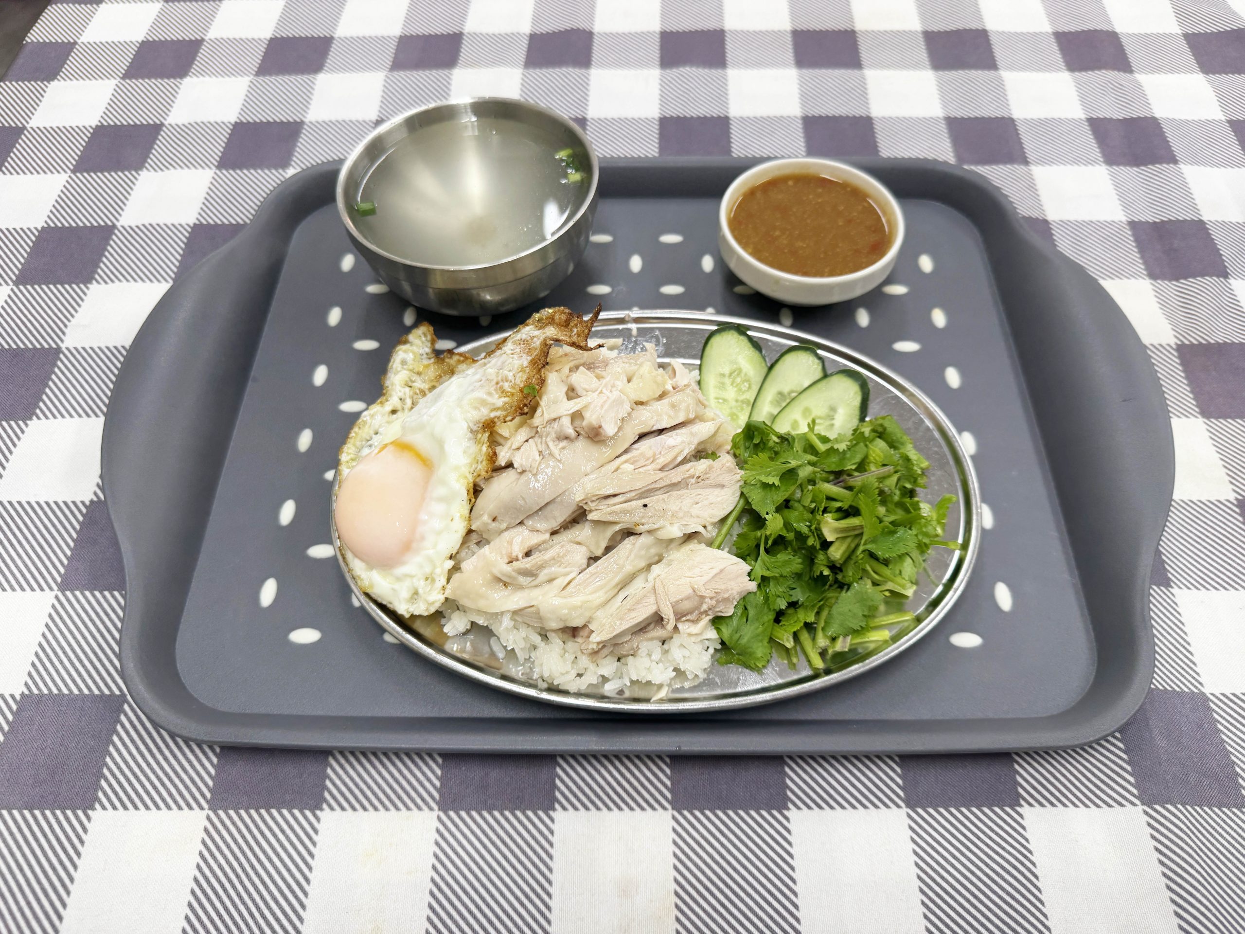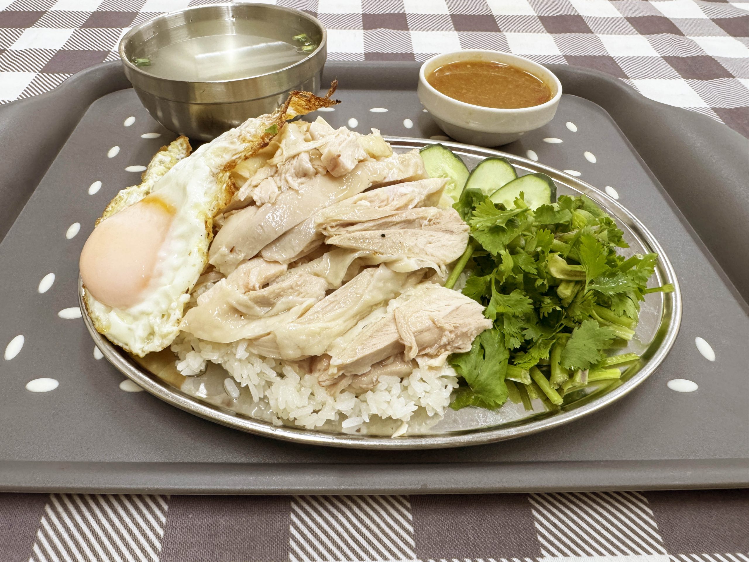 お店に入ったら、最初にカウンターでオーダーするっぽい。筆者はカオマンガイにチキン2倍とパクチーと目玉焼きをトッピング! 支払いを済ませて着席。待つこと数分……。やってきた! カオマンガイ! ビジュアルからして最高。5倍以上のエネルギーゲイン感じる(個人の感想です)!