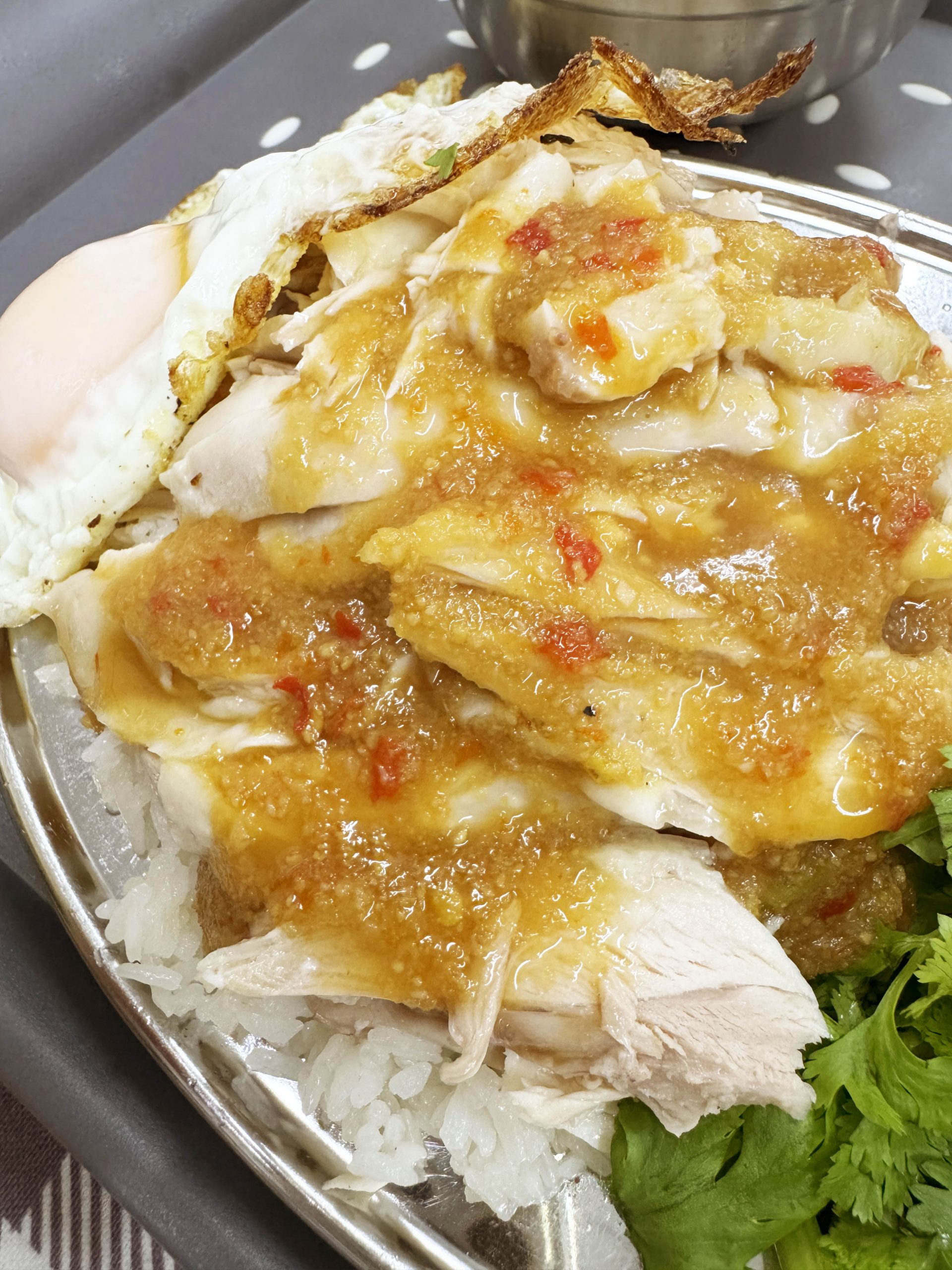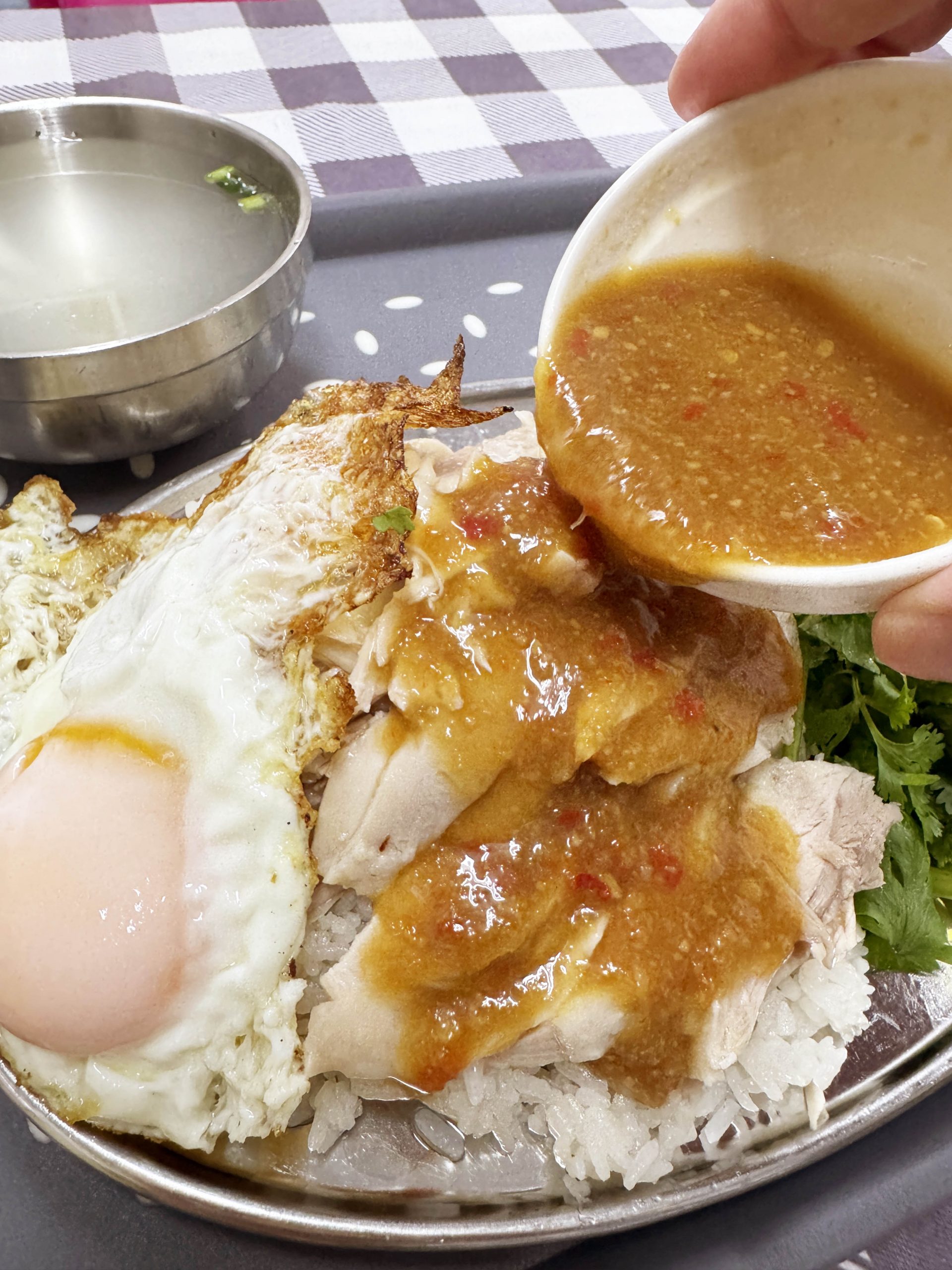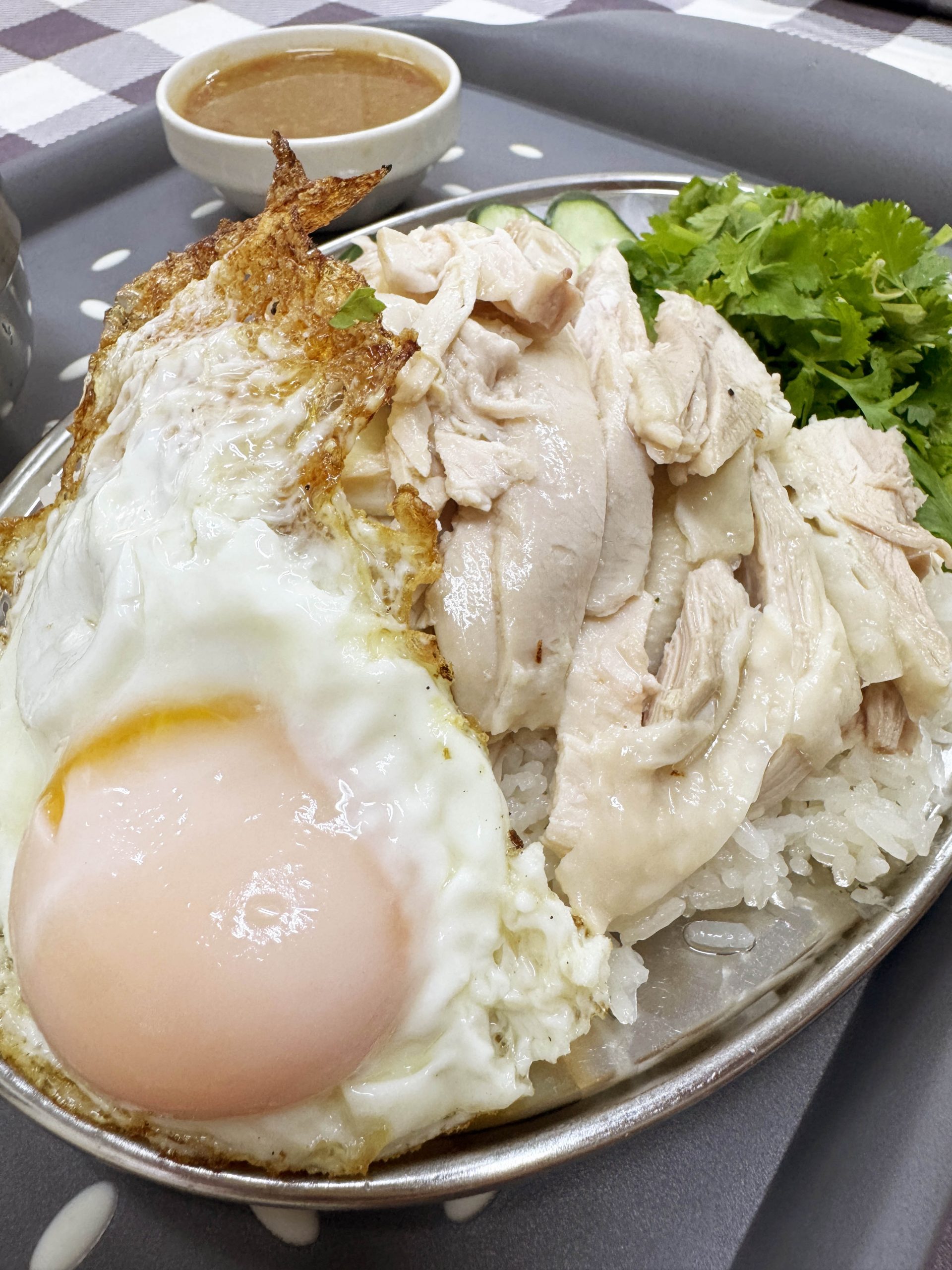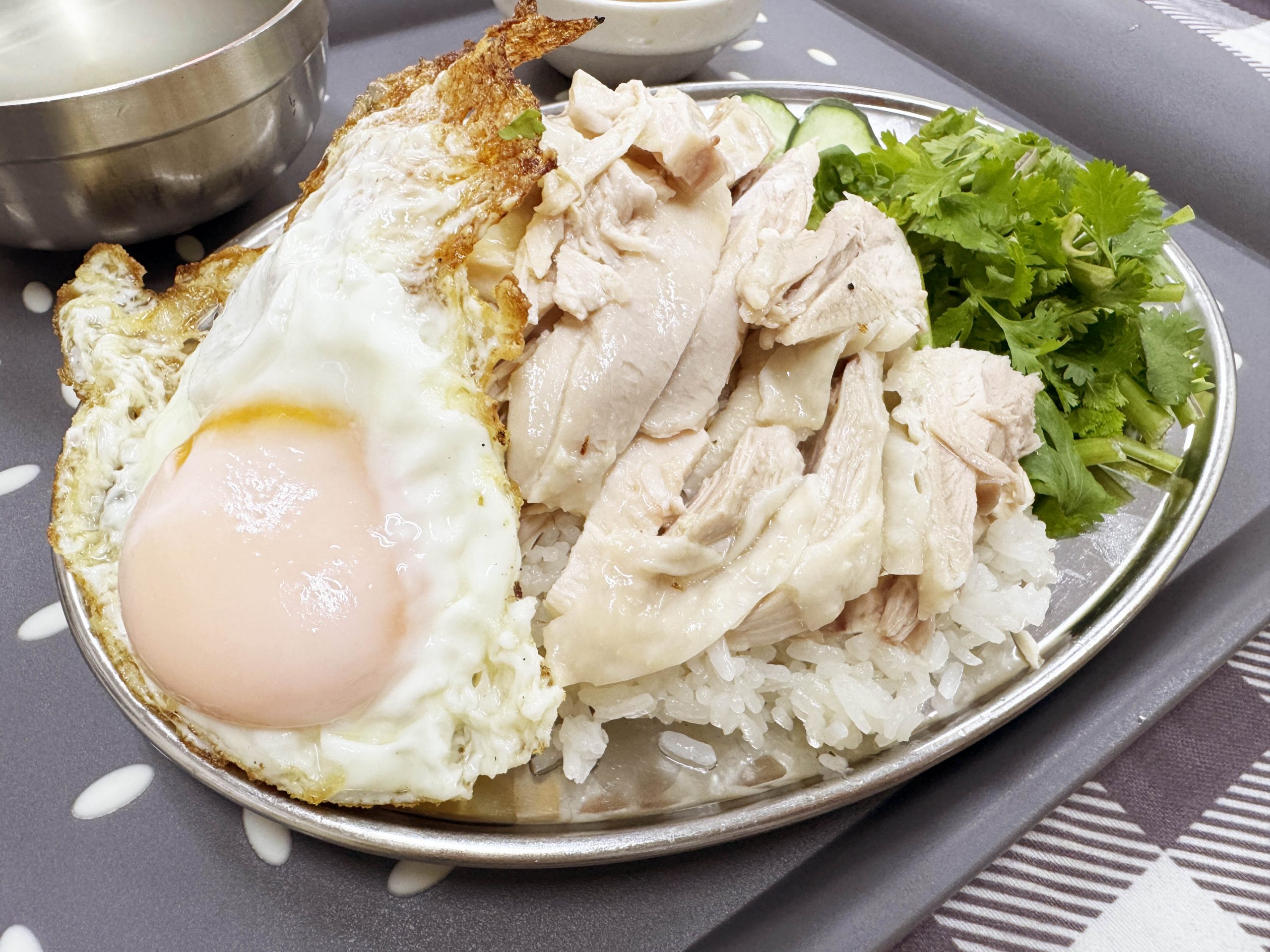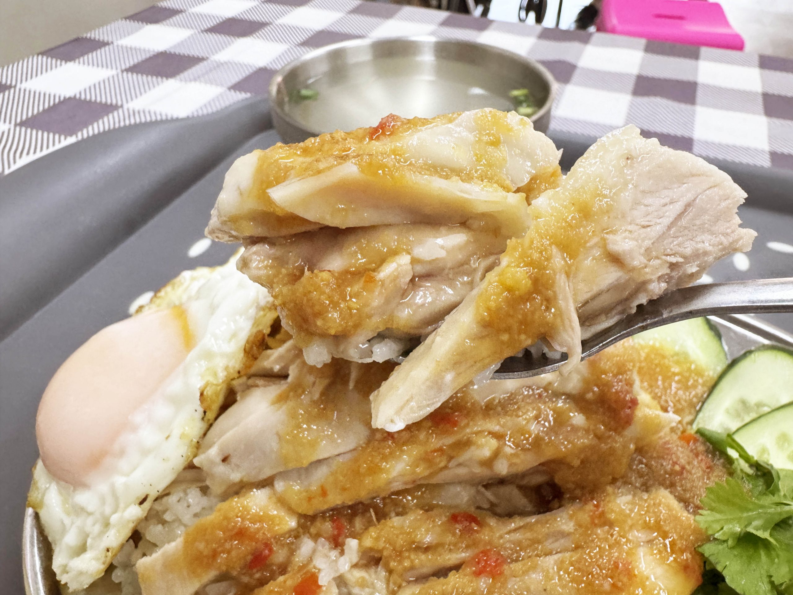 目玉焼きの存在感が半端ない! ということで、目玉焼きを少しだけむ横に寄せてみると、ドドーンと大量のチキンが姿を現した! これこれ、こういうカオマンガイが食べたかった! ガッツリ多めのチキンとライスの組み合わせ! それをガツガツ食べたかった!