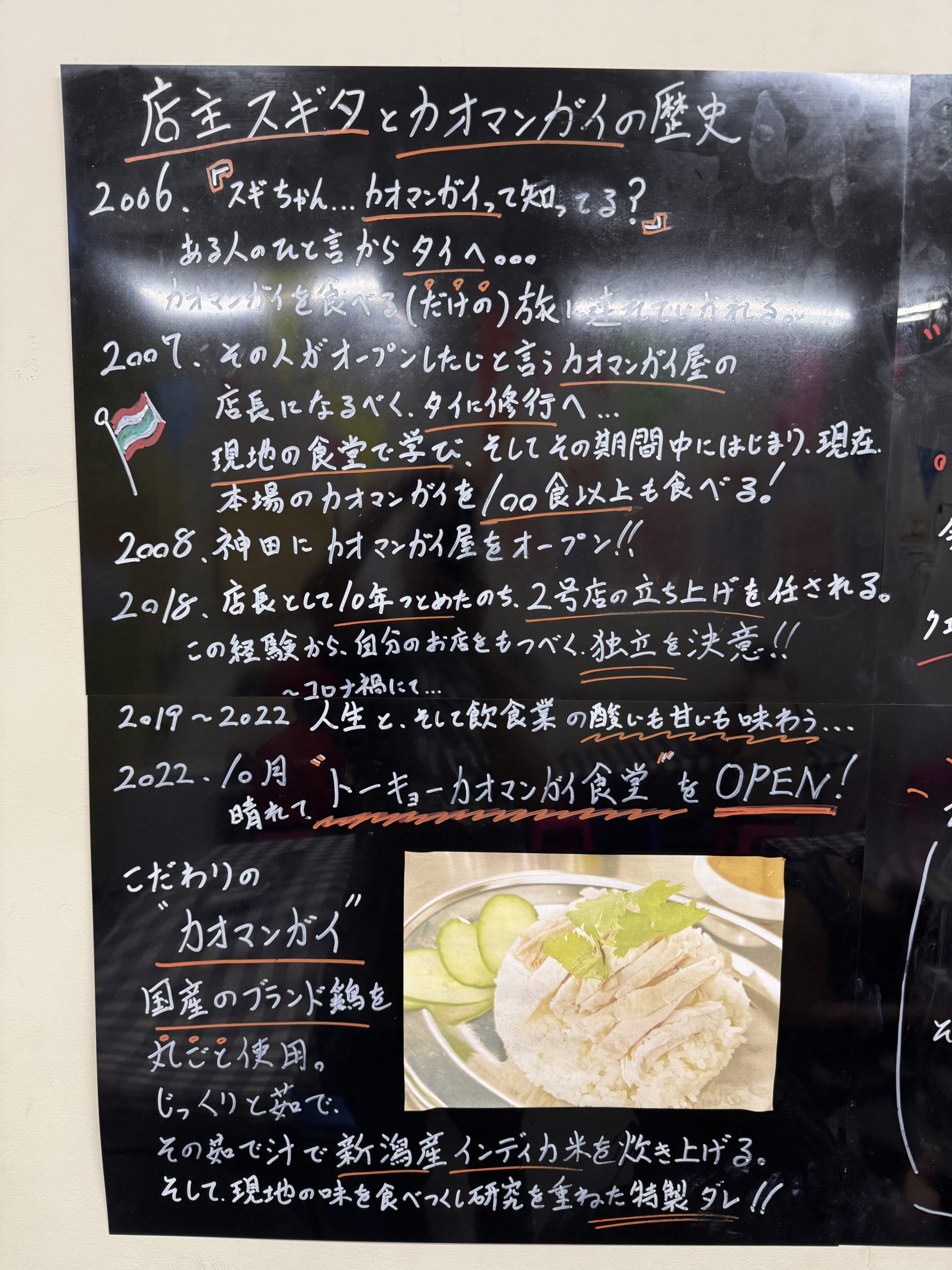 トーキョーカオマンガイ食堂、もはや、お店の雰囲気からして、「うんまいカオマンガイ食えるよ!」というオーラ出しまくっている、テーブルも、椅子も! そして、壁に貼られている店主の人生も!