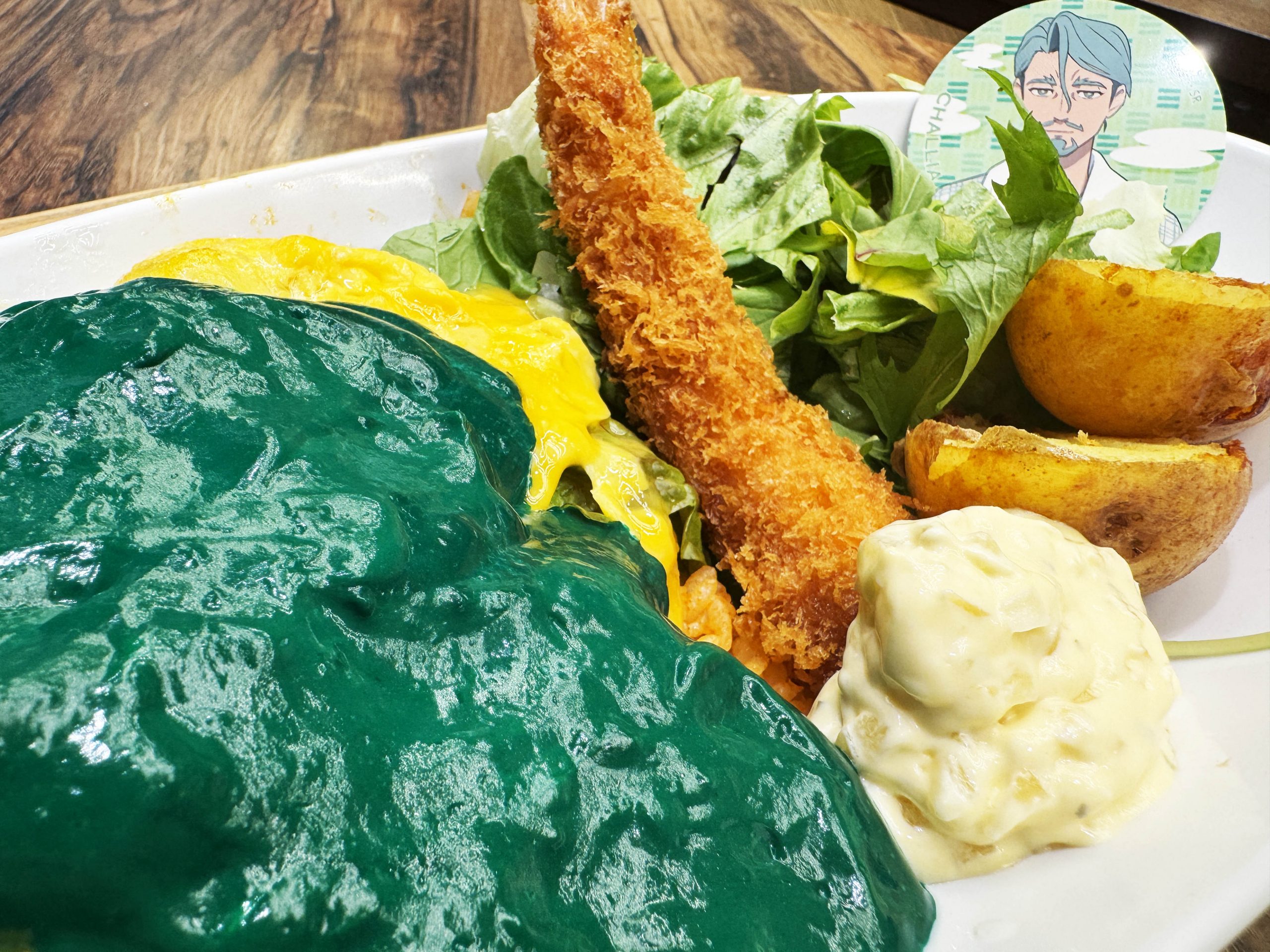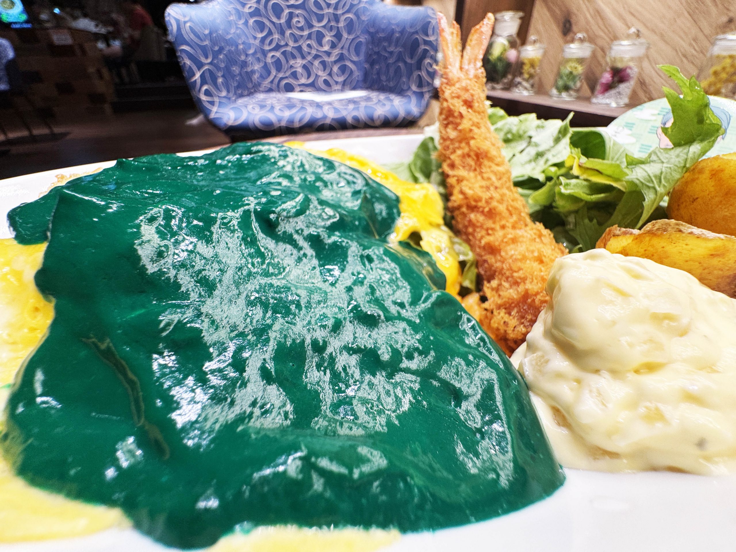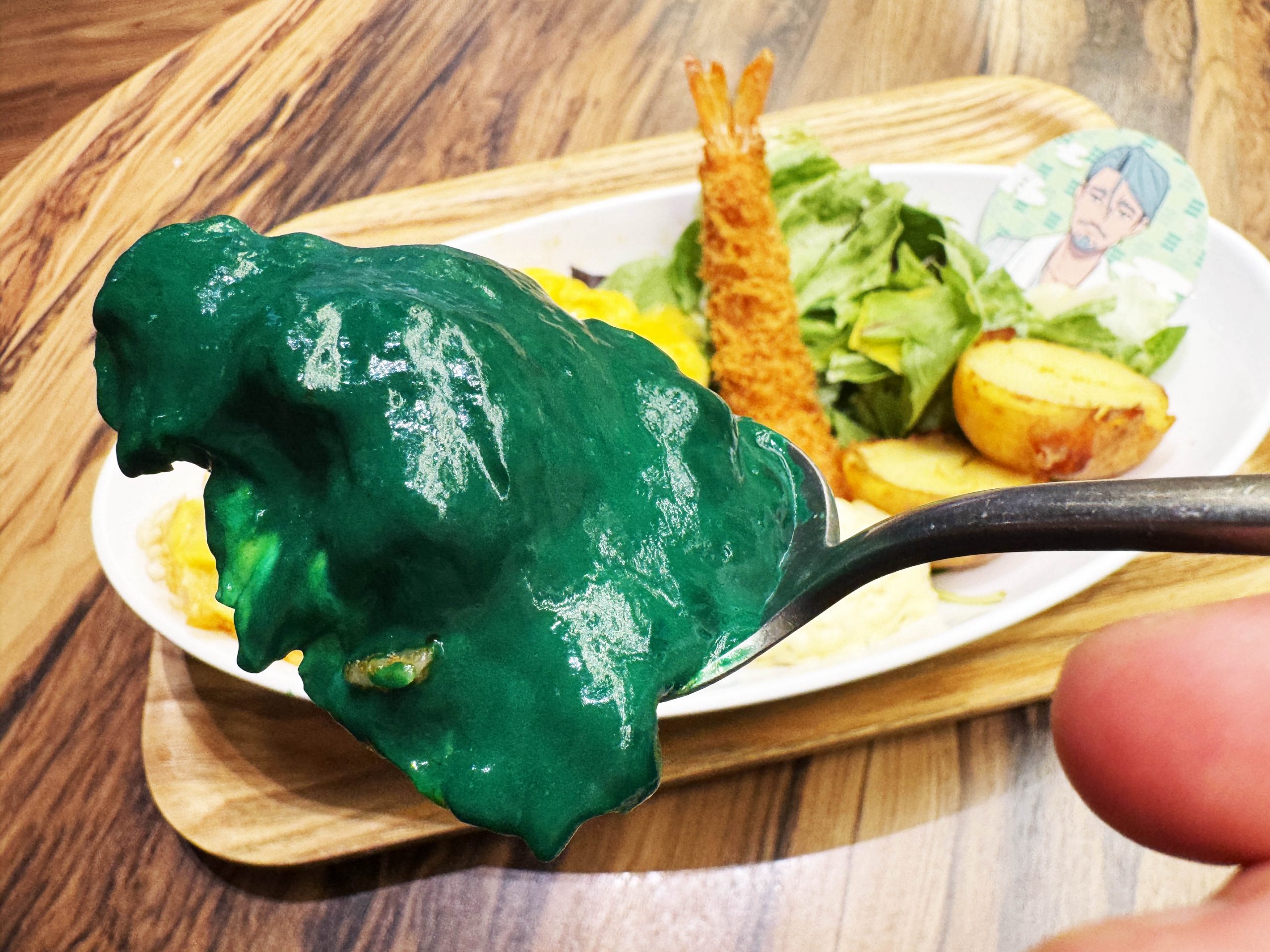 オムライス的なものに、たっぷりとかけられている緑の謎ソース。そこに揚げたジャガイモとエビフライが添えられている。