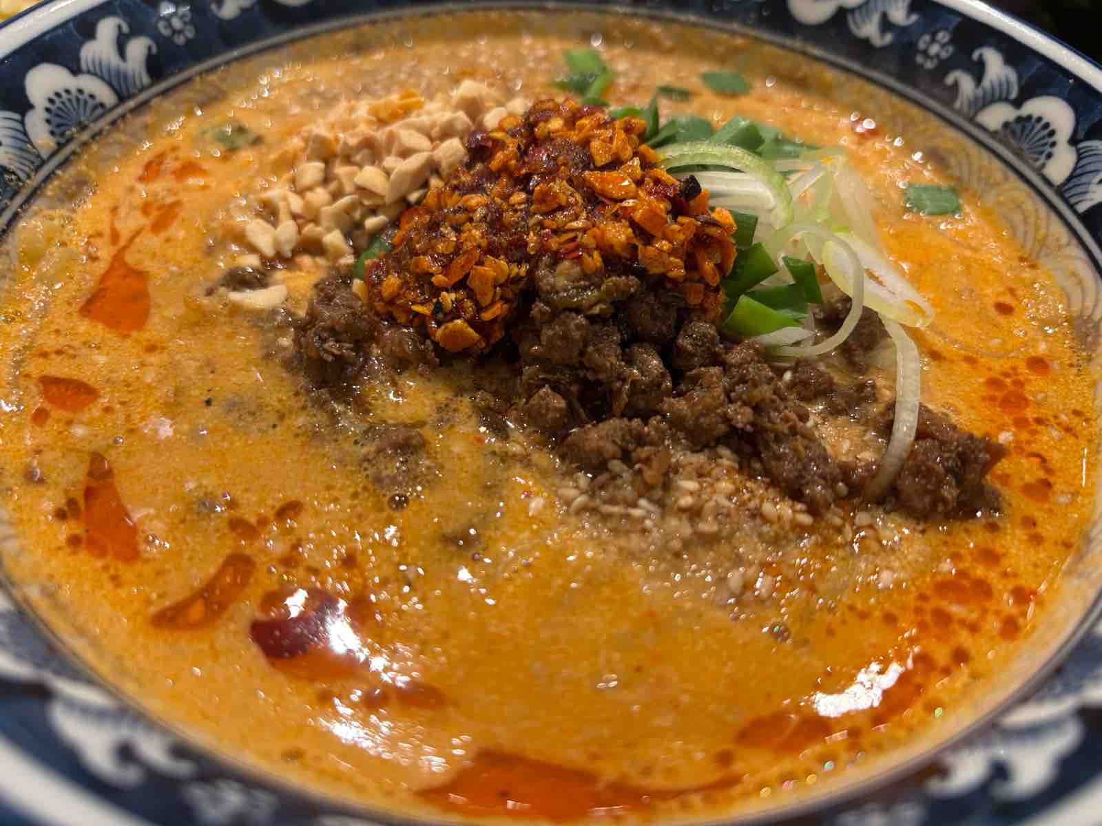 まずは「白ごま担々麺」。ゴマと芝麻醤たっぷりでクリーミーでリッチなスープに太麺がモッタリ絡む。ぶりぶりの挽き肉とナッツがいいアクセント。さすが“際コーポ”と唸るクオリティでとても美味しい。