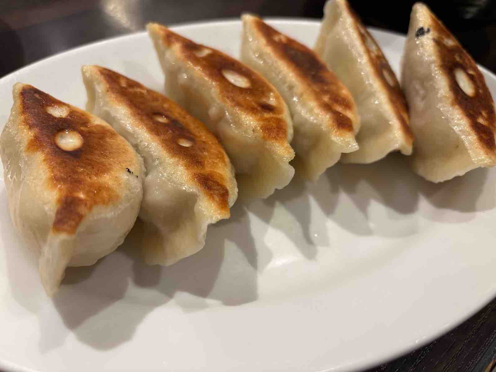 最後に「手打ちぷっくり餃子」。このお店の看板メニューのひとつ。モチッとした食べ応えのある皮に野菜と肉たっぷりの餡。モチモチ感と焼き目のパリッと感がジャストで、とても美味しい。