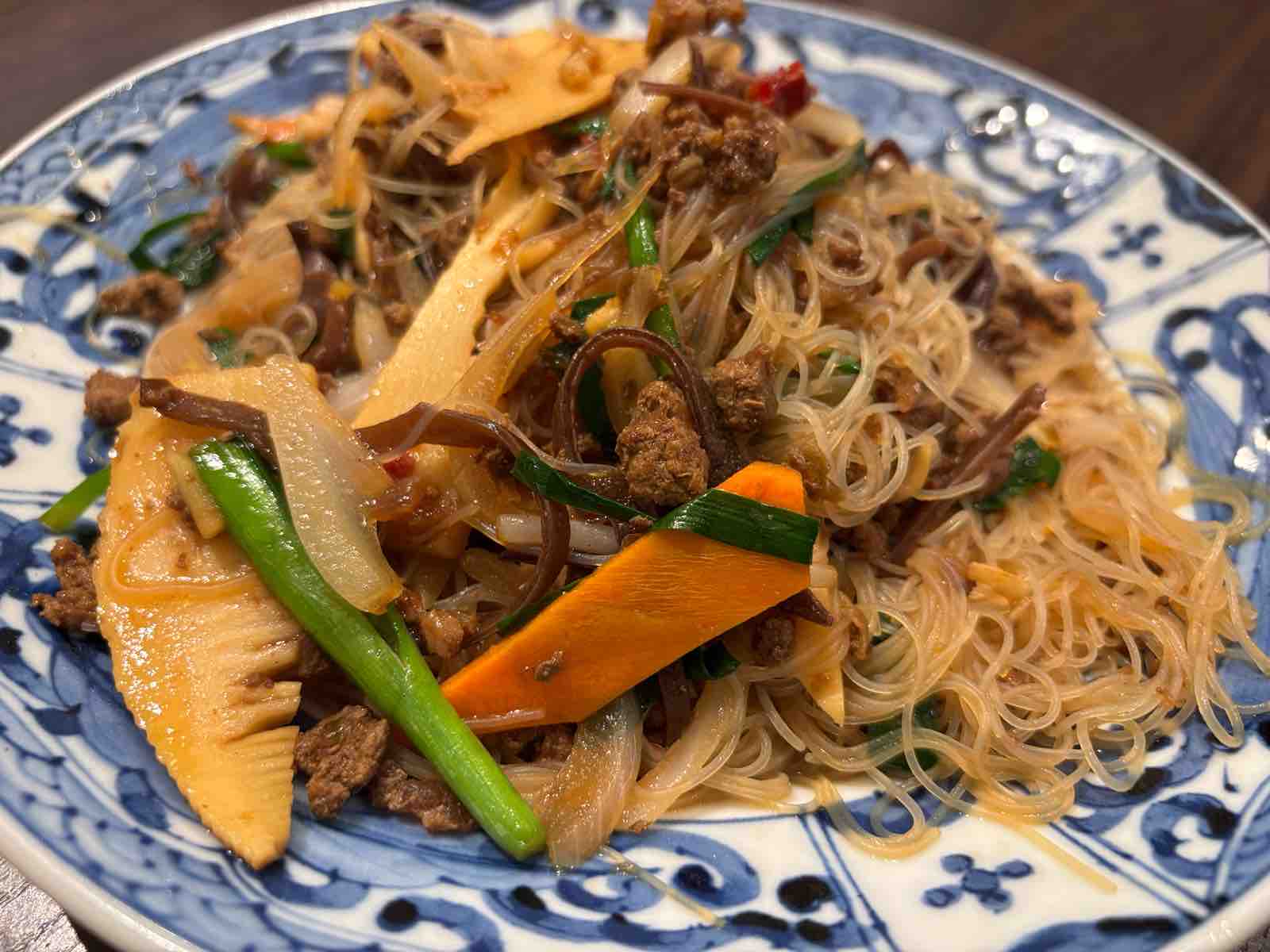 さらに「筍と牛肉のビーフン」。具材がたっぷりで、それぞれの仕上げが素晴らしい。程よい汁気がいい感じで全体に纏っている。