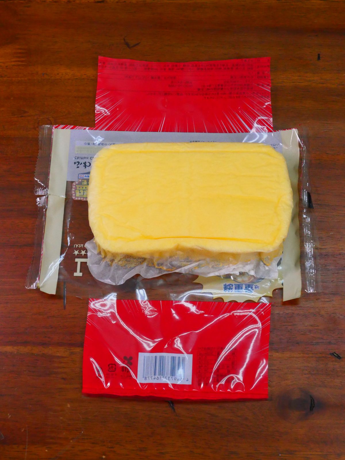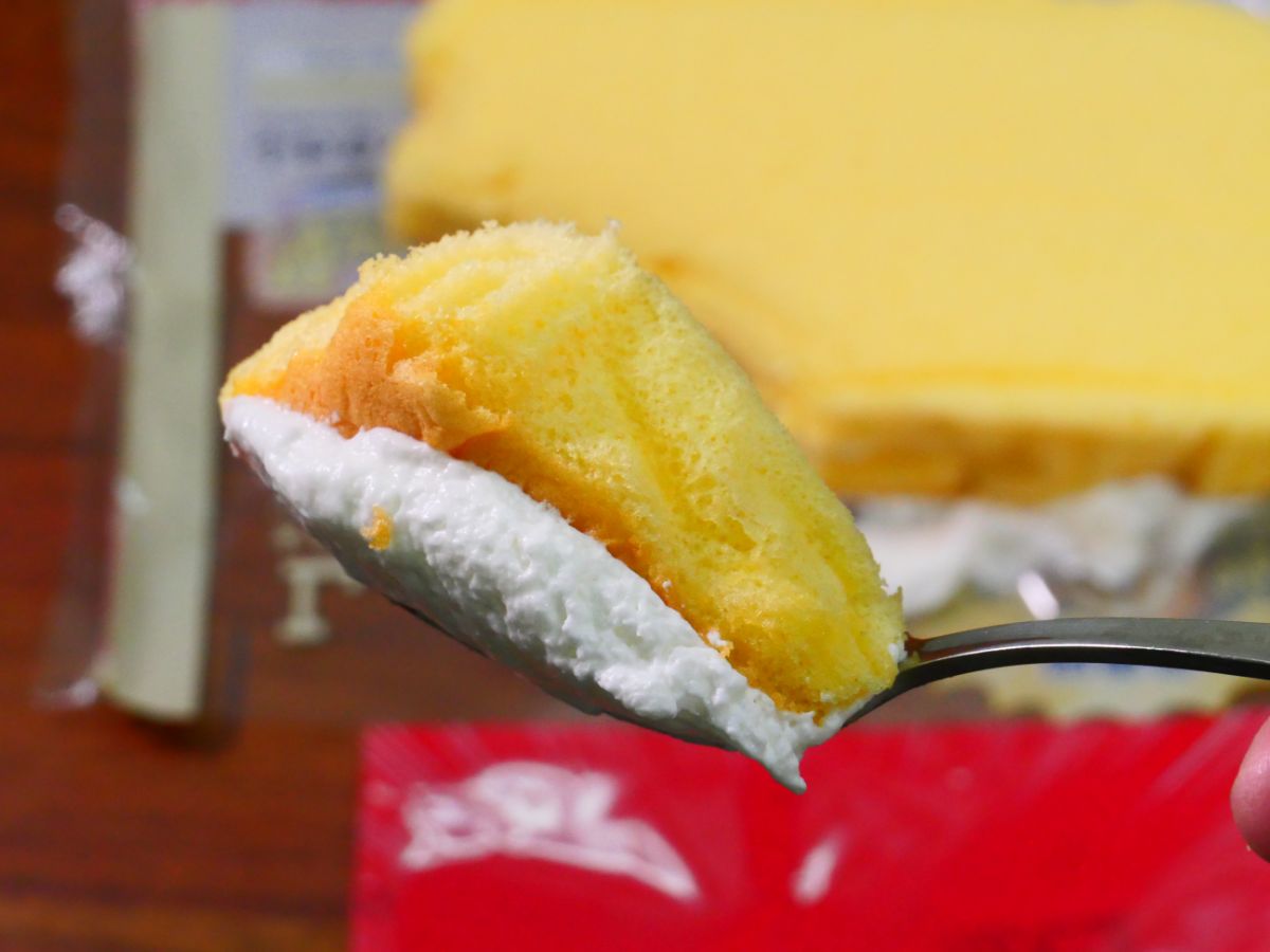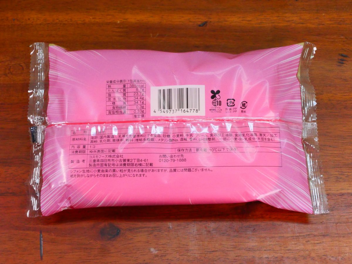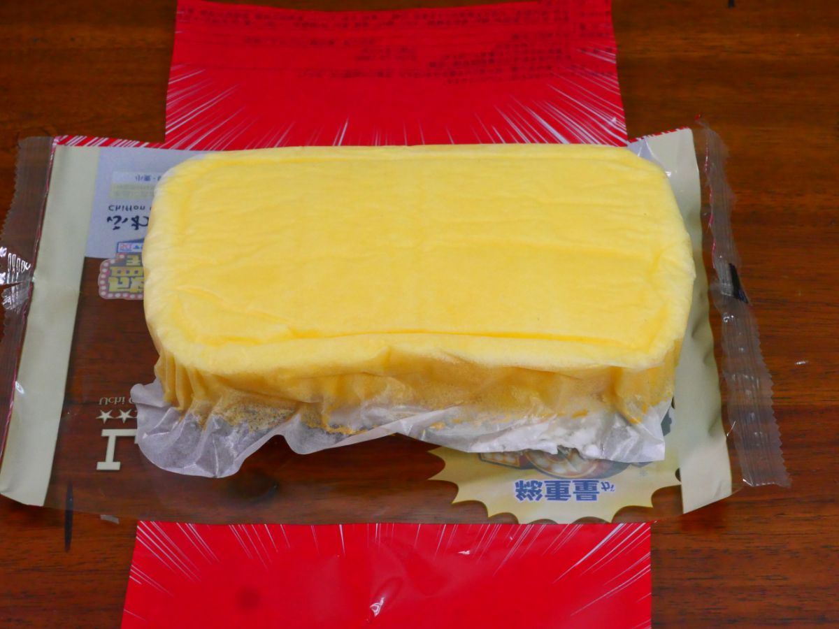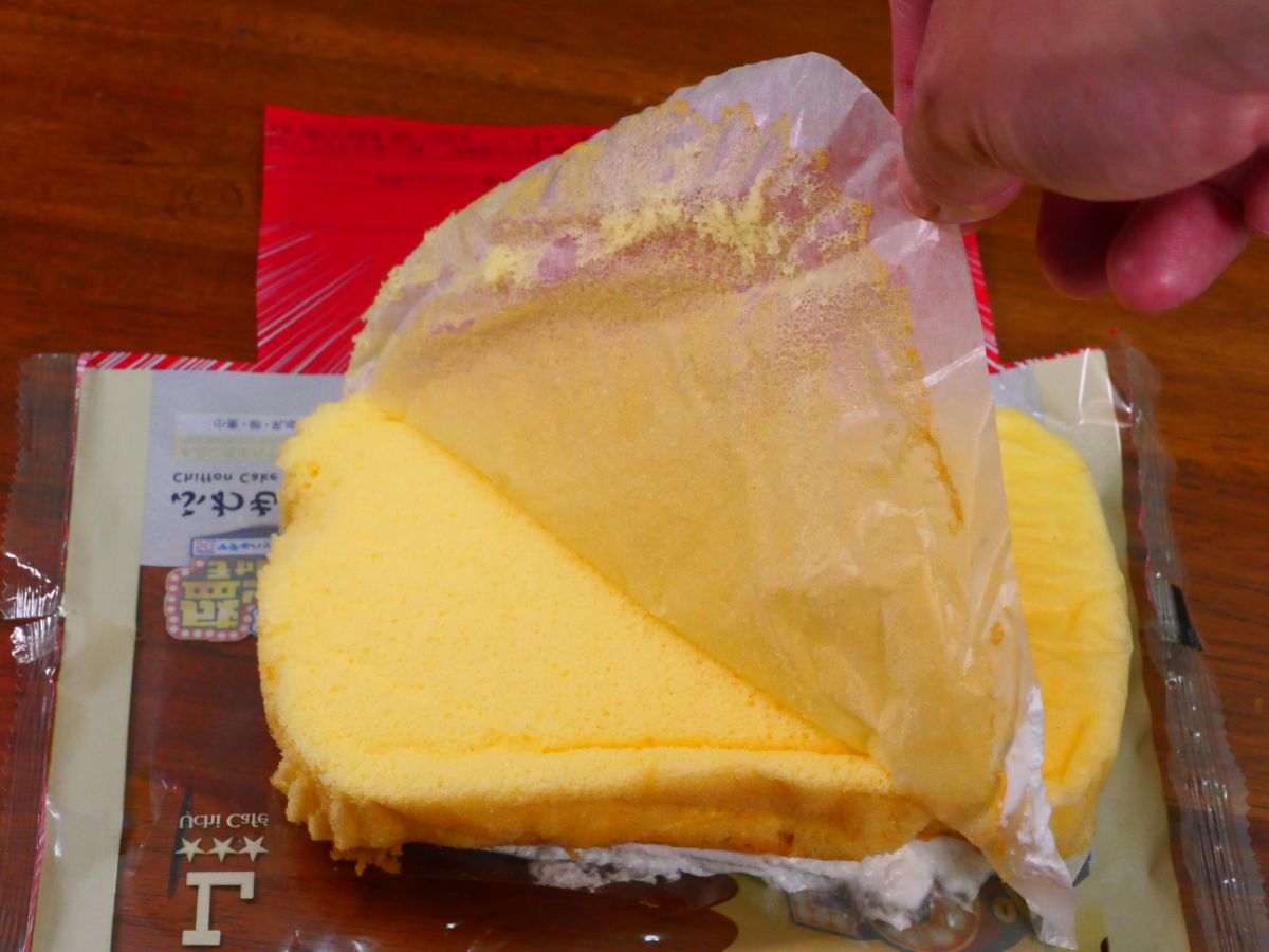 包装を開くようにカット。すると、ひっくり返った状態のスイーツが姿を現すので、シフォン生地を包んでいるシートをはがす。すると、クリームは見えないものの、甘い香りを放つシフォン生地があらわに。実にうまそうである。