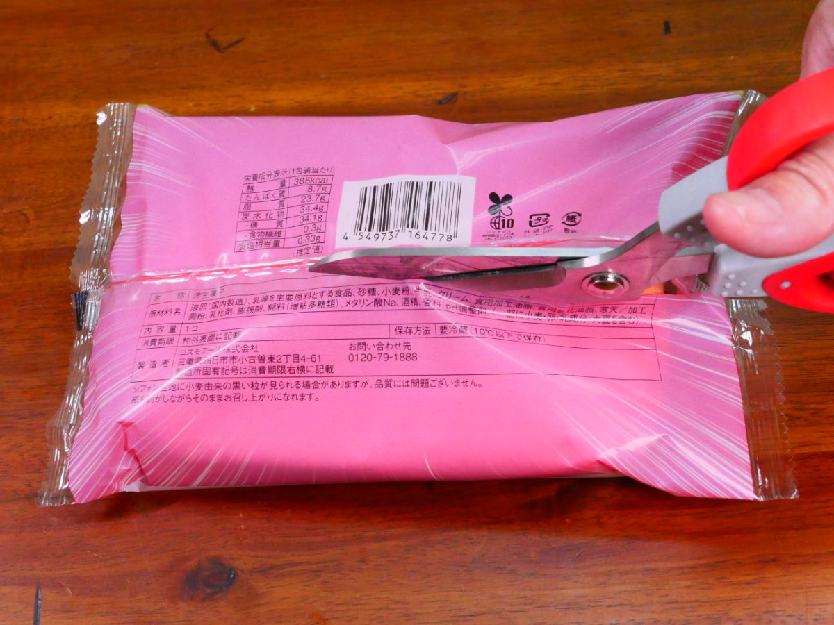 実際に試してみた。購入したスイーツをひっくり返して背面からハサミで切る。なかなか、松山ケンイチさんのように切ることが難しい。地味に難しい。松山ケンイチさん、器用すぎないか!?