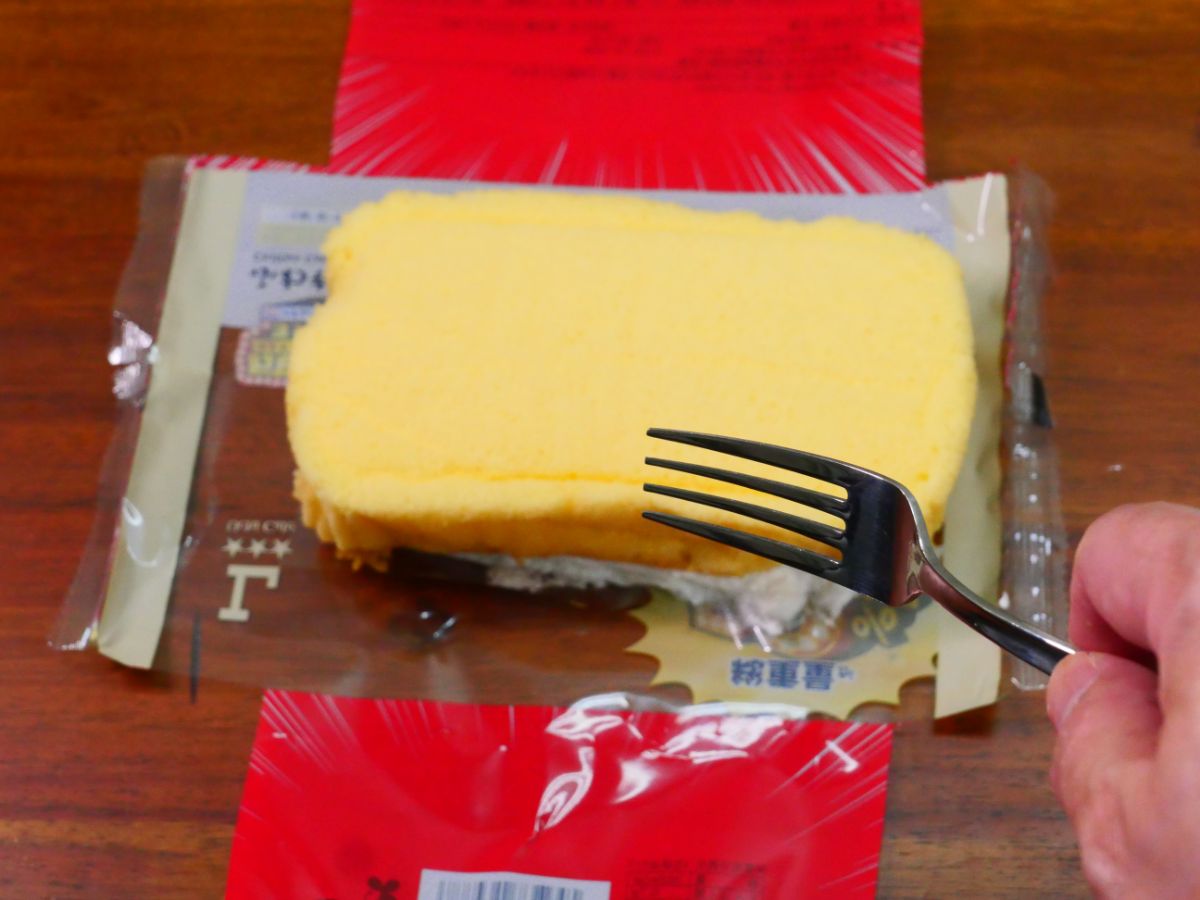 松山ケンイチさんの食べ方はこうだ。スイーツをひっくり返し、背面からハサミで包装を切って開封。「包装を破る」「スイーツを取り出す」ではなく、包装の四方を切って開く感じだ。あとは、ひっくり返っているスイーツをフォークで食べるだけ。