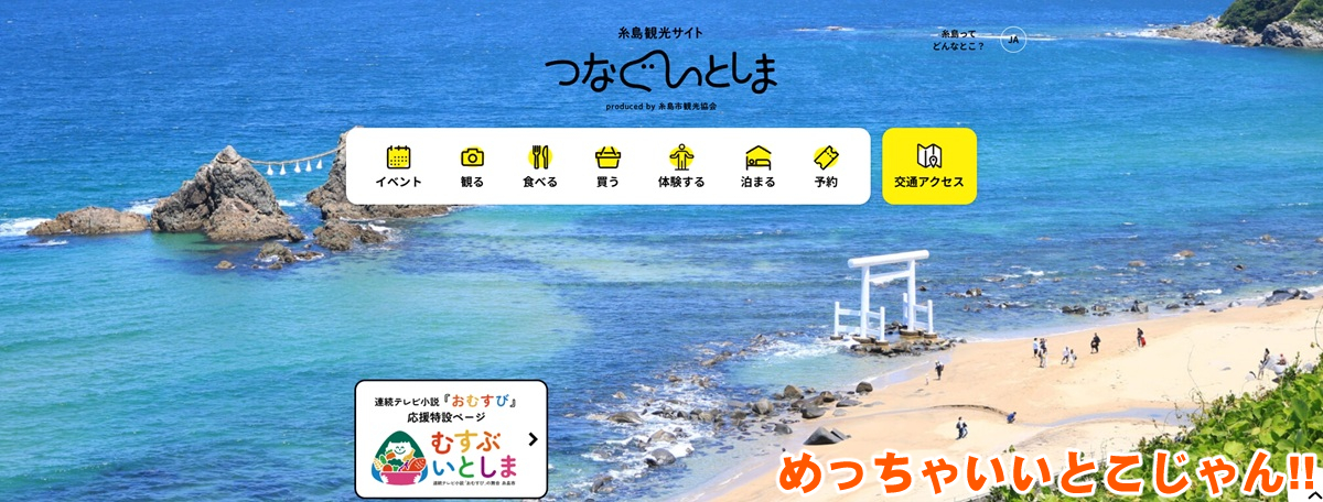 糸島市観光協会が運営するWebサイト“つなぐ糸島”では観光スポットや宿泊先などを知ることもでできる。