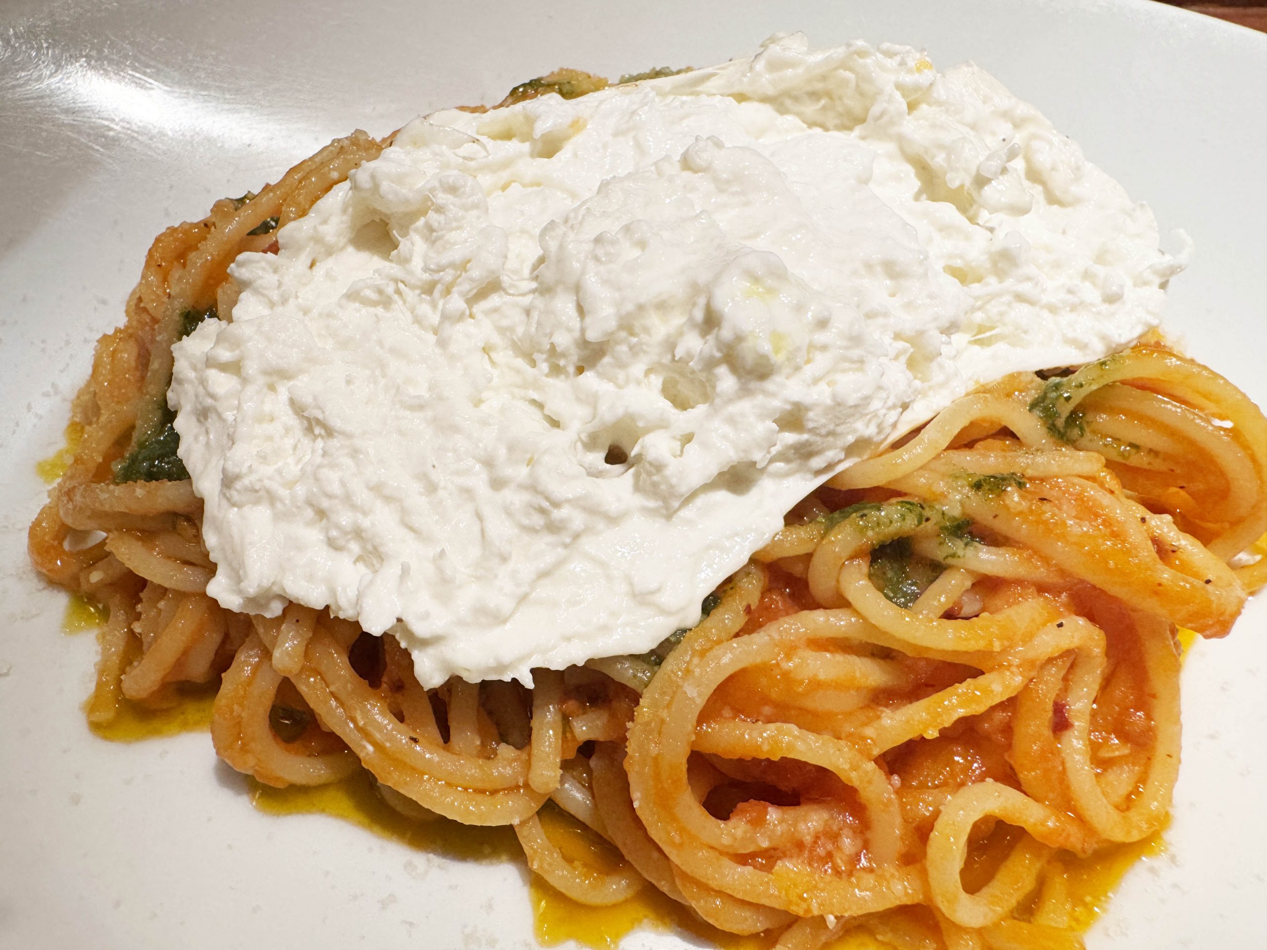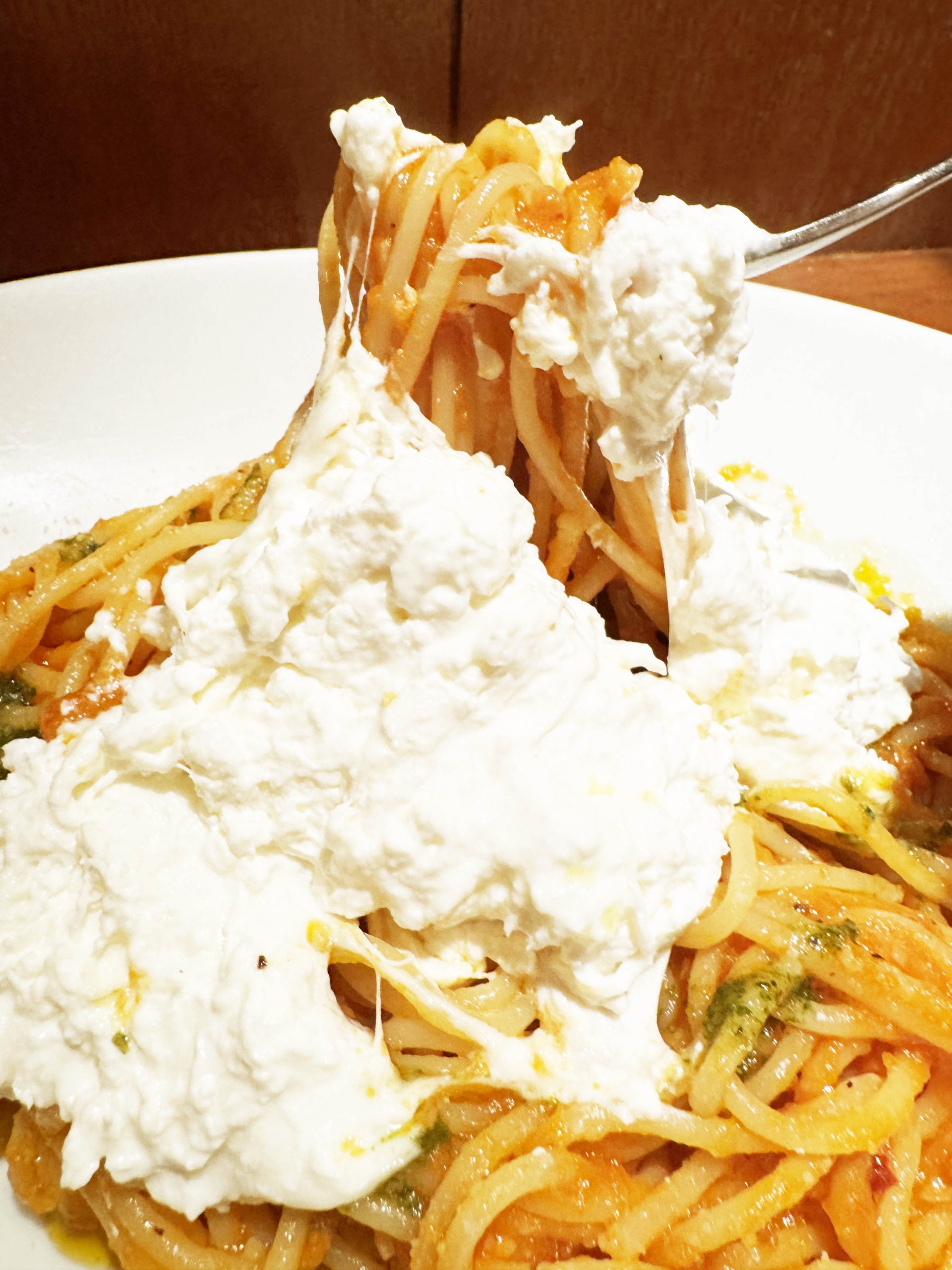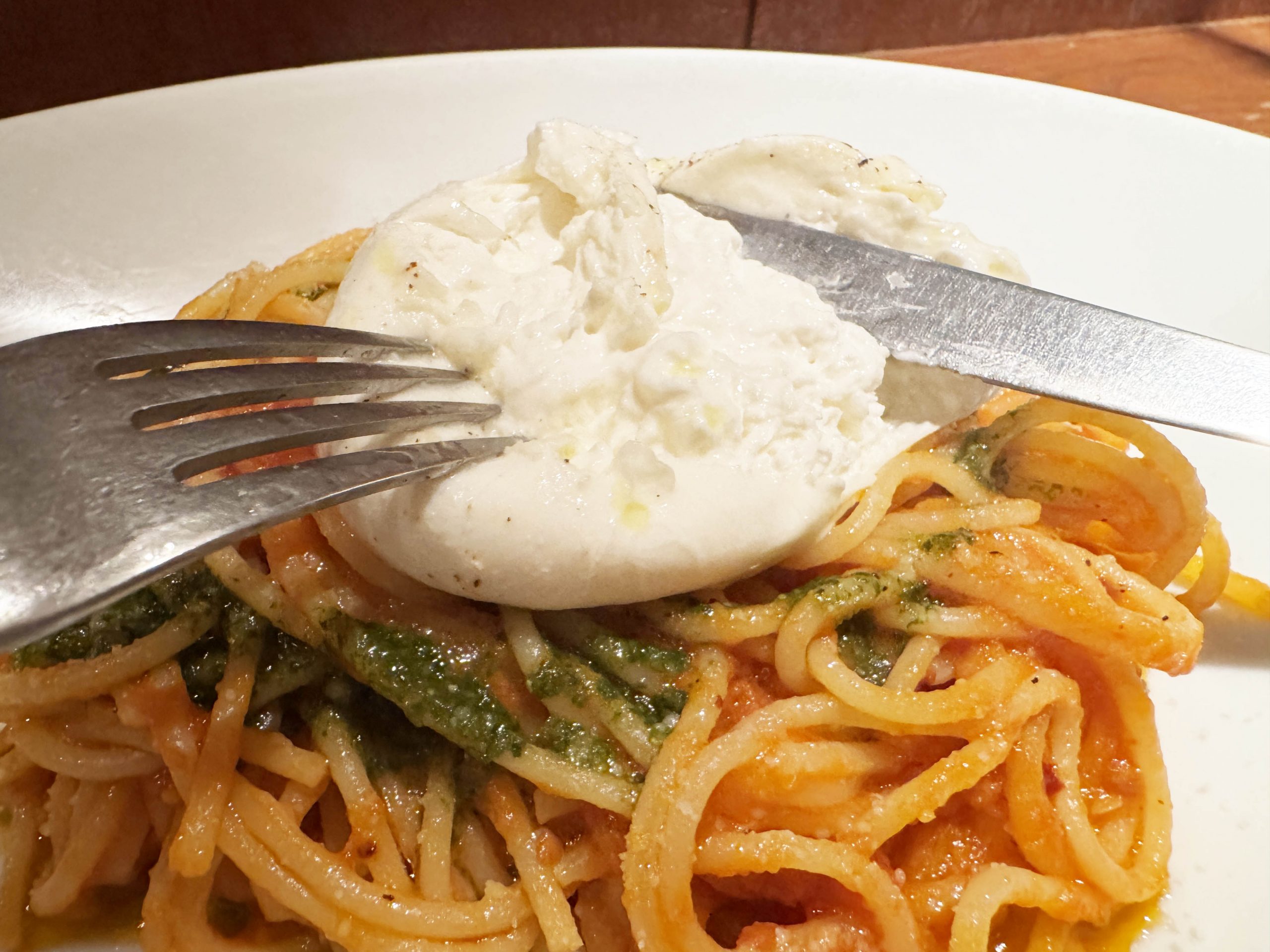 食べる。うまい。しみじみ、うまい。なにがうまいかって「ブッラータチーズがからまったパスタの薫り」がうまい。いや、薫りの意味には嗅覚だけでなく「味覚からの鼻を抜ける芳醇な空気」という意味。