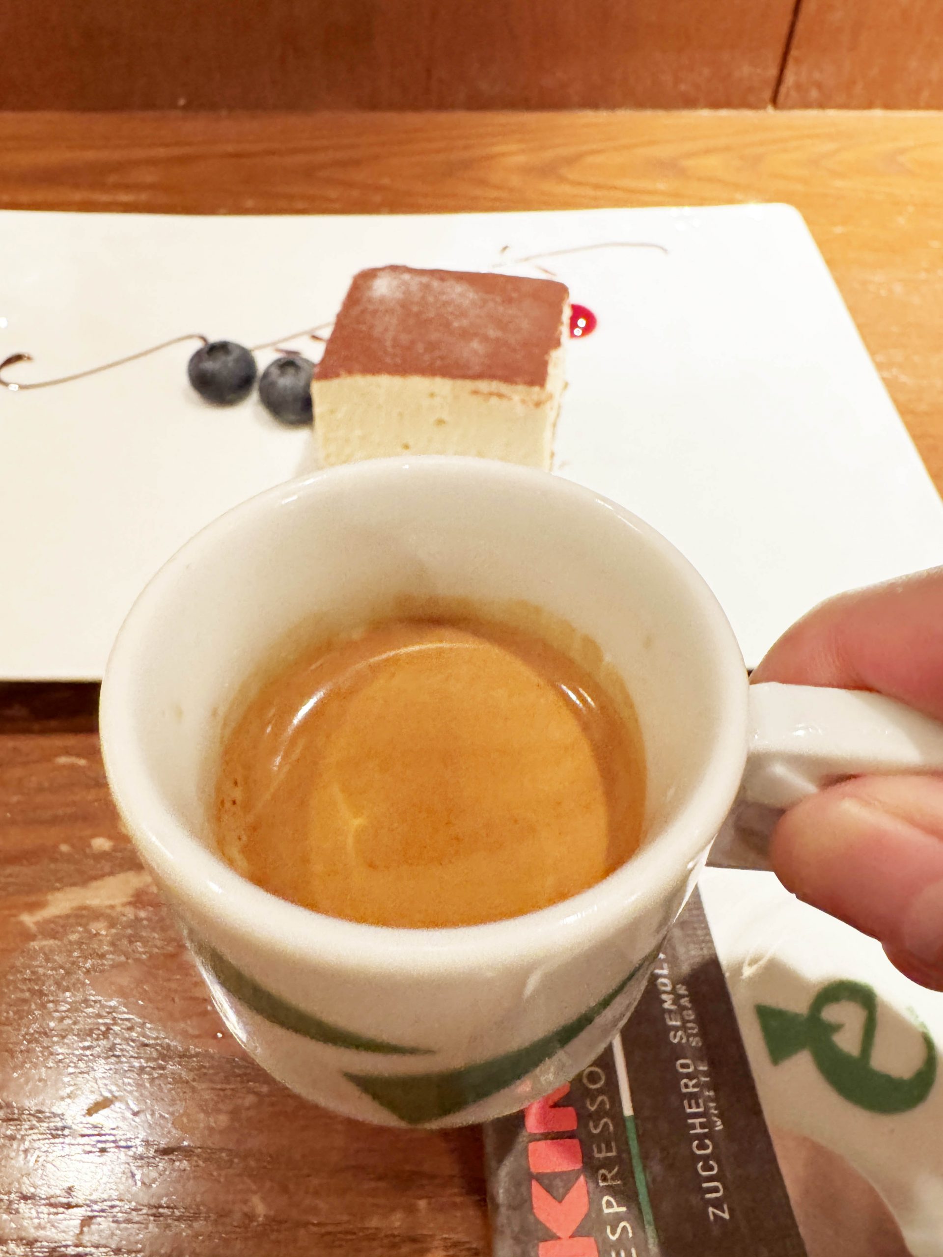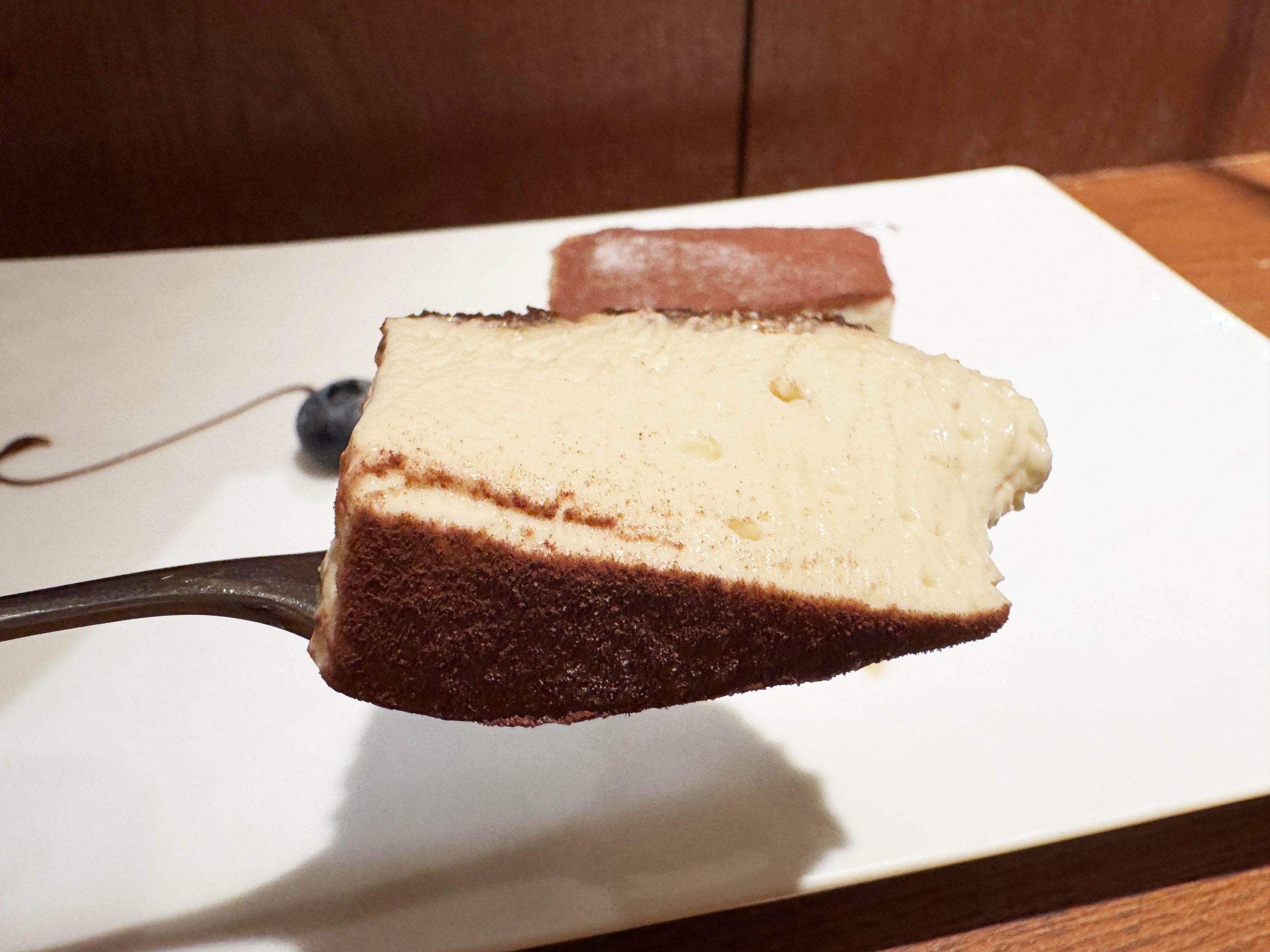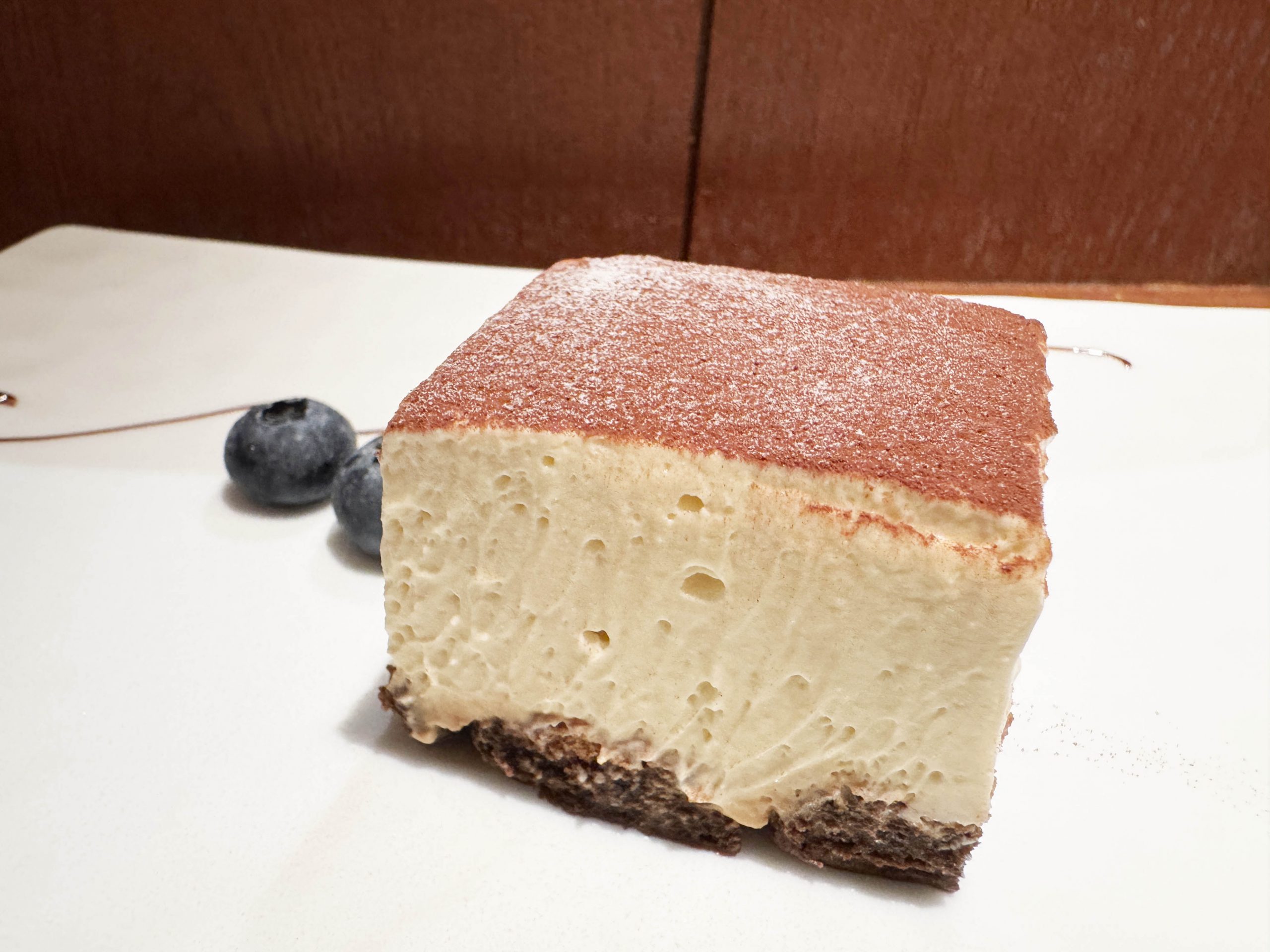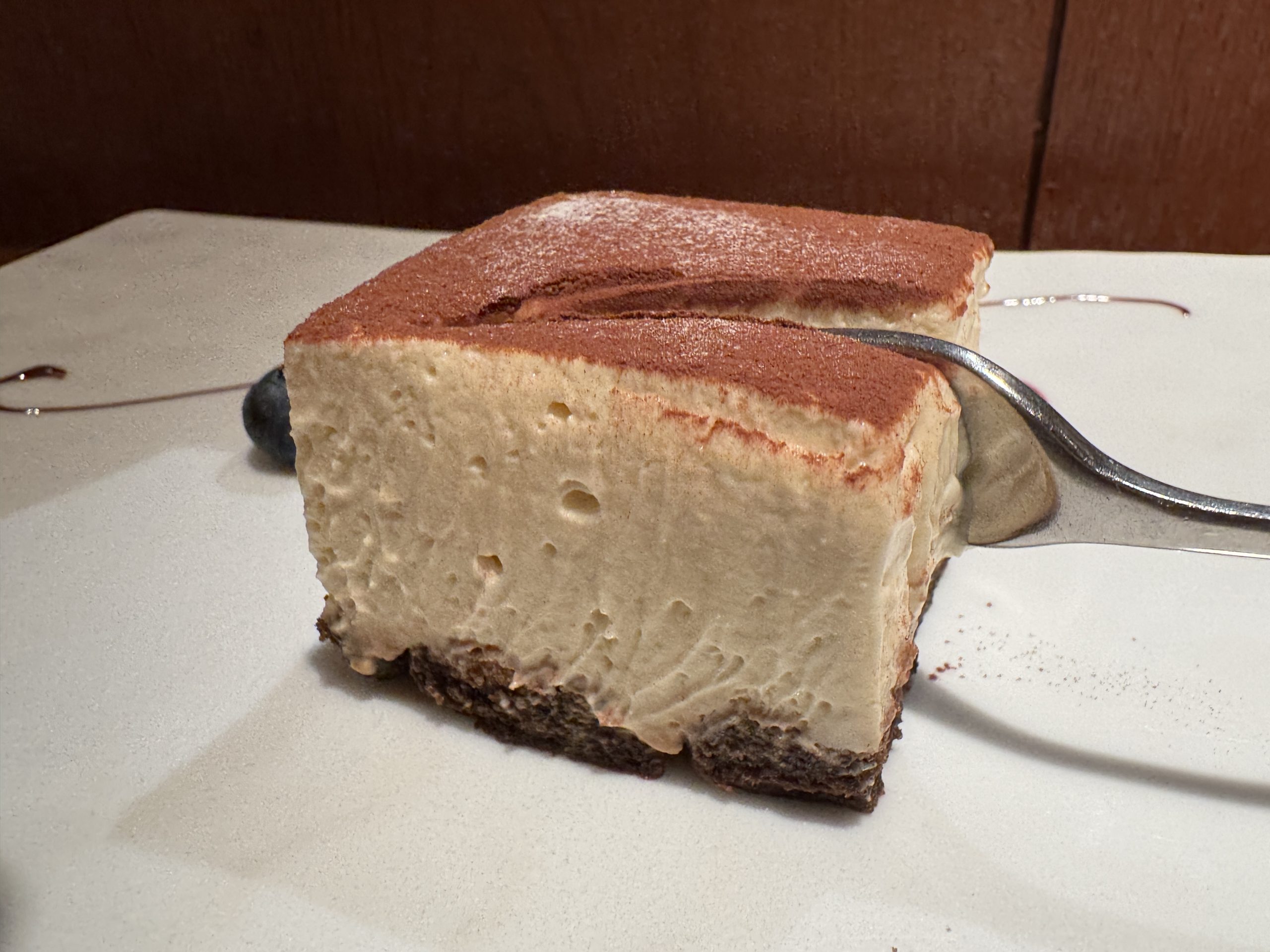 自家製ティラミスもステキだ。まるで平安京のように美しく整ったカットのティラミスは、スプーンを挿れると、やや強めの弾みを感じさせる。すくって食べると、強いコクと甘味を感じさせつつも、心地良い後味が尾を引く良きもの。